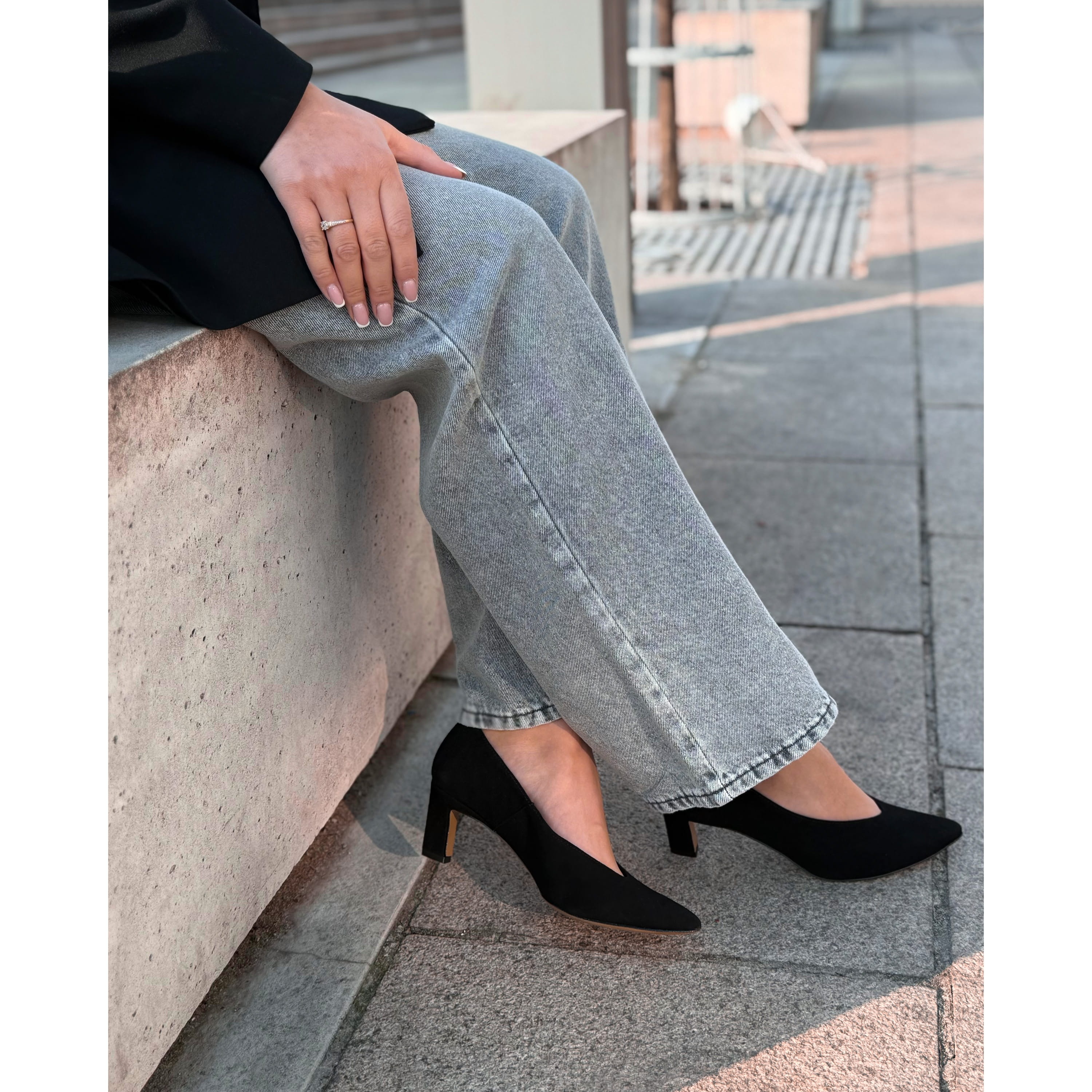Czarne zamszowe klasyczne czółenka na 6 cm obcasie typu kaczuszka. Obuwie wyprodukowano z naturalnej skóry zamszowej. Przód buta w szpic. Obuwie wyróżnia się estetycznie wyciętą cholewką, która dodaje elegancji. Tęgość czółenek standardowa. Wkładka wykonana jest ze skóry naturalnej. Czółenka sprawdzą się na każdą okazję. Wymiary podawane na kartach produktów to wymiary orientacyjne i odnoszą się do rozmiaru 37.