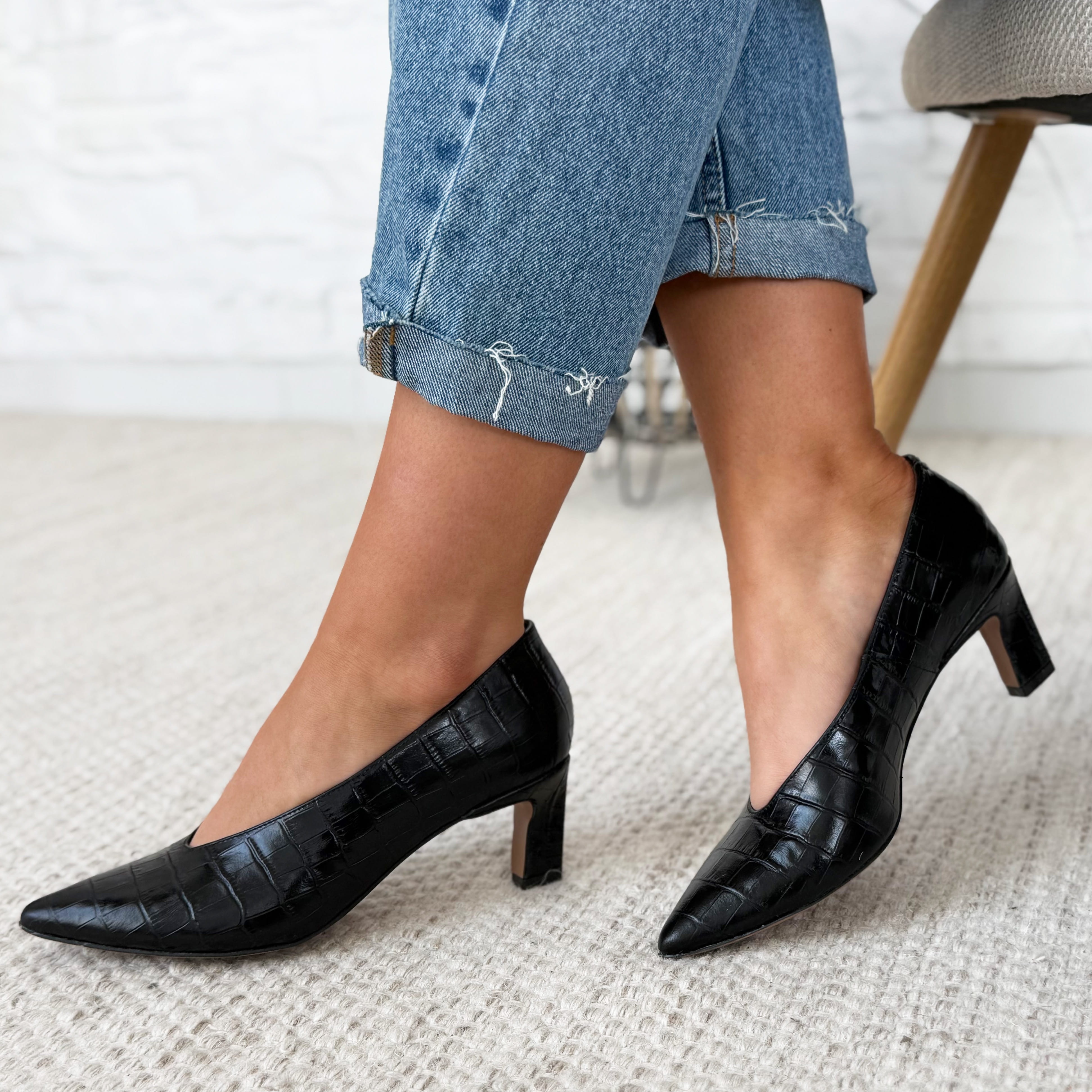Czarne skórzane klasyczne czółenka na 6 cm obcasie typu kaczuszka. Obuwie wykonano ze skóry naturalnej imitującej skórę krokodyla. Przód buta w szpic. Obuwie wyróżnia się estetycznie wyciętą cholewką, która dodaje elegancji. Tęgość czółenek standardowa. Wkładka wykonana jest ze skóry naturalnej. Czółenka sprawdzą się na każdą okazję. Wymiary podawane na kartach produktów to wymiary orientacyjne i odnoszą się do rozmiaru 37.