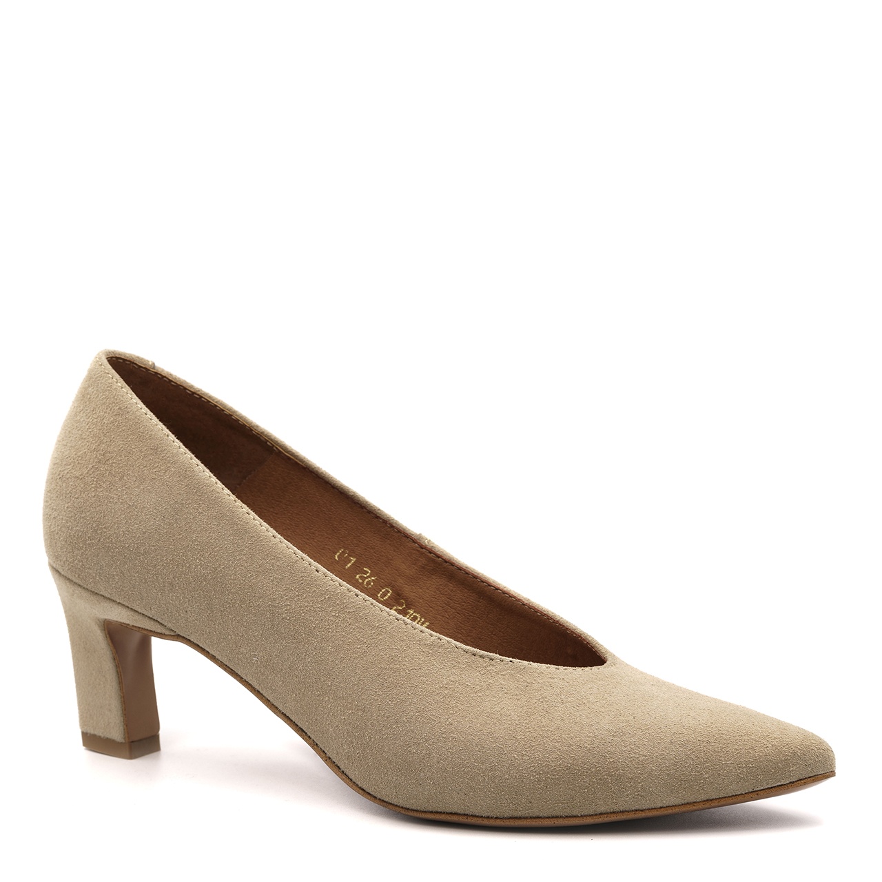 Beżowe zamszowe klasyczne czółenka na 6 cm obcasie typu kaczuszka. Obuwie wyprodukowano z naturalnej skóry zamszowej. Przód buta w szpic. Obuwie wyróżnia się estetycznie wyciętą cholewką, która dodaje elegancji. Tęgość czółenek standardowa. Wkładka wykonana jest ze skóry naturalnej. Czółenka sprawdzą się na każdą okazję. Wymiary podawane na kartach produktów to wymiary orientacyjne i odnoszą się do rozmiaru 37.