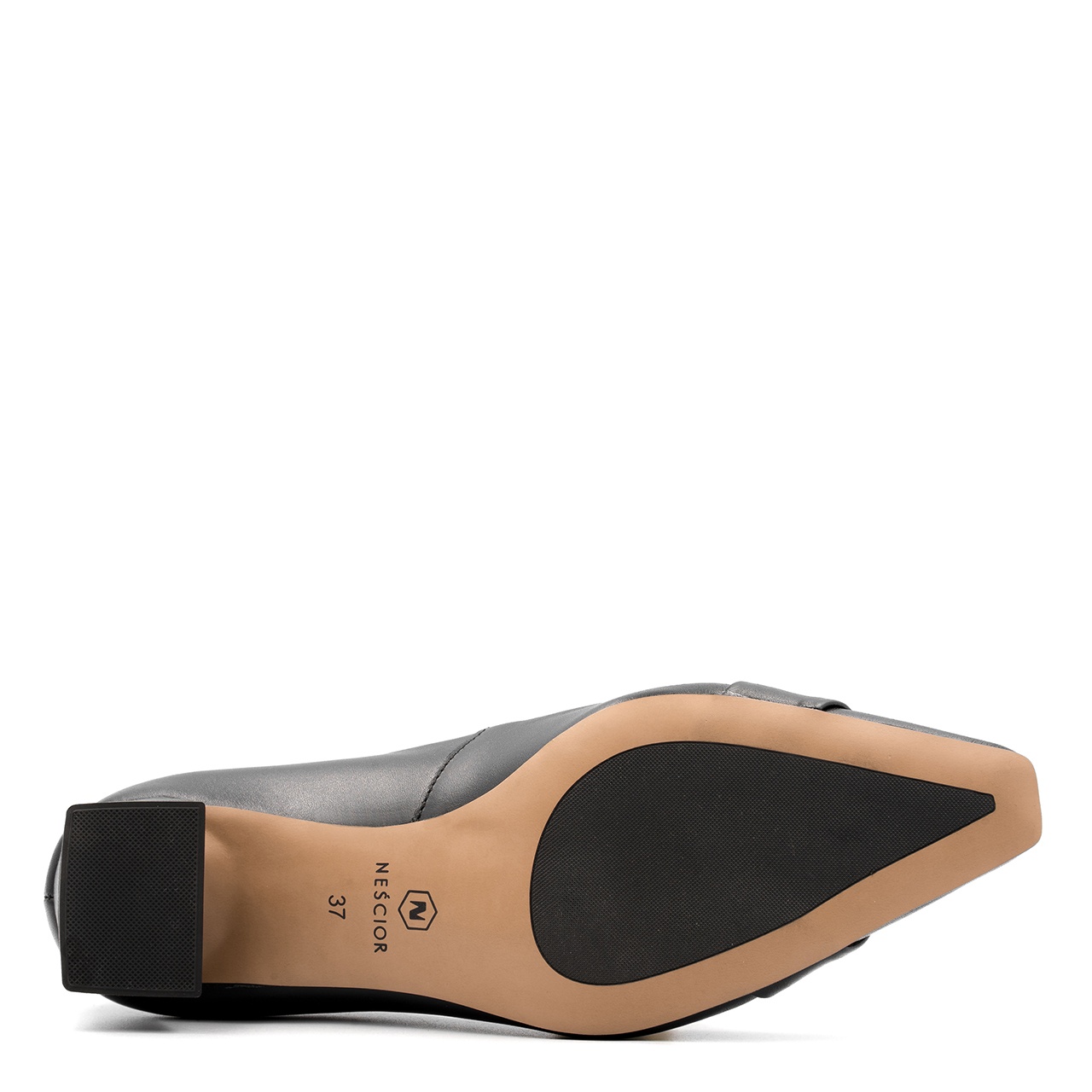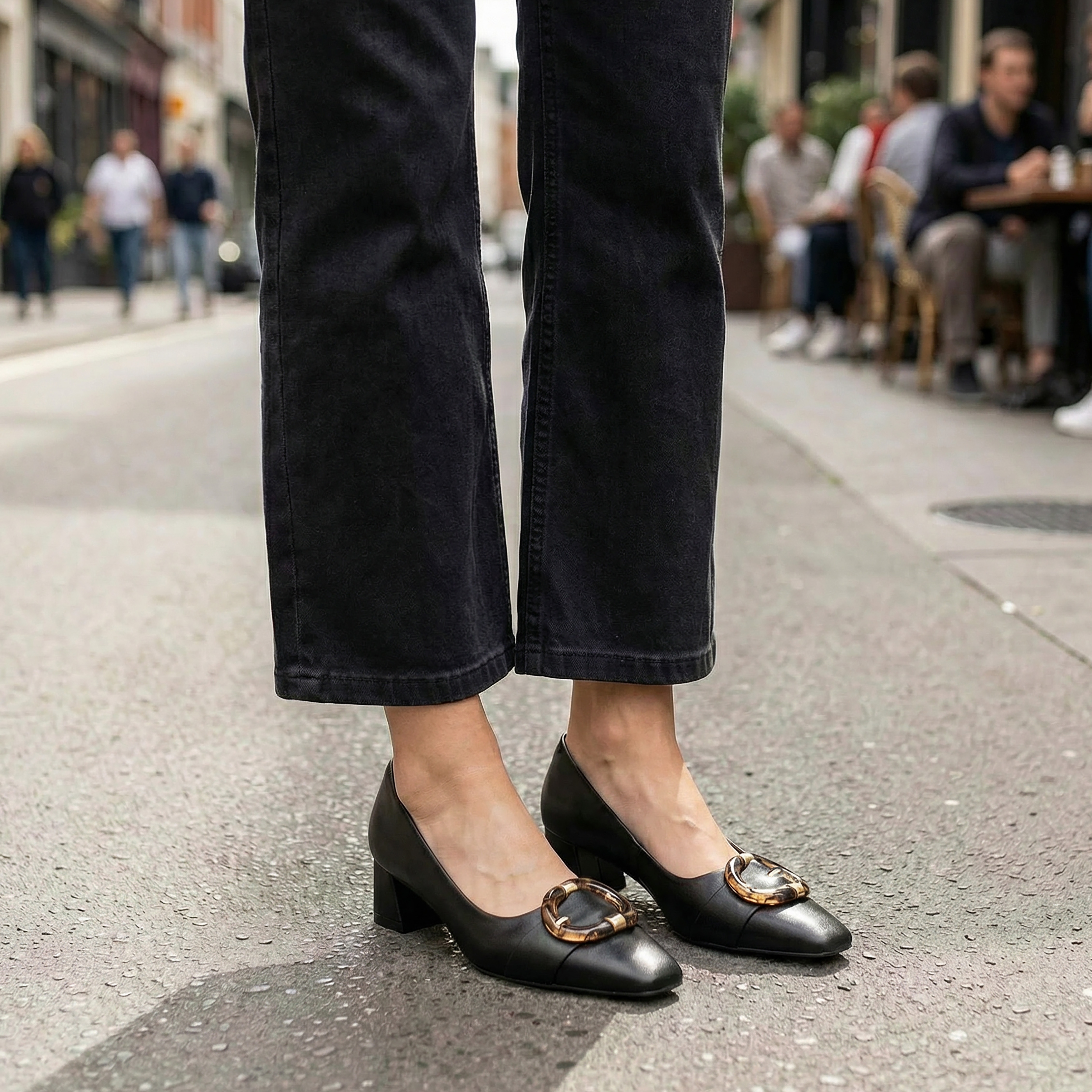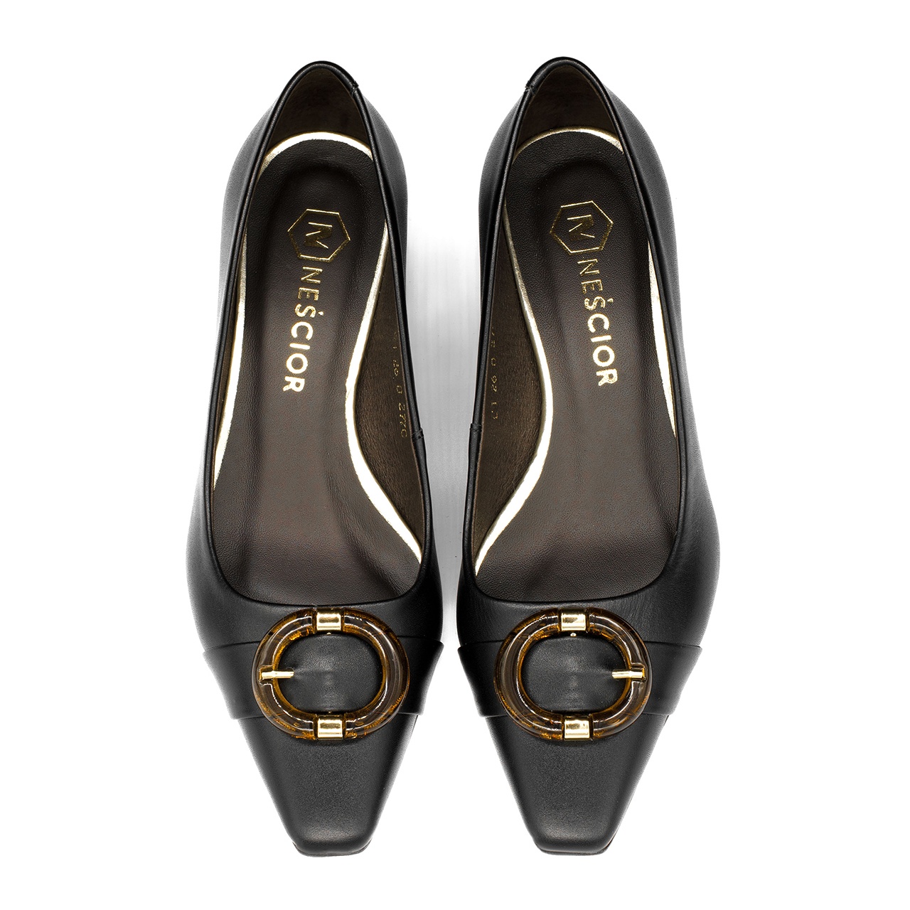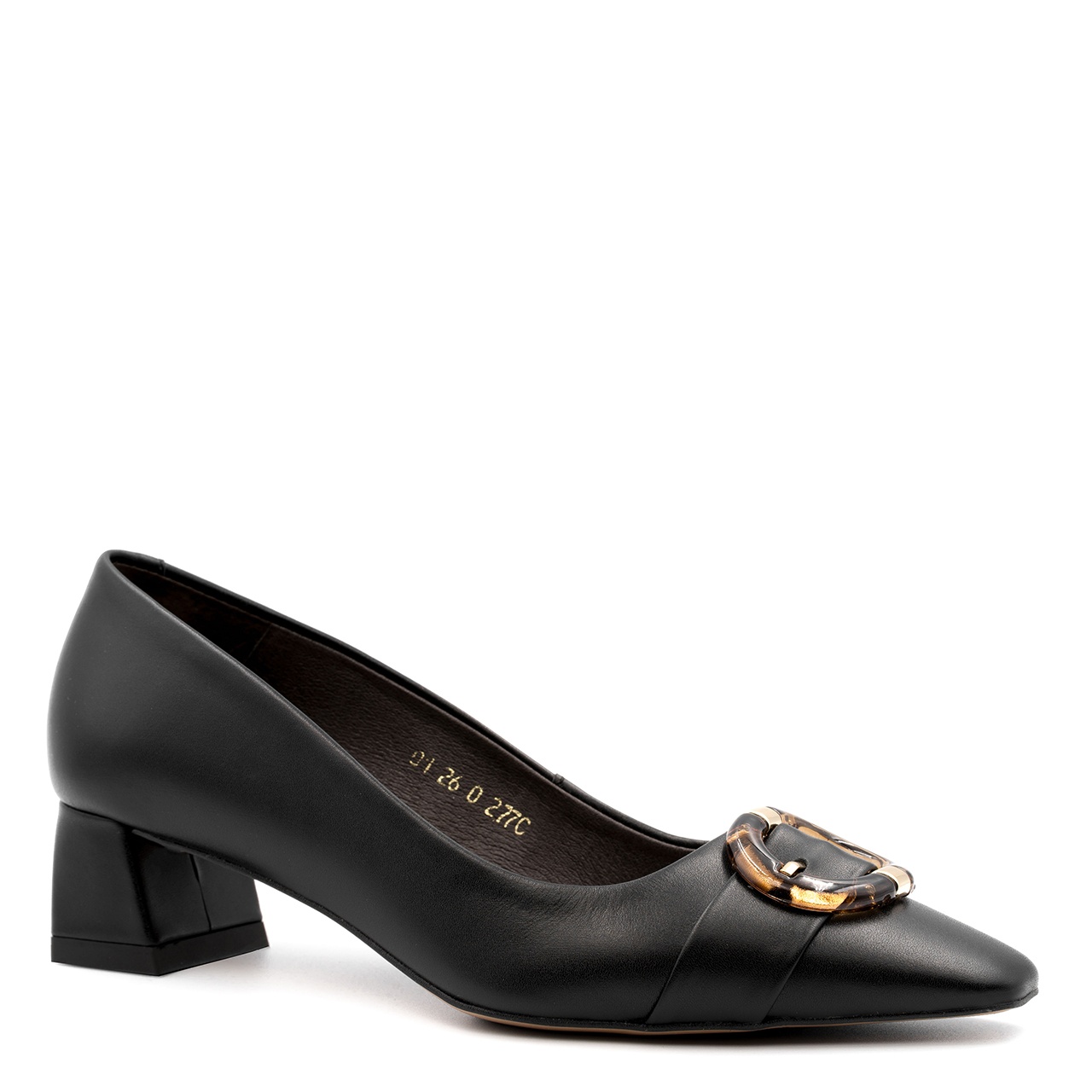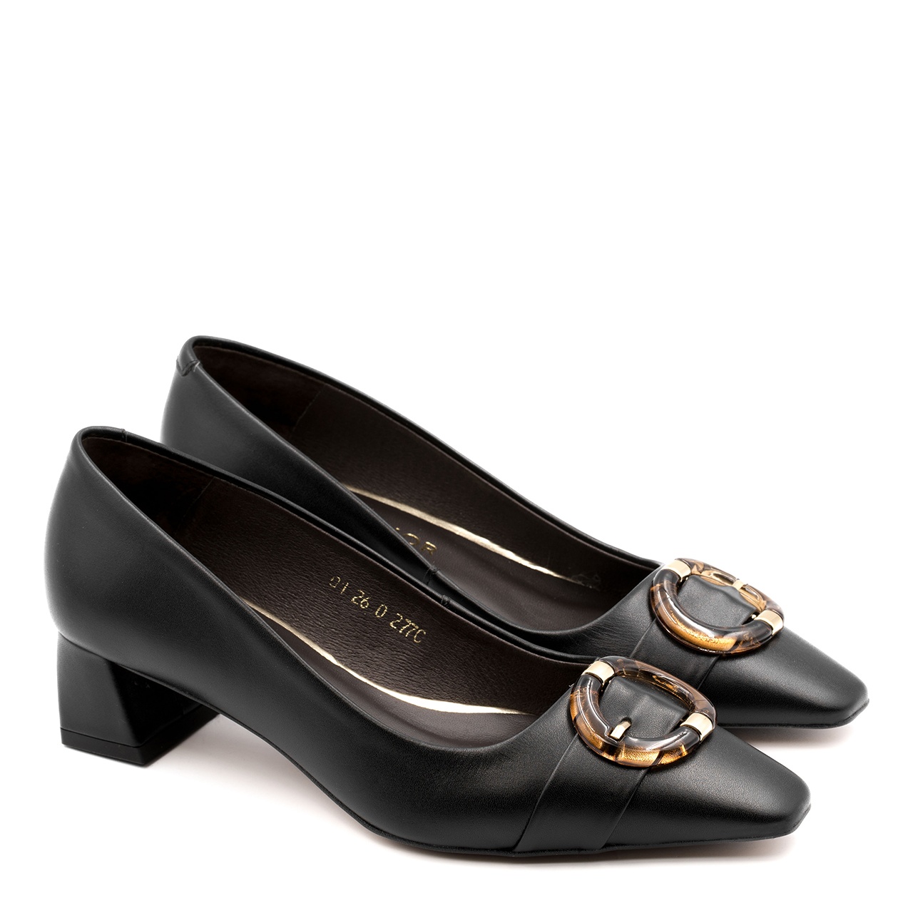 Czarne klasyczne czółenka z noskiem w kwadrat to idealny wybór dla Pań ceniących sobie wygodę i ponadczasowy styl. Czółenka wykonano ze skóry licowej. Główną rolę gra pasek z bursztynową ozdobą. Obcas wynosi około 4 cm. Wkładka w butach jest wykonana ze skóry. Czółenka posiadają podeszwę z tuniskóru z topem antypoślizgowym. Tęgość butów standardowa. Wymiary podawane na kartach produktów to wymiary orientacyjne i odnoszą się do rozmiaru 37.