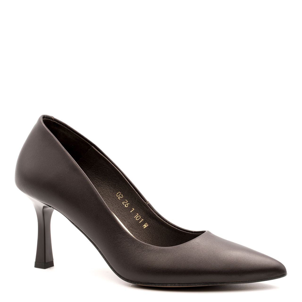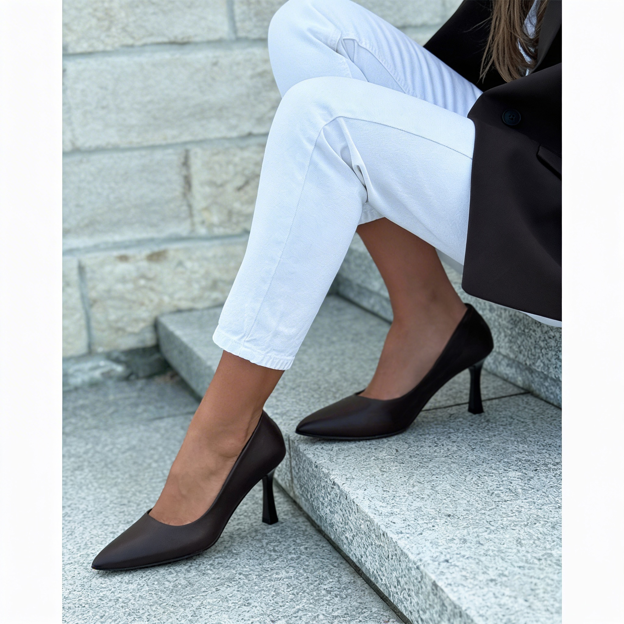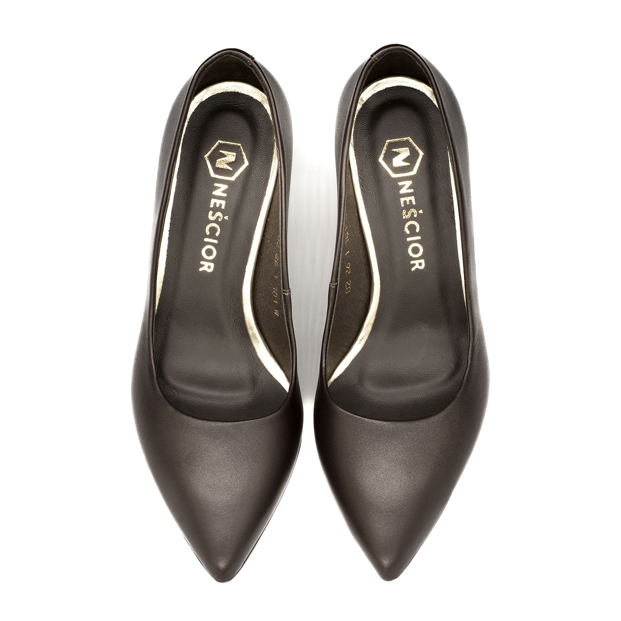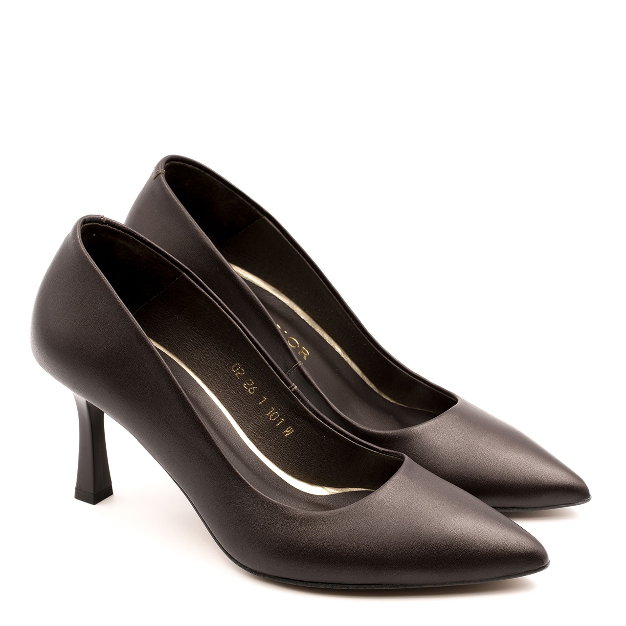 Czekoladowe skórzane czółenka na 8 cm obcasie. Obuwie wykonano ze skóry naturalnej licowej. Nosek butów w szpic. Wkładka w butach jest skórzana. Niezwykle wygodne buty do codziennego użytkowania, a także na specjalne okazje. Tęgość butów standardowa. Wymiary podawane na kartach produktów to wymiary orientacyjne i odnoszą się do rozmiaru 37.