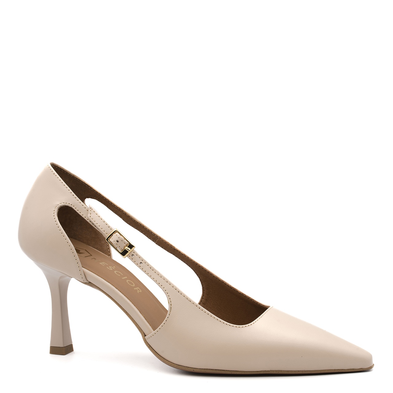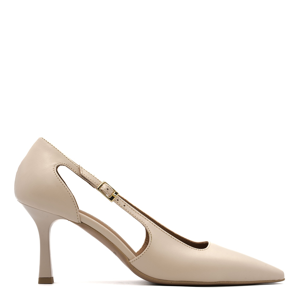 Beżowe czółenka z delikatnie kwadratowym noskiem. Czółenka wykonano ze skóry licowej. Główną rolę grają wycięcia po bokach. Szpilka w czółenkach wynosi około 8 cm. Wkładka w butach jest wykonana ze skóry. Czółenka posiadają podeszwę z tuniskóru z topem antypoślizgowym. Tęgość butów standardowa. Rozmiarówka w tym modelu jest zawyżona - zalecamy wybór mniejszego rozmiaru. Wymiary podawane na kartach produktów to wymiary orientacyjne i odnoszą się do rozmiaru 37.