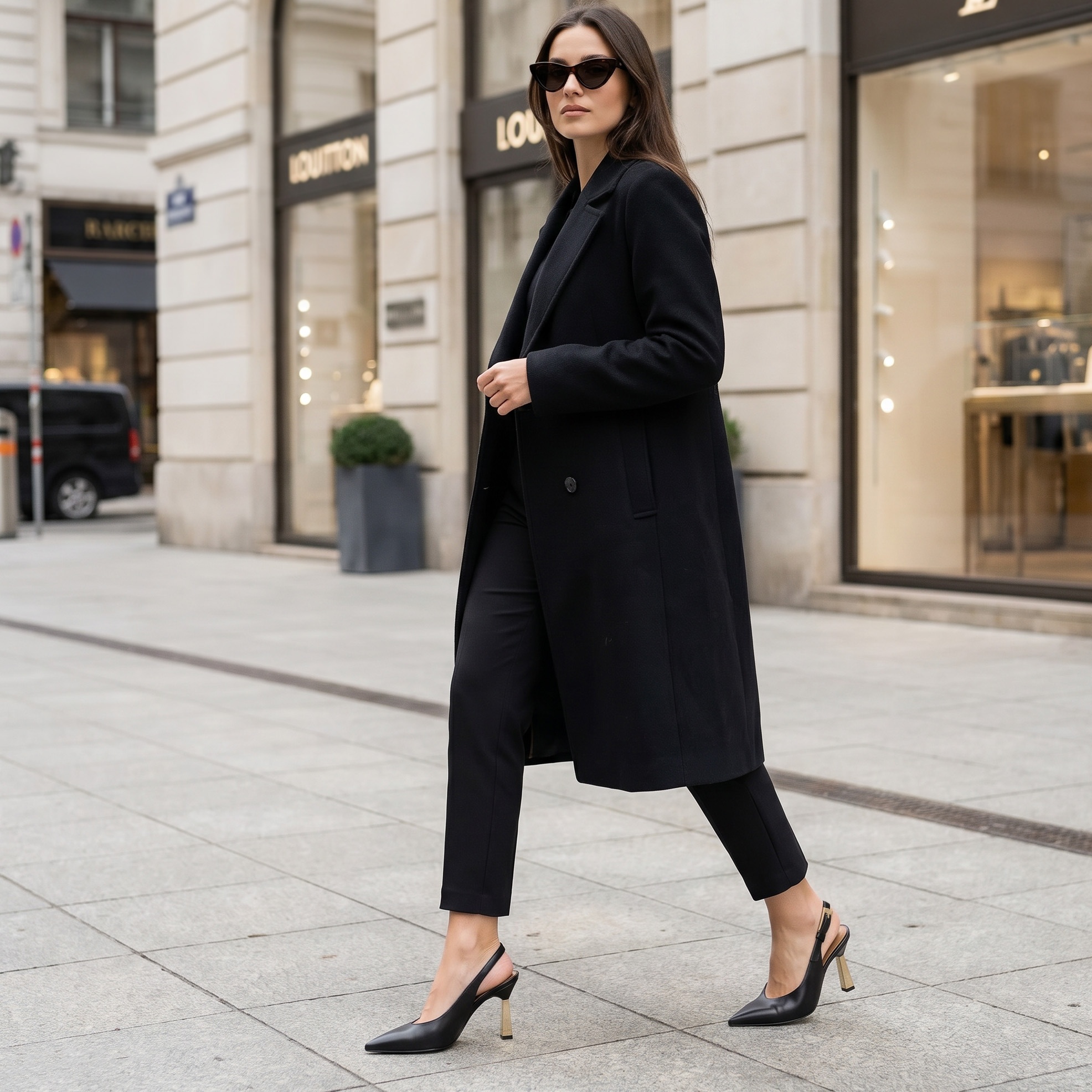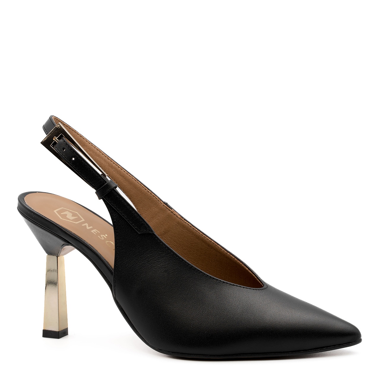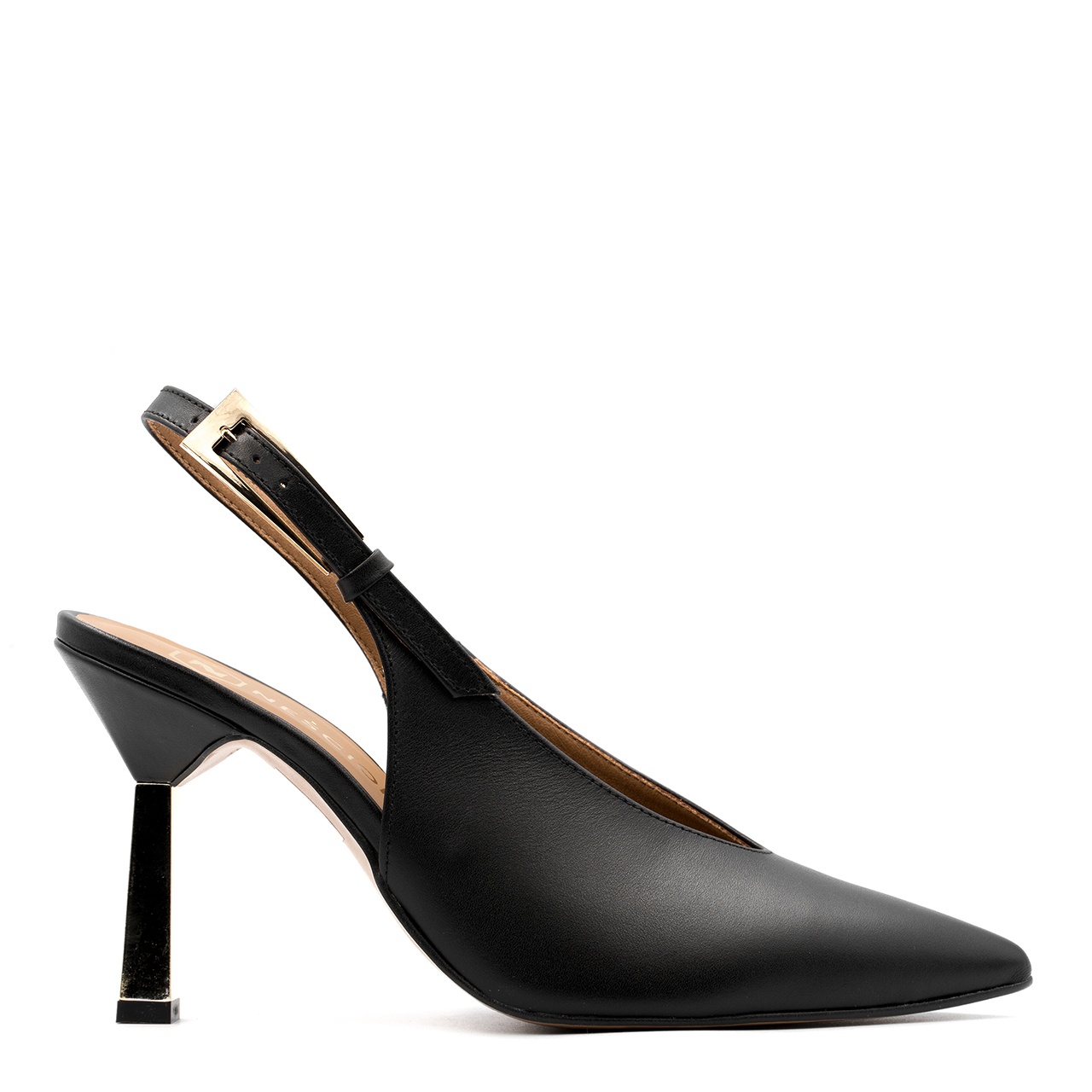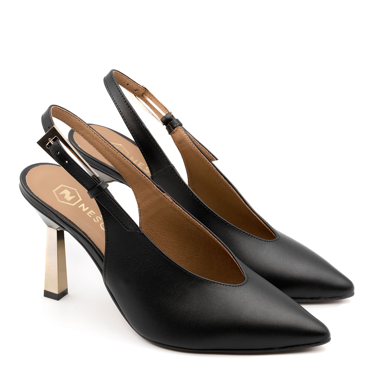 Czarne skórzane czółenka bez pięty na lustrzanej 9 cm szpilce w kolorze złotym. Obuwie wykonano z naturalnej skóry licowej. Buty wyróżniają się dużą klamrą prostokątną w kolorze złotym. Nosek butów w szpic. Wkładki w butach są skórzane. Wymiary podawane na kartach produktów to wymiary orientacyjne i odnoszą się do rozmiaru 37.