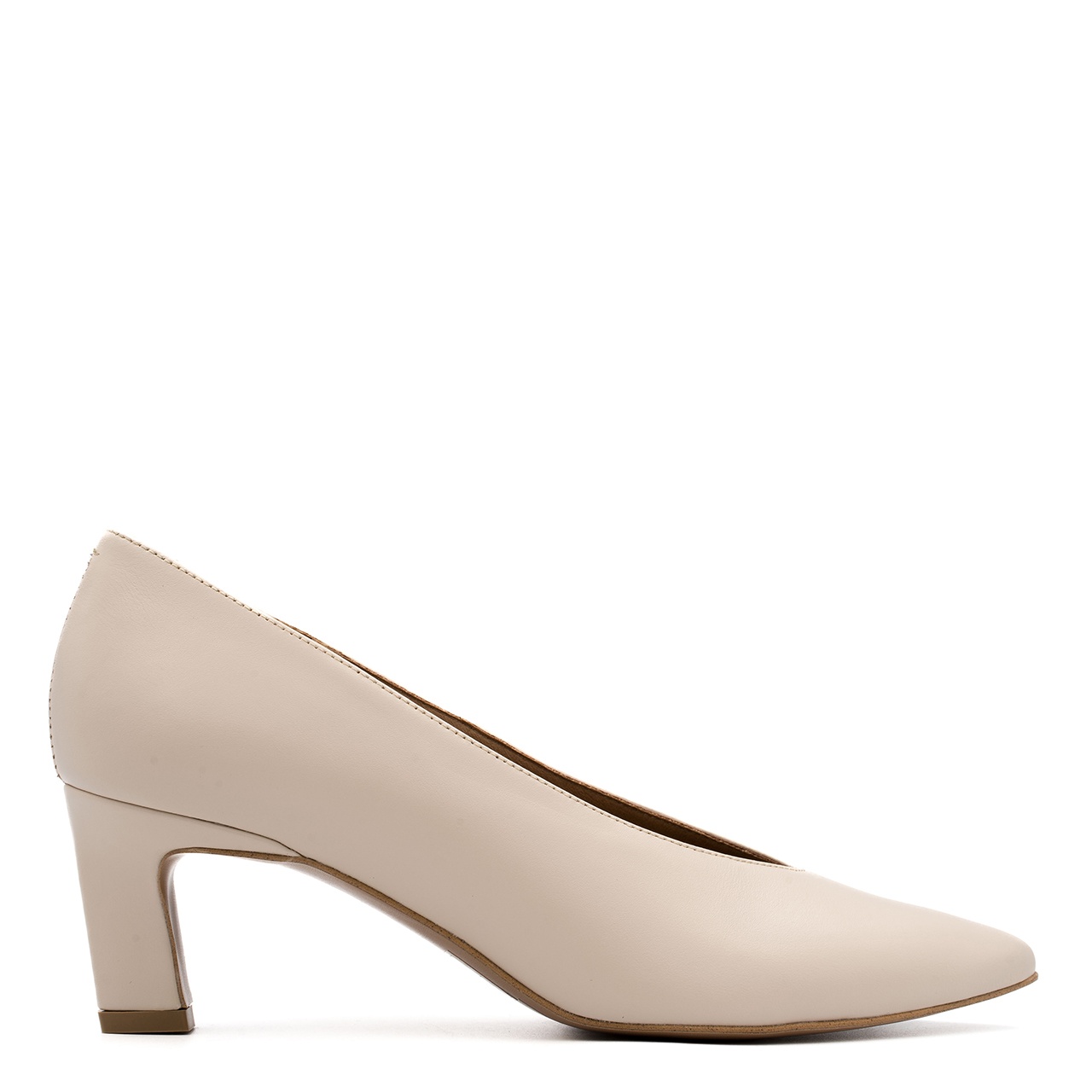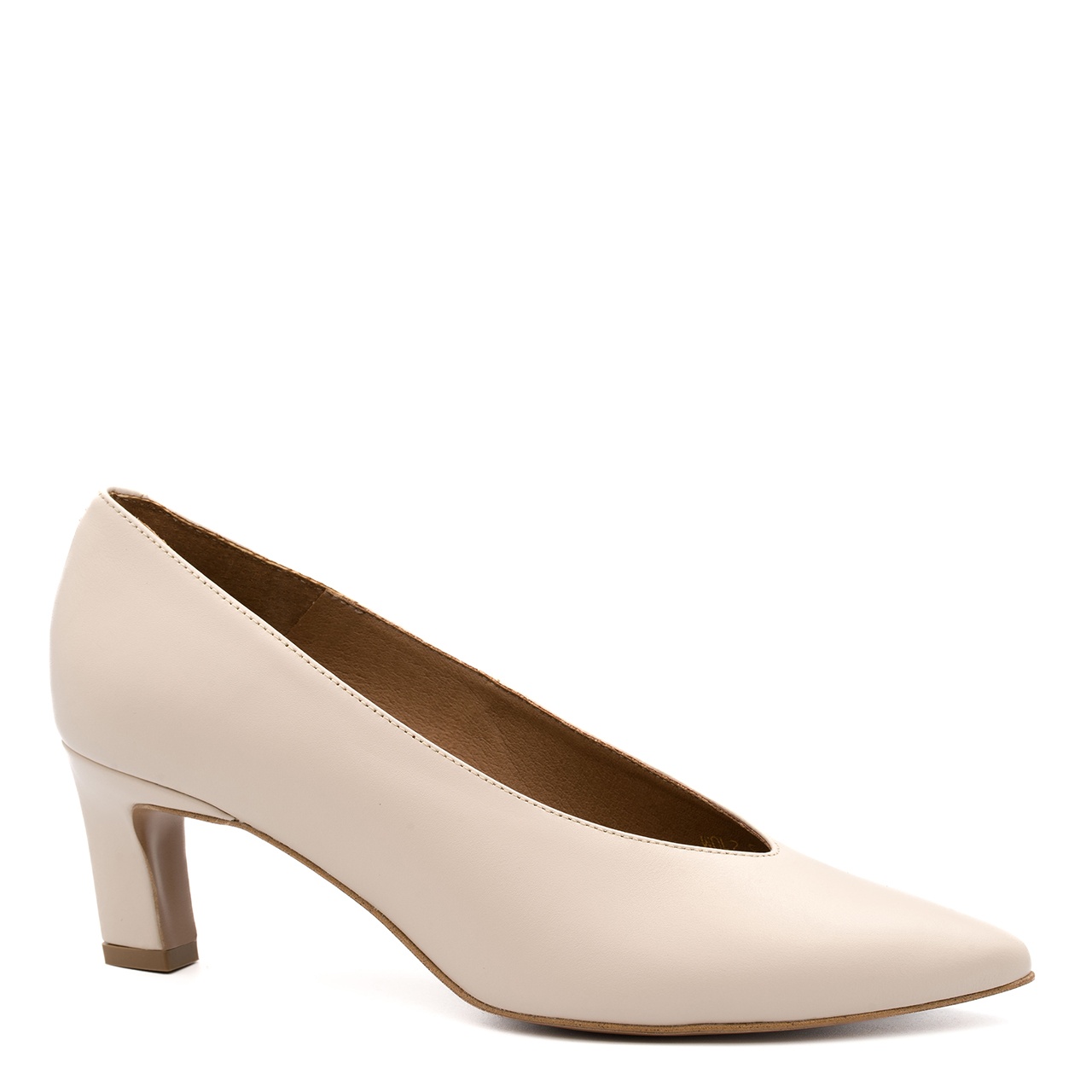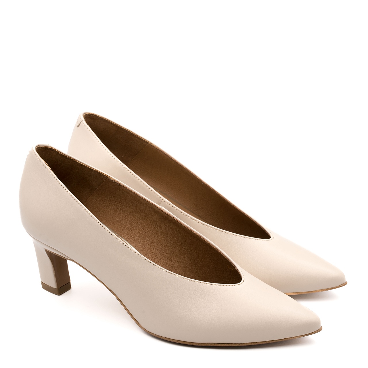 Beżowe klasyczne czółenka na 6 cm obcasie typu kaczuszka. Obuwie wyprodukowano z naturalnej skóry licowej. Przód buta w szpic. Obuwie wyróżnia się estetycznie wyciętą cholewką, która dodaje elegancji. Tęgość czółenek standardowa. Wkładka wykonana jest ze skóry naturalnej. Czółenka sprawdzą się na każdą okazję. Wymiary podawane na kartach produktów to wymiary orientacyjne i odnoszą się do rozmiaru 37