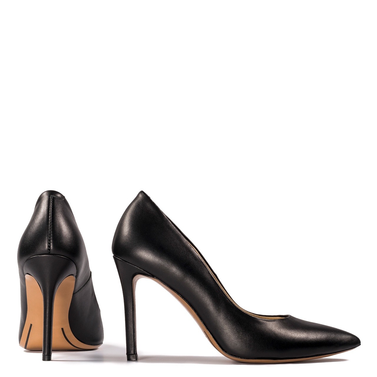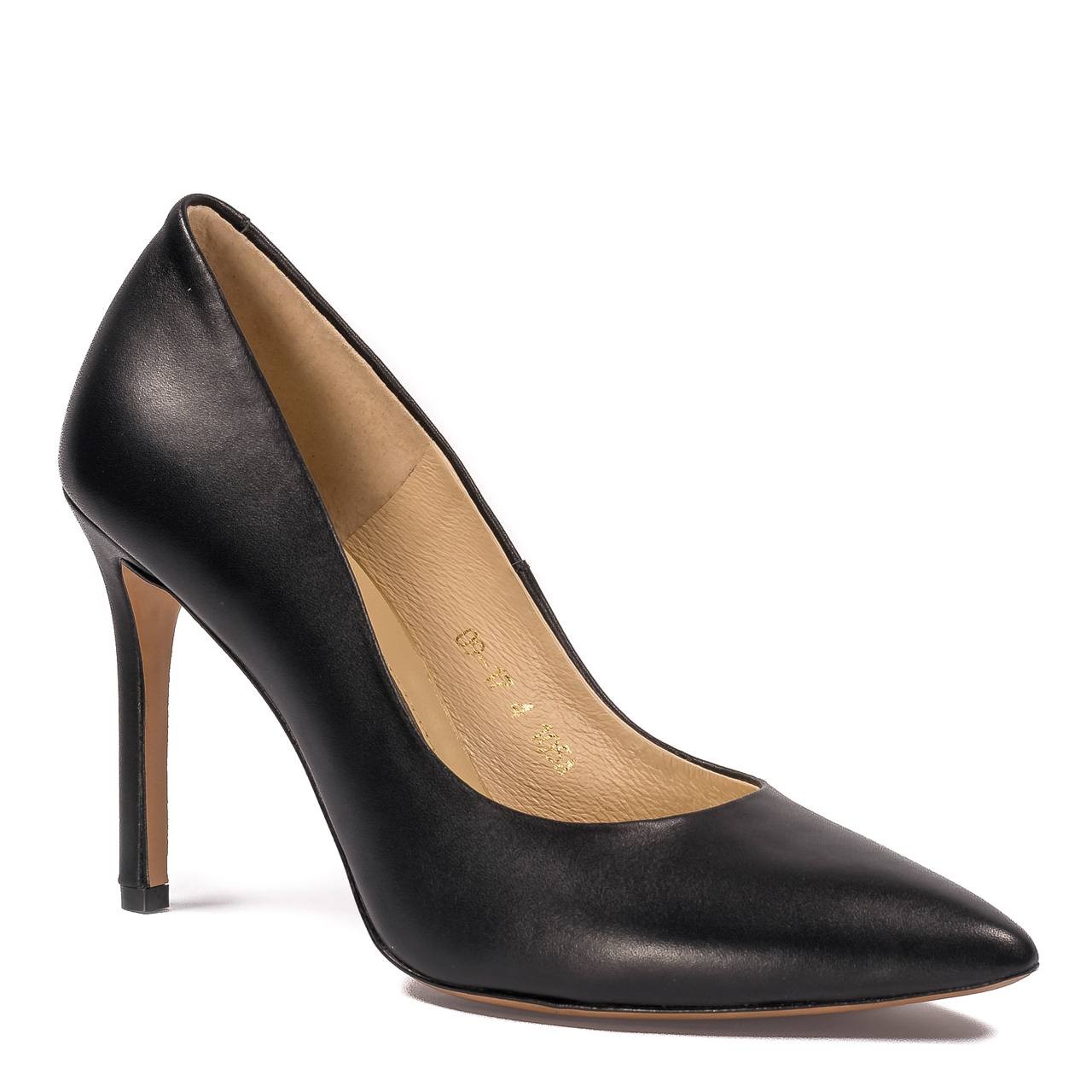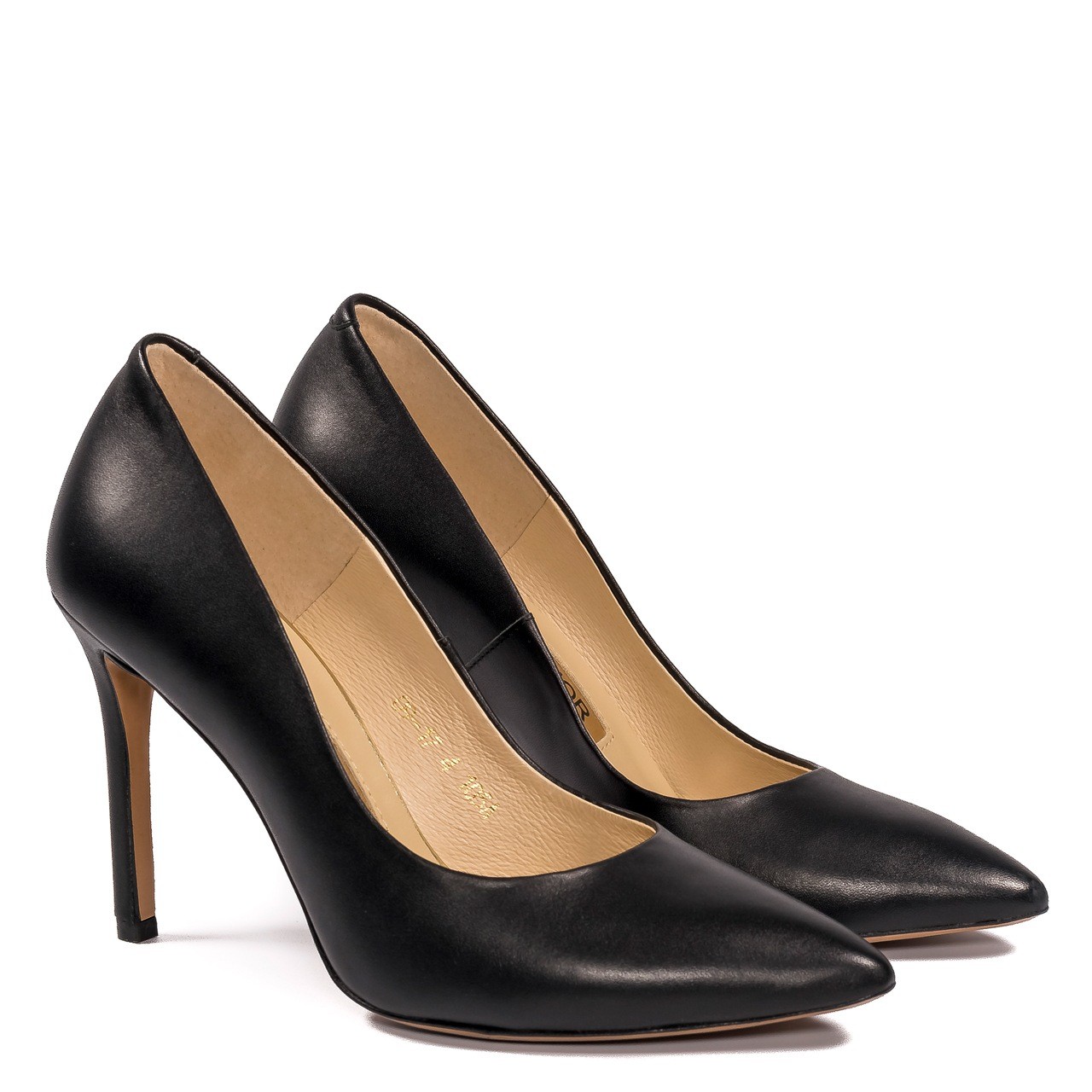 Czarne skórzane szpilki na wysokim obcasie, które wyglądają zawsze efektownie. Obcas w szpilkach wynosi 9,5 cm. Obuwie jest wykonane ze skóry naturalnej licowej. Noski butów w szpic. Wkładka wykonana ze skóry naturalnej. Wymiary podawane na kartach produktów to wymiary orientacyjne i odnoszą się do rozmiaru 37.