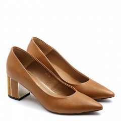 Koniakowe, skórzane czółenka na niskim 6 cm ozdobnym słupku. Obuwie jest wykonane ze skóry naturalnej. Obcas to idealne połączenie skóry zamszowej i licowej pomiędzy którymi widoczny jest delikatny złoty element obcasa. Noski butów w szpic. Wkładka w butach jest skórzana. Wymiary podawane na kartach produktów to wymiary orientacyjne i odnoszą się do rozmiaru 37.