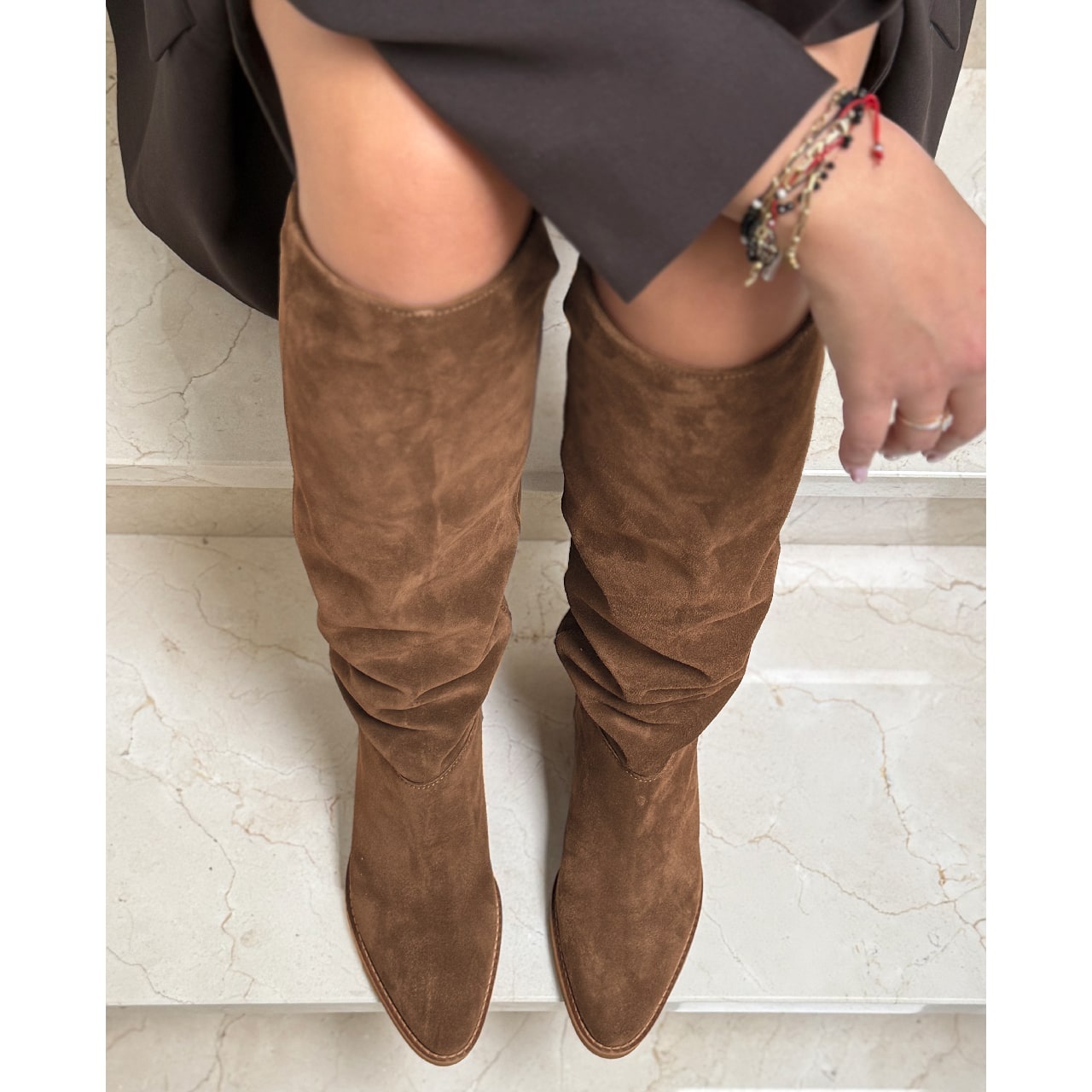 Koniakowe wsuwane kozaki z luźną cholewką na niskim 3,5 centymetrowym obcasie. Obuwie wykonano z naturalnej skóry welurowej. Przód buta w delikatny szpic. Skórzana cholewka jest bez zamka i lekko opadająca. Dolna część kozaków, do kostki, jest ocieplona filcem. Orientacyjne wymiary dla rozmiaru 37 to: szerokość cholewki na górze około 38 cm, przy kostce około 30 cm, a jej wysokość mierzona od podeszwy wynosi około 48,5 cm.