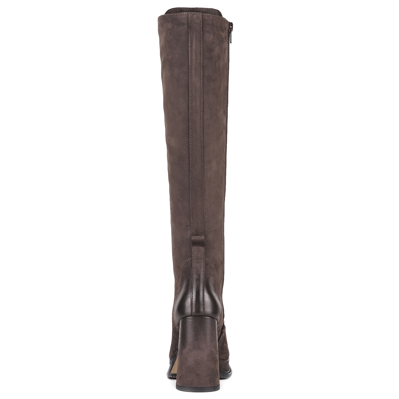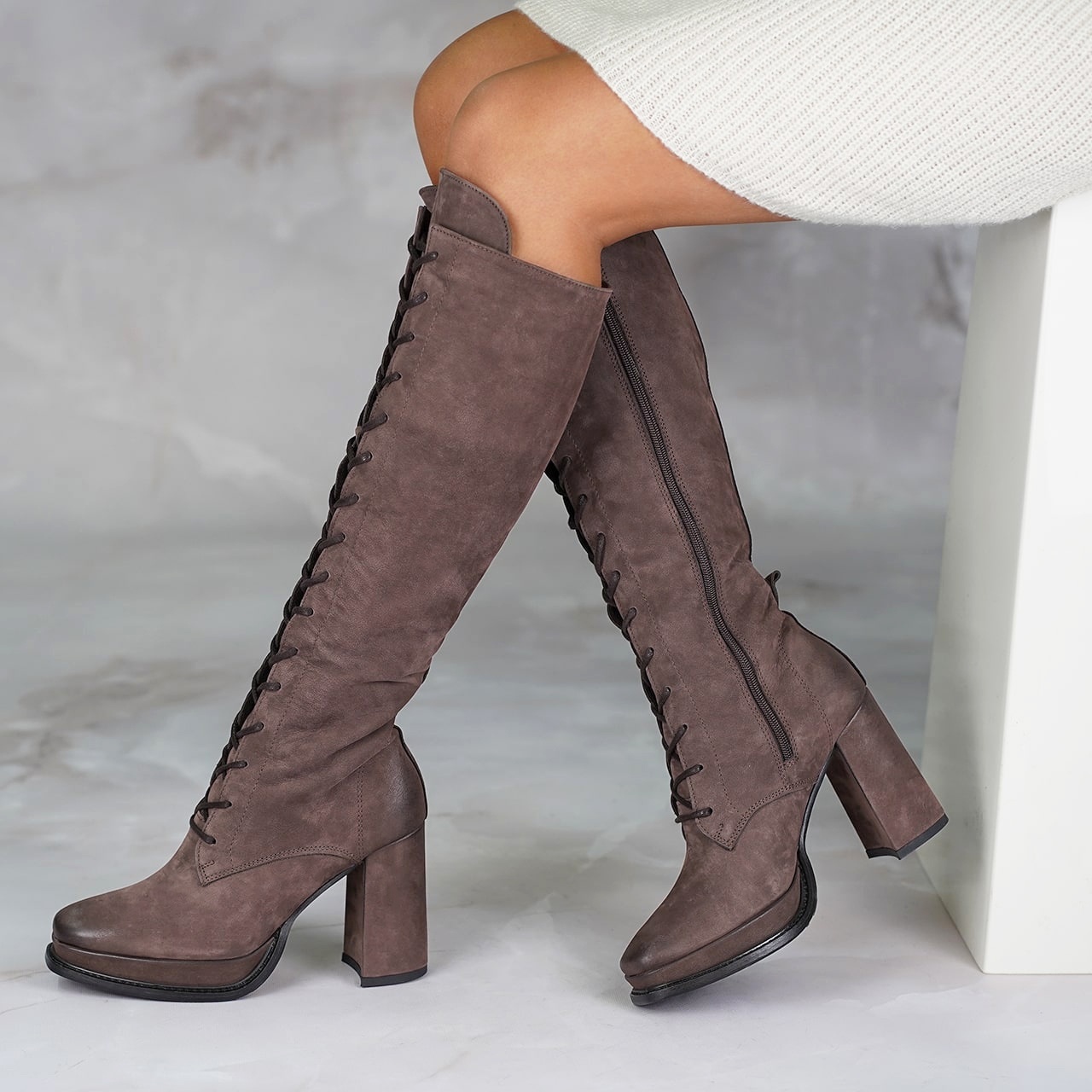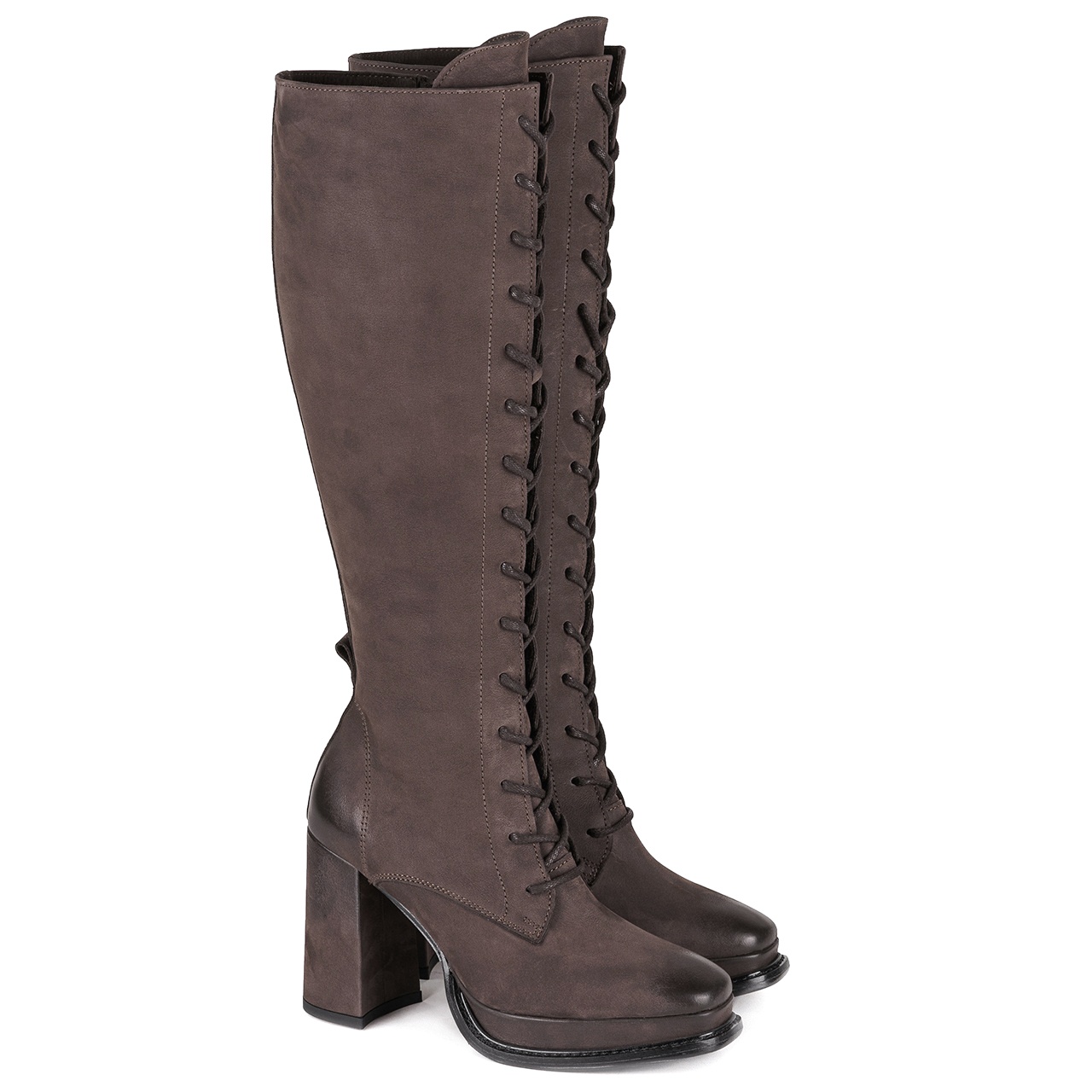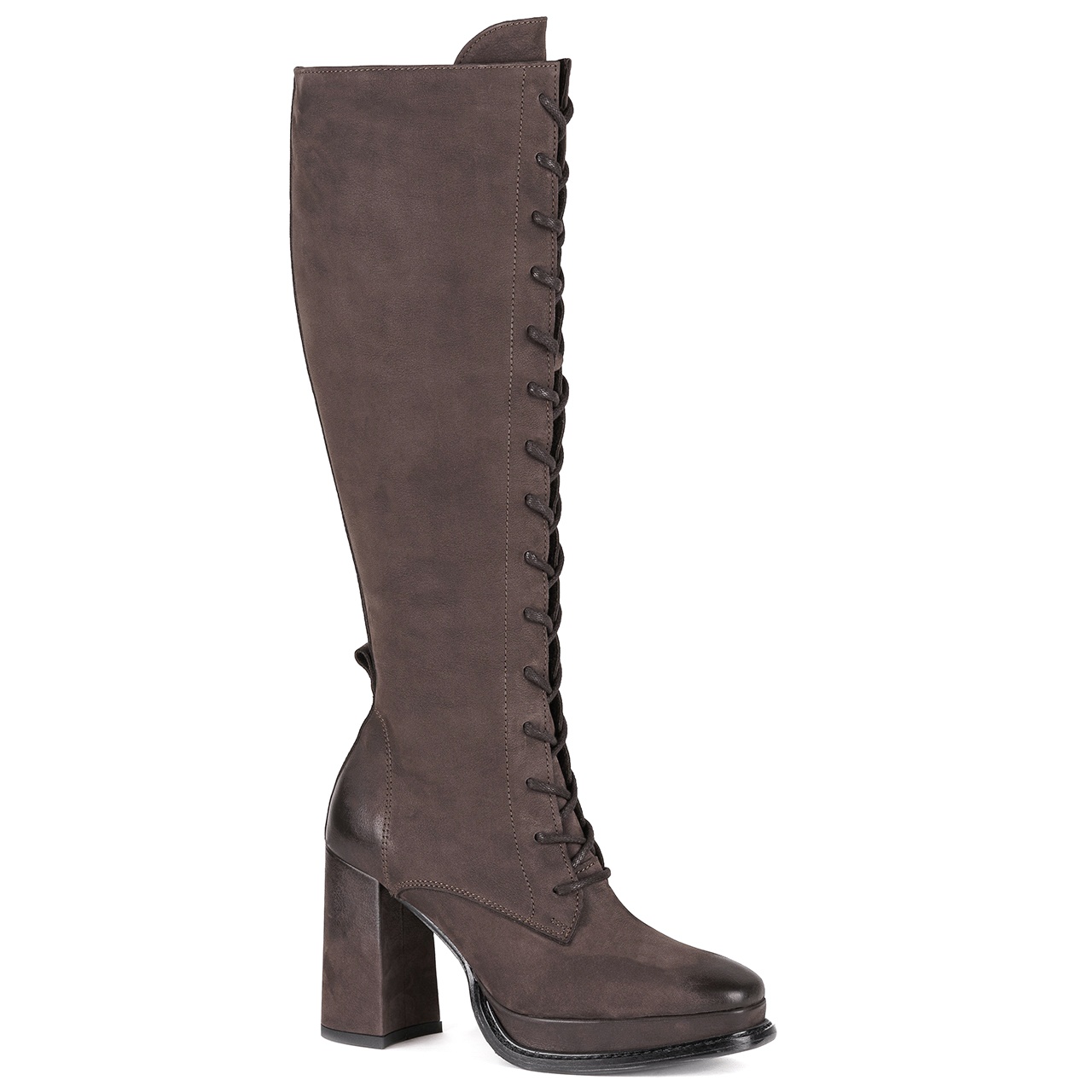 Brązowe, sznurowane kozaki na wysokim, 10 cm, stabilnym słupku wyprodukowano z naturalnej skóry nubukowej. Nosek i pięta w butach są delikatnie przyciemnione. Obcas obleczono skórą. Od wewnętrznej strony ocieplonej cholewki wszyto zamek. Podszewkę i wkładkę wykonano z brązowego filcu. Orientacyjne wymiary dla rozmiaru 37 to: szerokość cholewki na górze około 32 cm, przy kostce około 27 cm a jej wysokość mierzona od podeszwy wynosi około 41 cm. Z uwagi na rodzaj skóry i jej wykończenie sprzedawany produkt może różnić się w nieznacznym stopniu od modelu przedstawionego na zdjęciach.