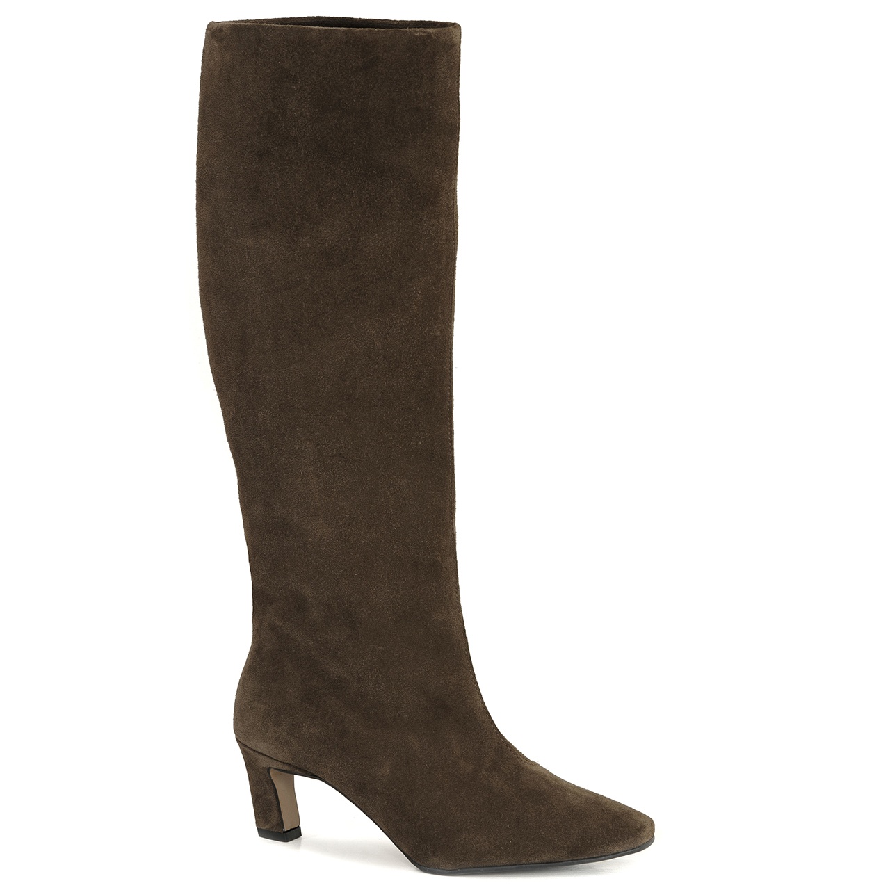 Czekoladowe welurowe długie kozaki z szeroką cholewką i niskim obcasie typu kaczuszka. Cholewka kozaków jest usztywniona. Obuwie wykonano ze skóry naturalnej welurowej. Kozaki to idealny modny wybór w każdej porze roku. Obcas w kozakach wynosi około 6 cm. Noski butów lekko kwadratowe. Obwód cholewki na górze wynosi około 37 cm w kostce około 30 cm, a jej wysokość mierzona od obcasa wynosi około 39 cm. Podszewka wykonana jest z materiału tekstylnego, a wkładka z filcu. Wymiary podawane na kartach produktów to wymiary orientacyjne i odnoszą się do rozmiaru 37.
