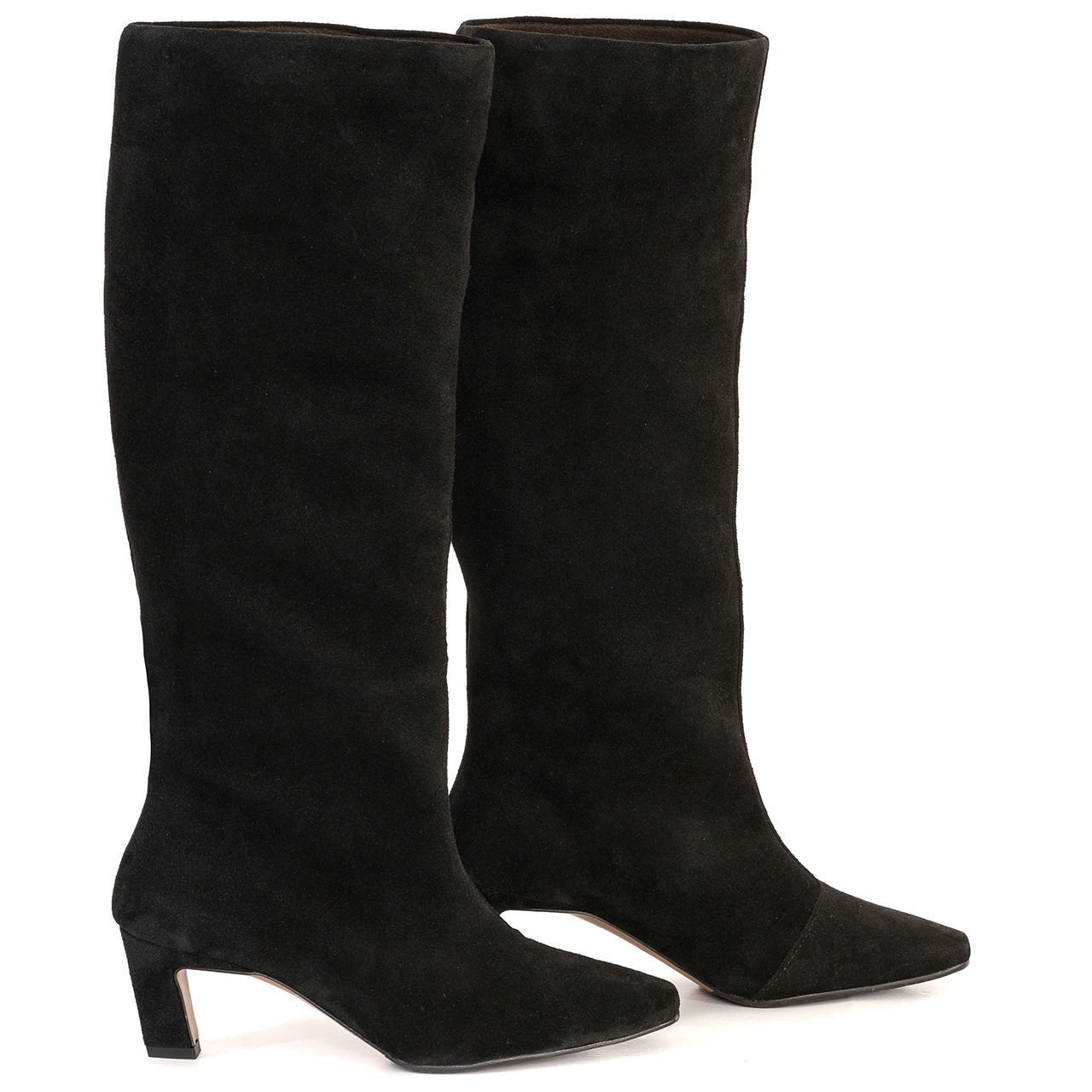 Czarne welurowe długie kozaki z szeroką cholewką i niskim obcasie typu kaczuszka. Cholewka kozaków jest usztywniona. Obuwie wykonano ze skóry naturalnej welurowej. Kozaki to idealny modny wybór w każdej porze roku. Obcas w kozakach wynosi około 6 cm. Noski butów lekko kwadratowe. Obwód cholewki na górze wynosi około 37 cm w kostce około 30 cm, a jej wysokość mierzona od obcasa wynosi około 39 cm. Podszewka wykonana jest z materiału tekstylnego, a wkładka z filcu. Wymiary podawane na kartach produktów to wymiary orientacyjne i odnoszą się do rozmiaru 37.