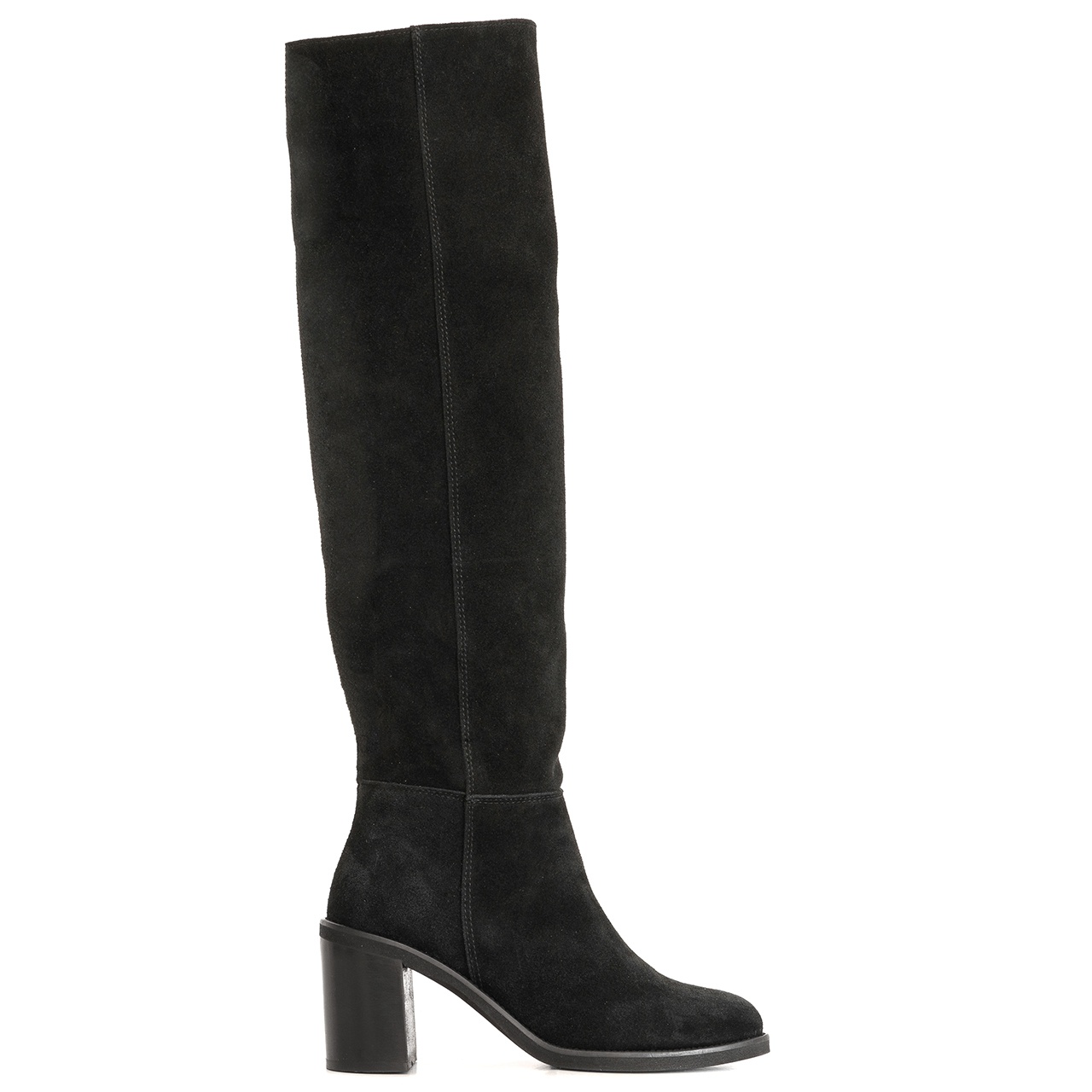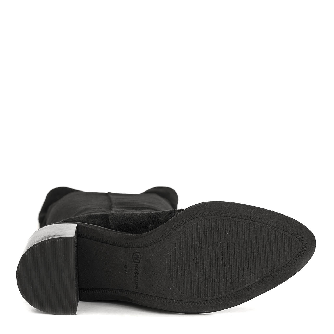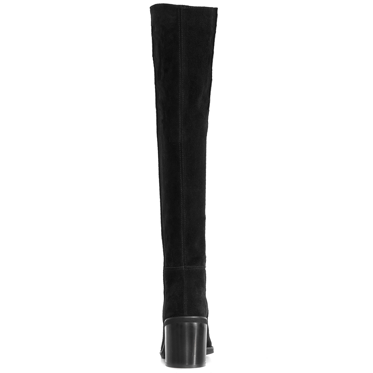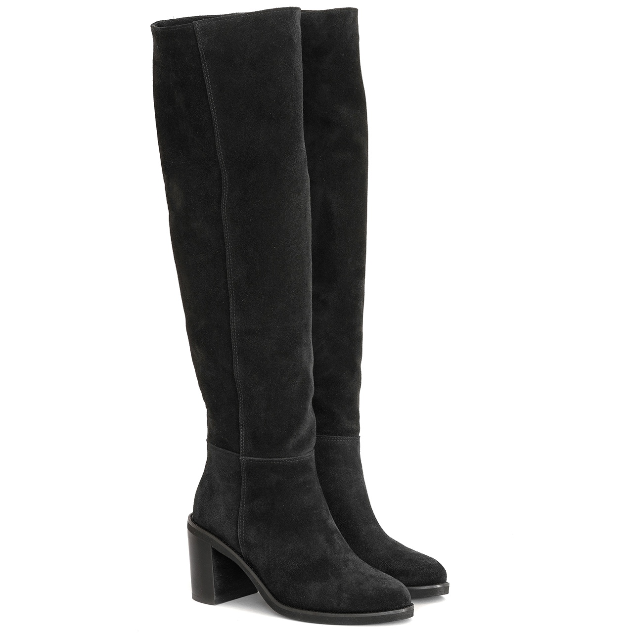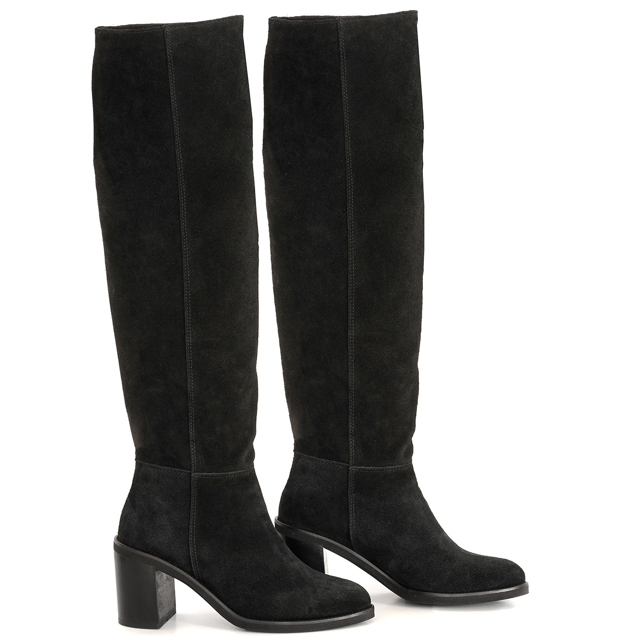 Czarne wsuwane kozaki z luźną cholewką na wysokim 8 centymetrowym obcasie. Obuwie wykonano z naturalnej skóry welurowej. Przód buta okrągły. Skórzana cholewka jest bez zamka i lekko opadająca. Dolna część kozaków, do kostki, jest ocieplona filcem. Orientacyjne wymiary dla rozmiaru 37 to: szerokość cholewki na górze około 39 cm, przy kostce około 30 cm, a jej wysokość mierzona od podeszwy wynosi około 49 cm.