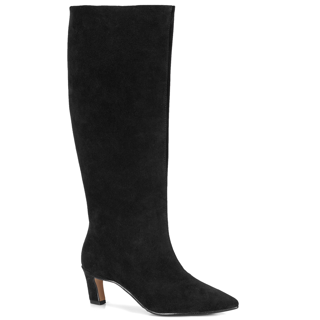 Czarne welurowe długie kozaki z szeroką cholewką i niskim obcasie typu kaczuszka. Cholewka kozaków jest usztywniona. Obuwie wykonano ze skóry naturalnej welurowej. Kozaki to idealny modny wybór w każdej porze roku. Obcas w kozakach wynosi około 6 cm. Noski butów w szpic. Obwód cholewki na górze wynosi około 37 cm w kostce około 30 cm, a jej wysokość mierzona od obcasa wynosi około 39 cm. Podszewka wykonana jest z materiału tekstylnego, a wkładka z filcu. Wymiary podawane na kartach produktów to wymiary orientacyjne i odnoszą się do rozmiaru 37.