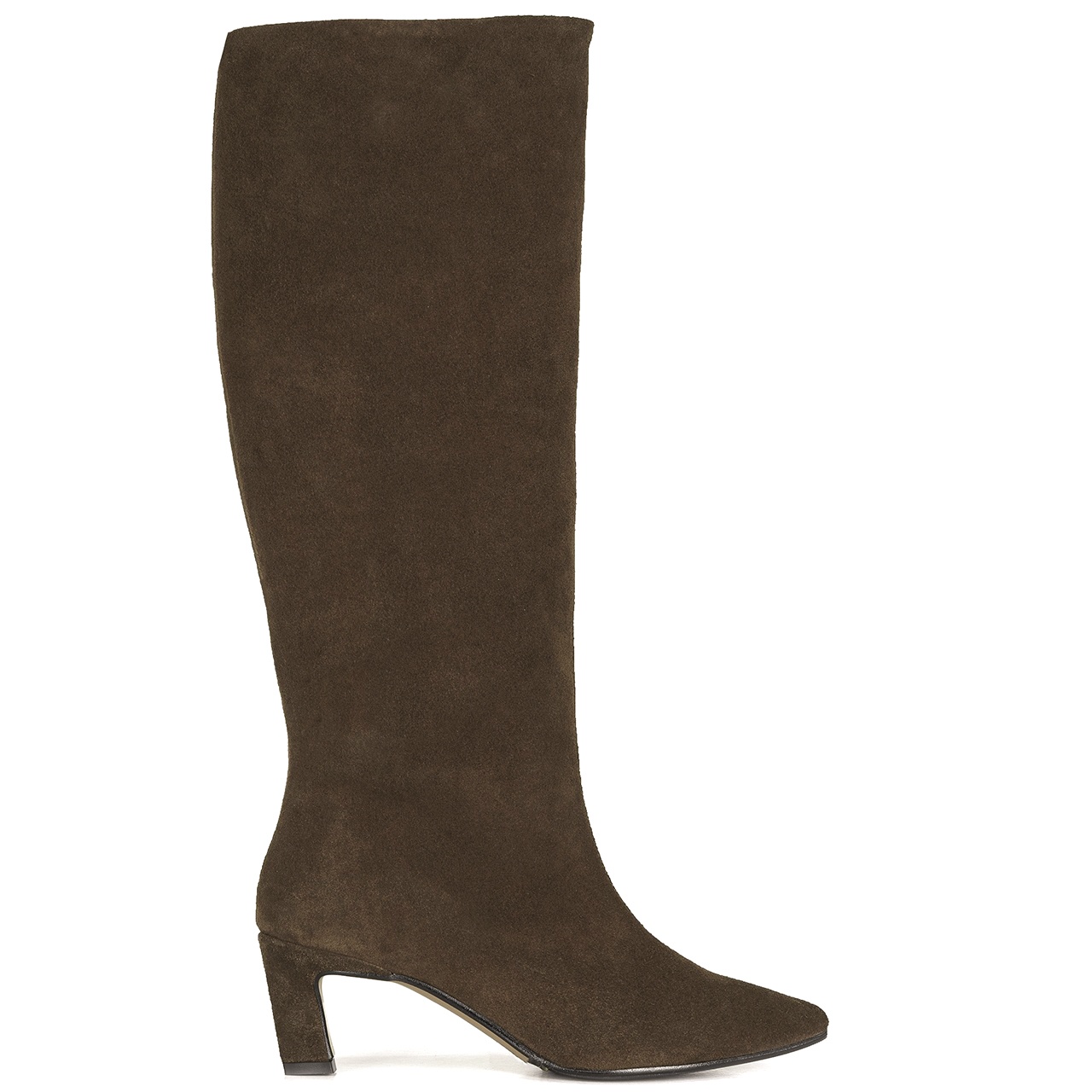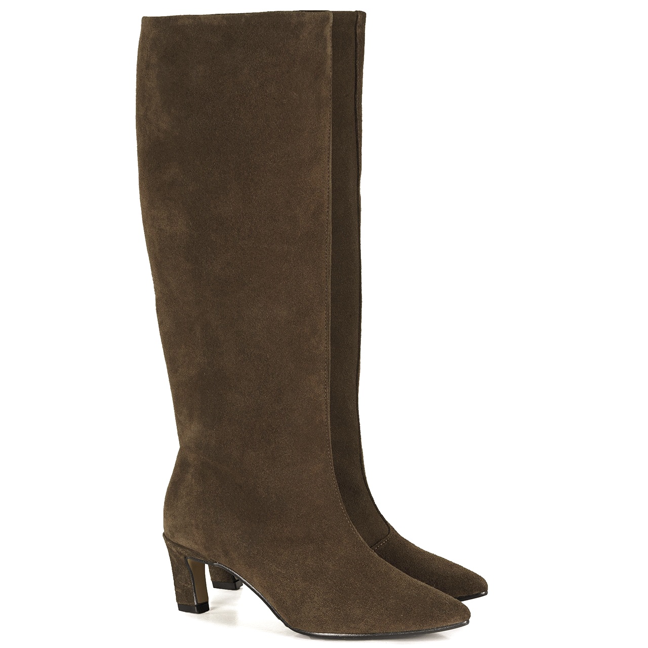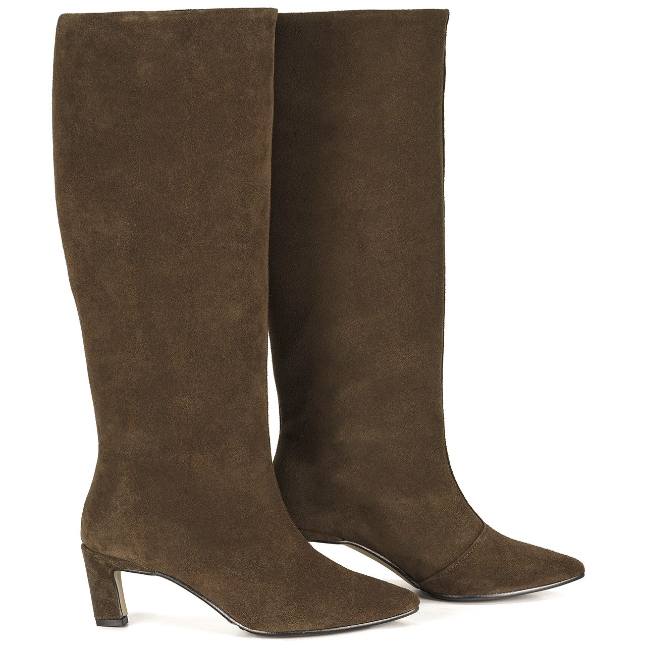 Czekoladowe welurowe długie kozaki z szeroką cholewką i niskim obcasie typu kaczuszka. Cholewka kozaków jest usztywniona. Obuwie wykonano ze skóry naturalnej welurowej. Kozaki to idealny modny wybór w każdej porze roku. Obcas w kozakach wynosi około 6 cm. Noski butów w szpic. Obwód cholewki na górze wynosi około 37 cm w kostce około 30 cm, a jej wysokość mierzona od obcasa wynosi około 39 cm. Podszewka wykonana jest z materiału tekstylnego, a wkładka z filcu. Wymiary podawane na kartach produktów to wymiary orientacyjne i odnoszą się do rozmiaru 37.