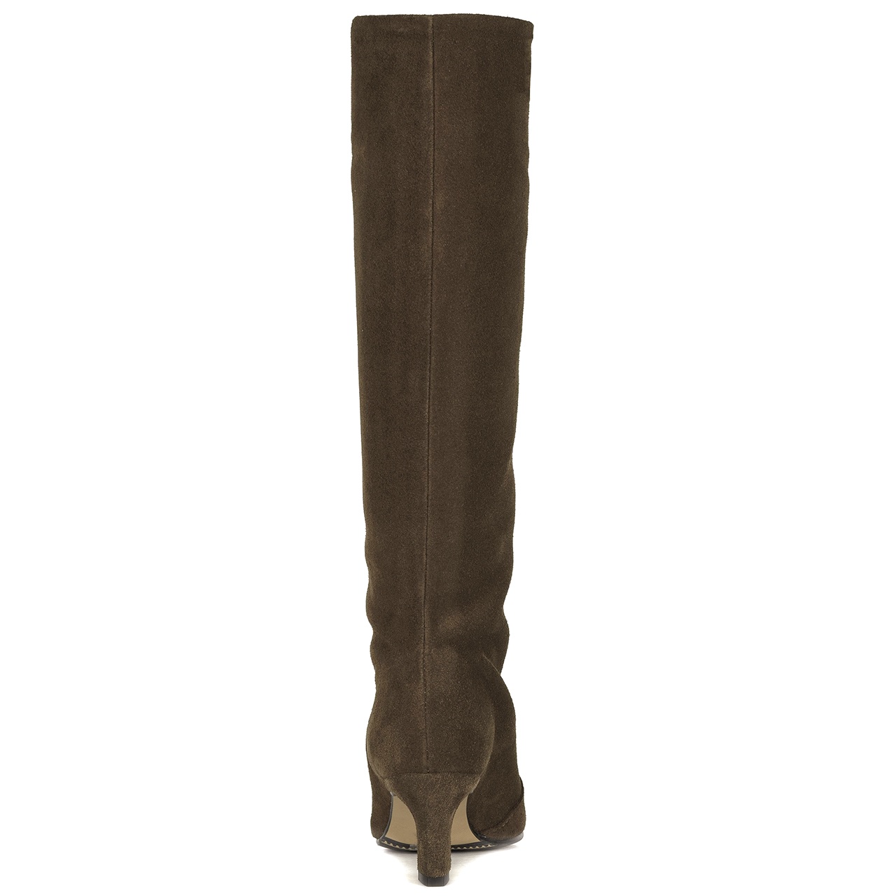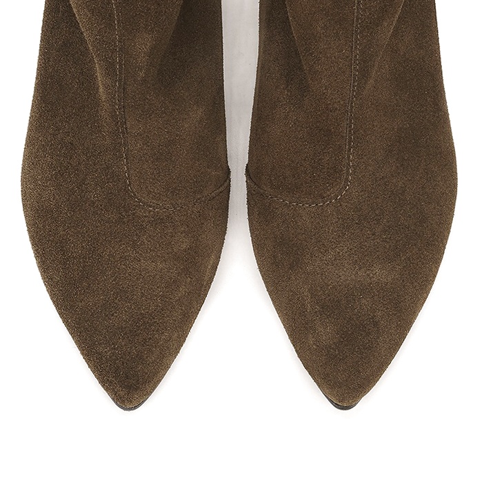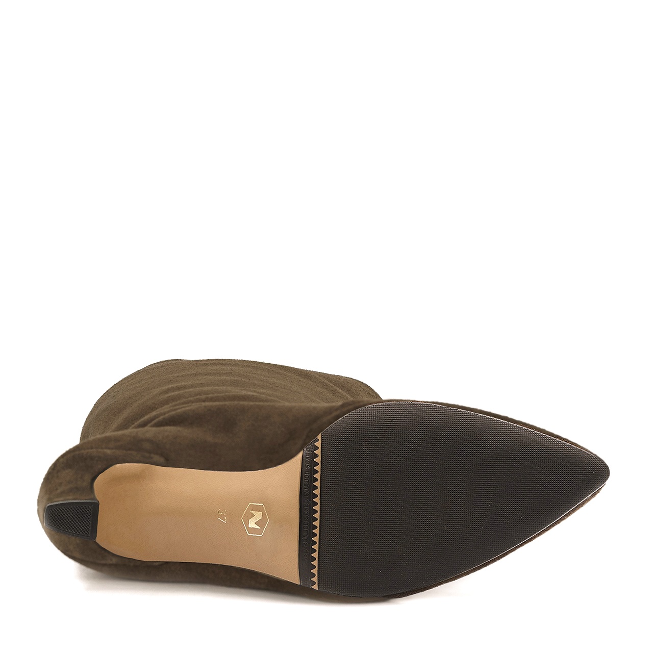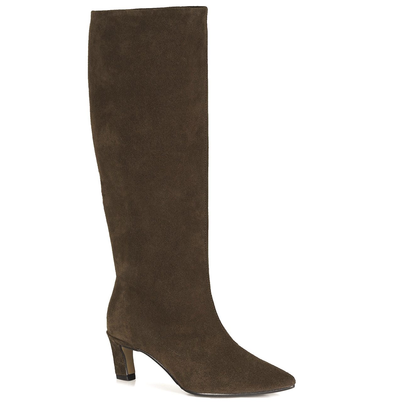 Czekoladowe welurowe długie kozaki z szeroką cholewką i niskim obcasie typu kaczuszka. Cholewka kozaków jest usztywniona. Obuwie wykonano ze skóry naturalnej welurowej. Kozaki to idealny modny wybór w każdej porze roku. Obcas w kozakach wynosi około 6 cm. Noski butów w szpic. Obwód cholewki na górze wynosi około 37 cm w kostce około 30 cm, a jej wysokość mierzona od obcasa wynosi około 39 cm. Podszewka wykonana jest z materiału tekstylnego, a wkładka z filcu. Wymiary podawane na kartach produktów to wymiary orientacyjne i odnoszą się do rozmiaru 37.