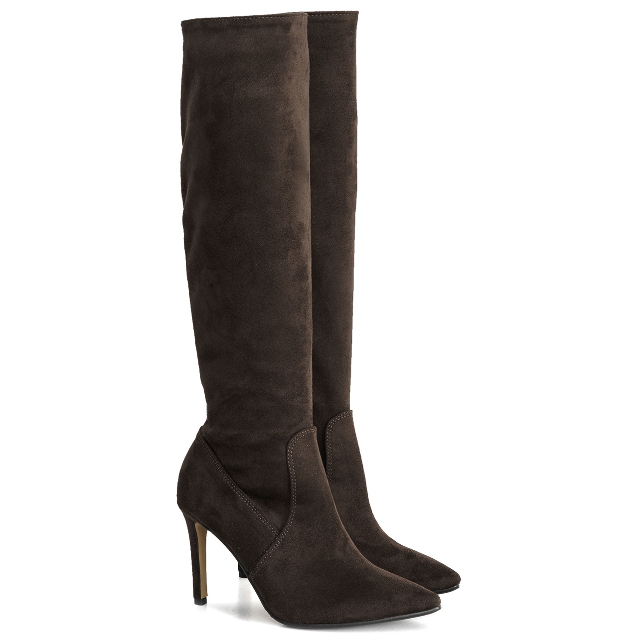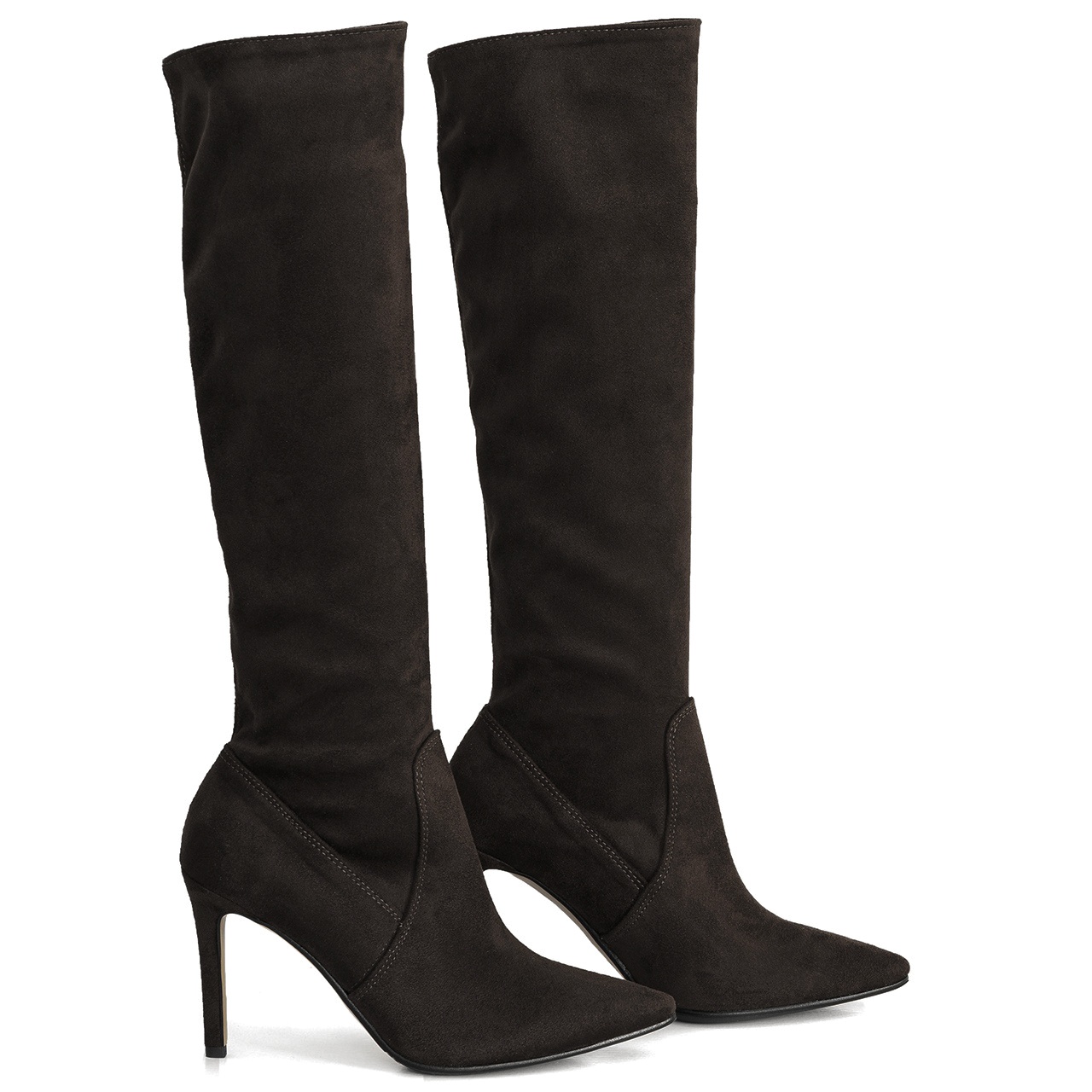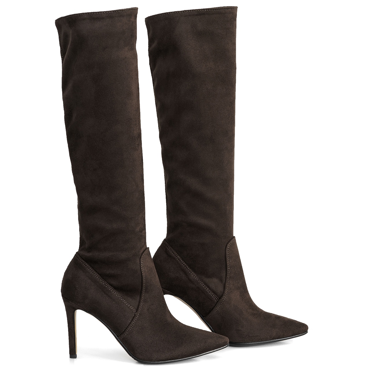 Brązowe, jesienne kozaczki na szpilce. Buty są wykonane z elastycznego materiału-lycry. Cholewka nieocieplona. Nie posiada suwaka. Noski butów w szpic. Cholewka sięga przed kolano i przylega do nogi. Wysokość obcasa wynosi 9 cm. Podszewkę uszyto z materiału tekstylnego, wkładkę z filcu. Orientacyjne wymiary to: szerokość cholewki na górze około 34 cm, przy kostce około 24 cm, a jej wysokość mierzona od obcasa wynosi około 39 cm. Wymiary podawane na kartach produktów to wymiary orientacyjne i odnoszą się do rozmiaru 37.