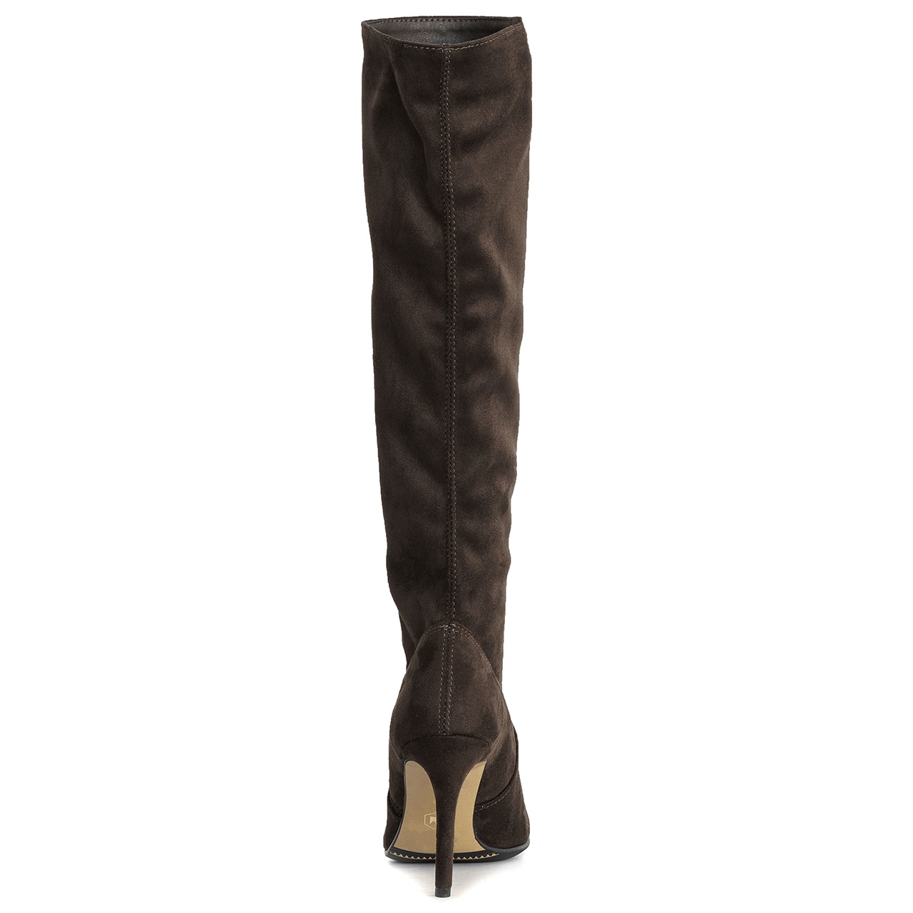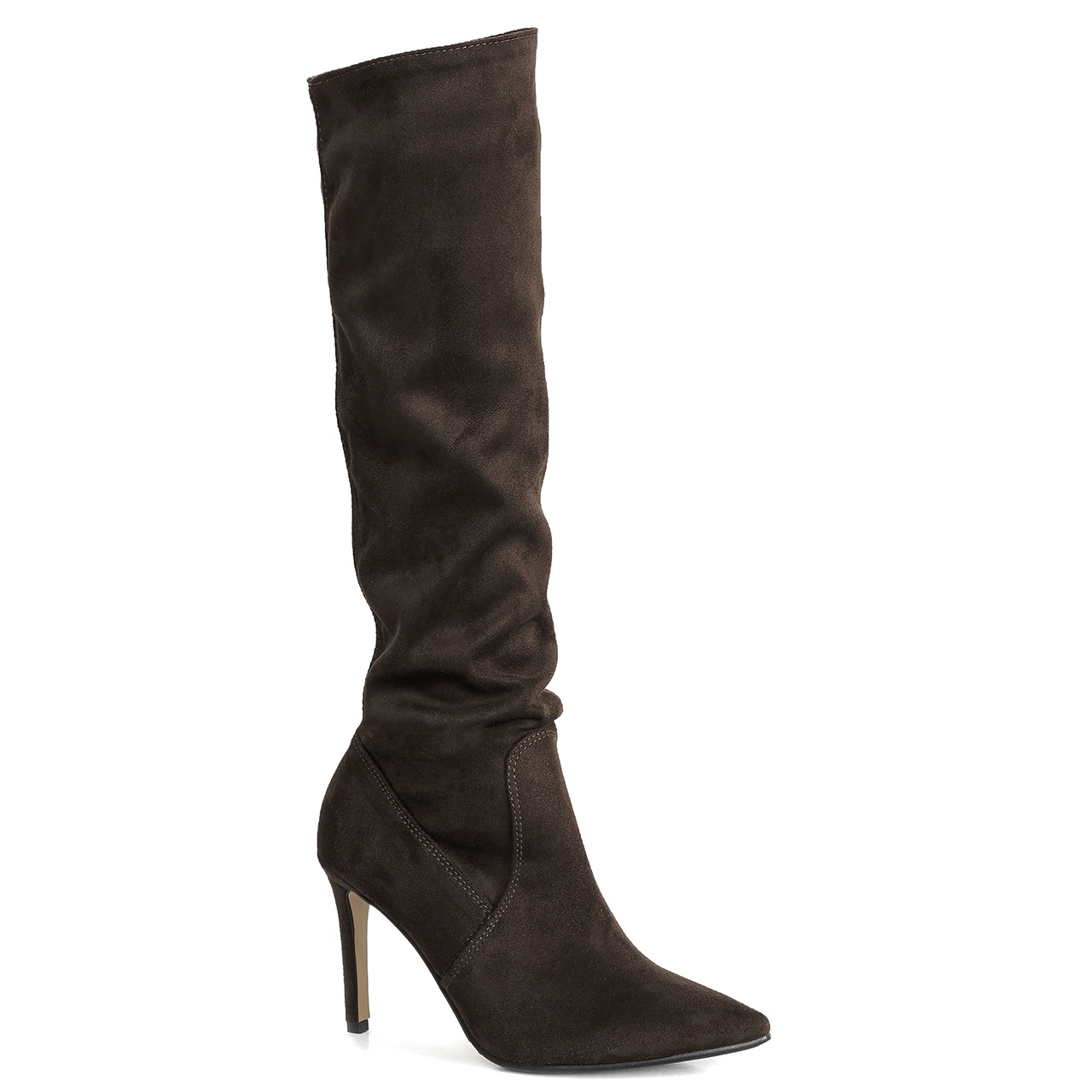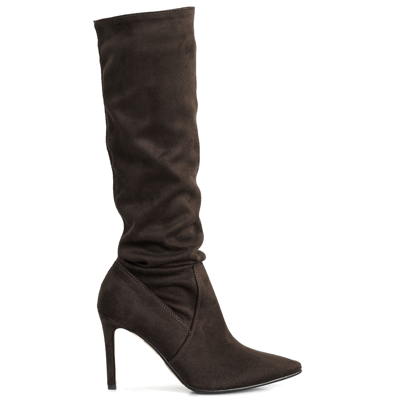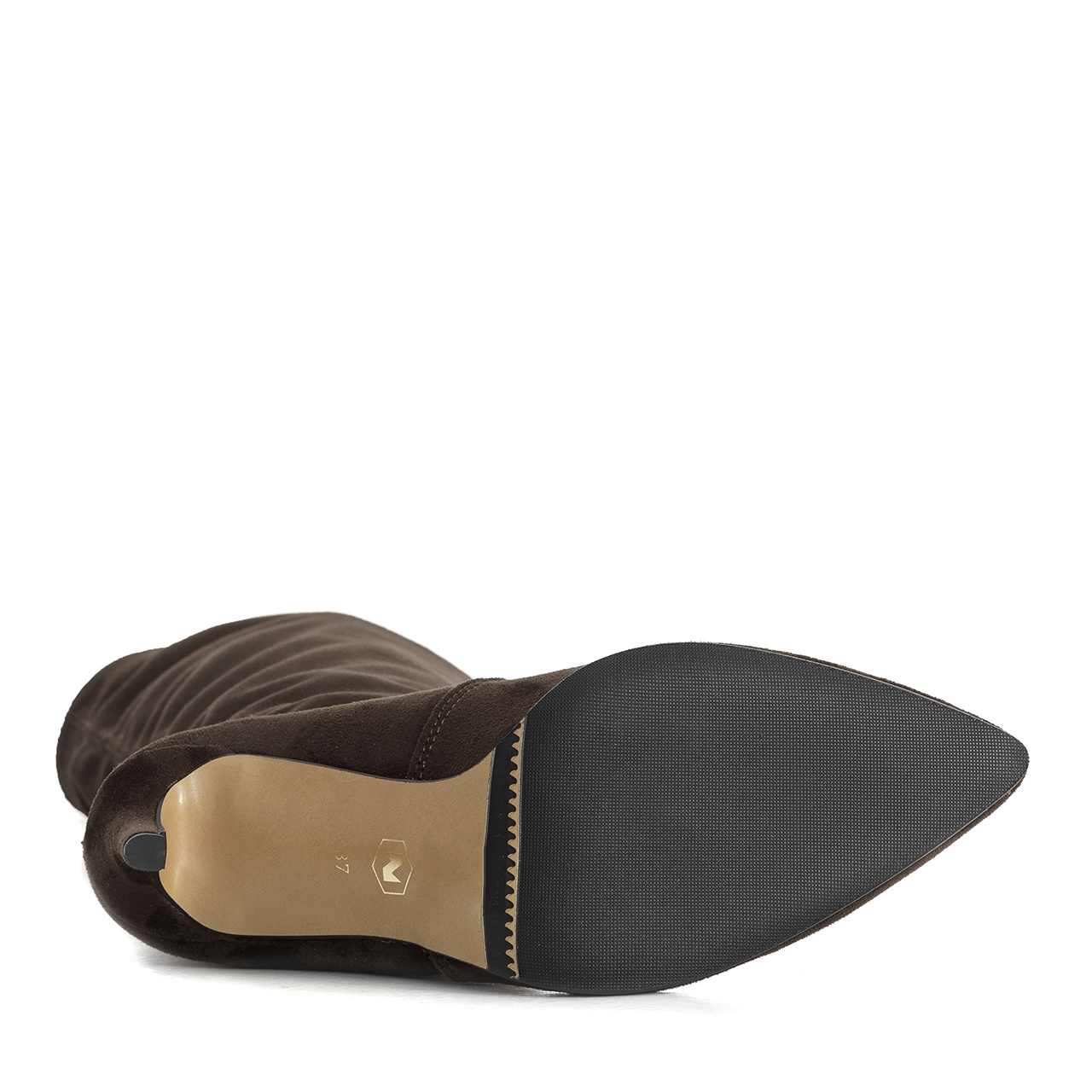 Brązowe, jesienne kozaczki na szpilce. Buty są wykonane z elastycznego materiału-lycry. Cholewka nieocieplona. Nie posiada suwaka. Noski butów w szpic. Cholewka sięga przed kolano i przylega do nogi. Wysokość obcasa wynosi 9 cm. Podszewkę uszyto z materiału tekstylnego, wkładkę z filcu. Orientacyjne wymiary to: szerokość cholewki na górze około 34 cm, przy kostce około 24 cm, a jej wysokość mierzona od obcasa wynosi około 39 cm. Wymiary podawane na kartach produktów to wymiary orientacyjne i odnoszą się do rozmiaru 37.