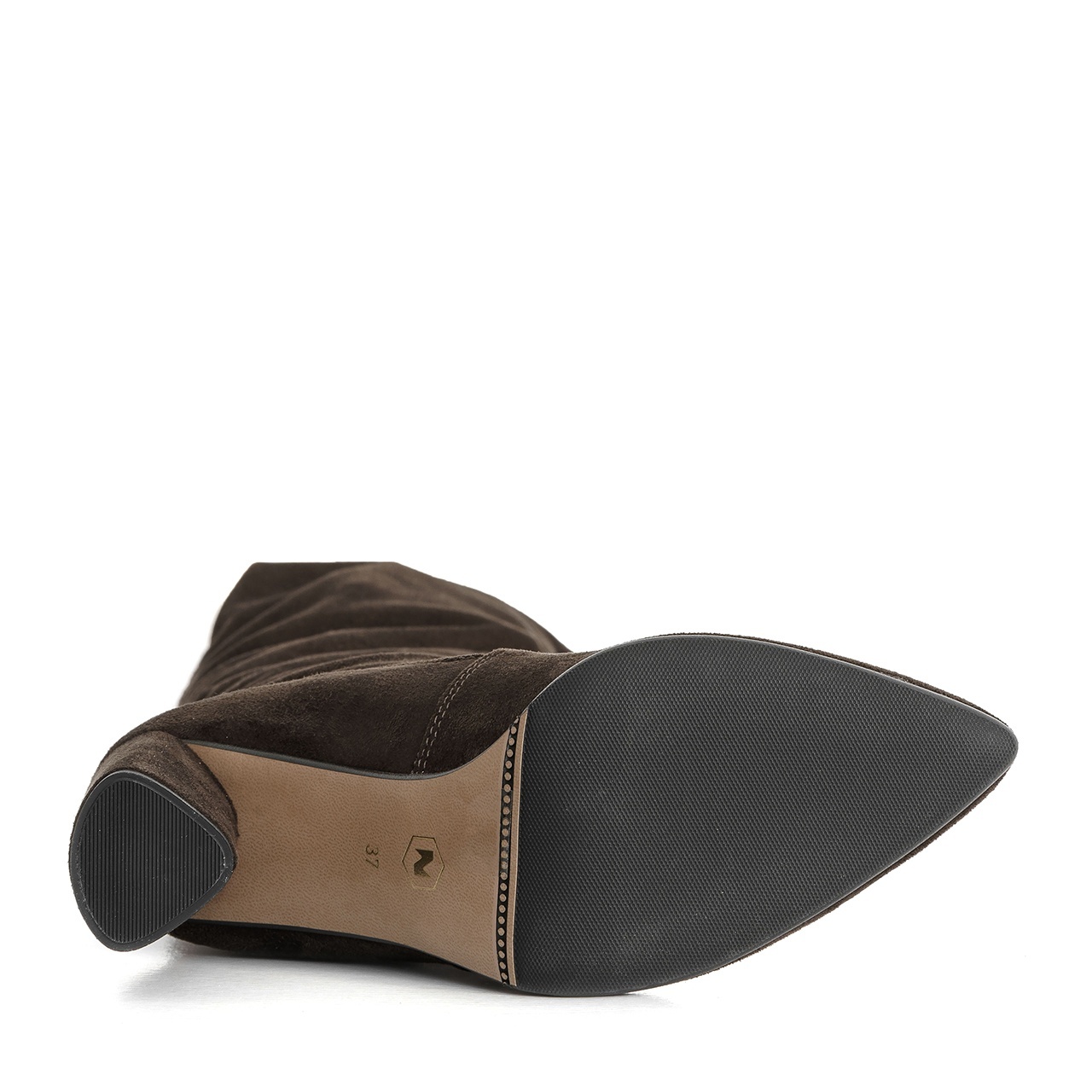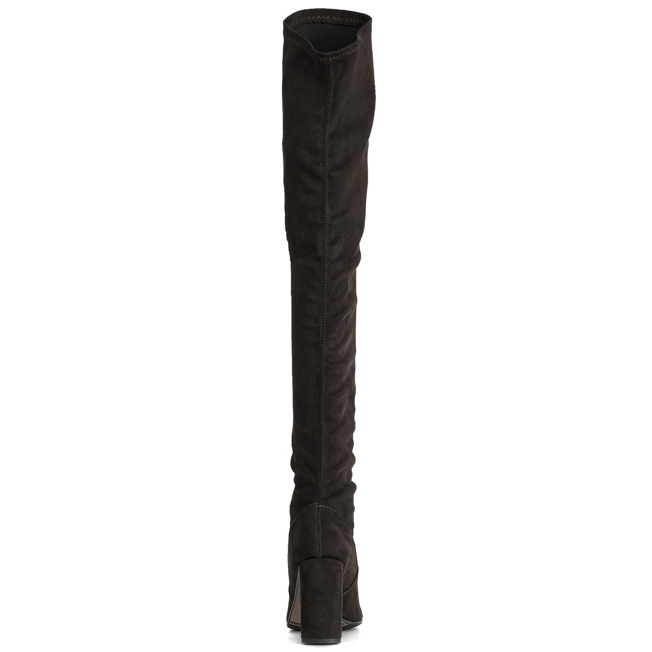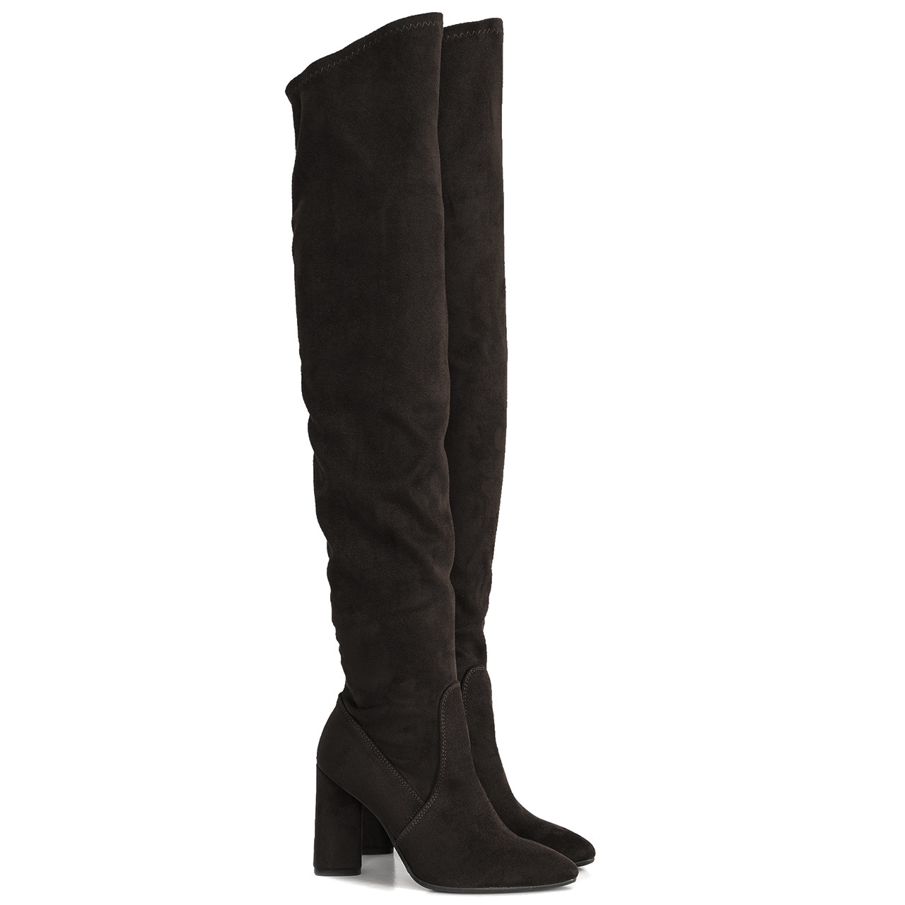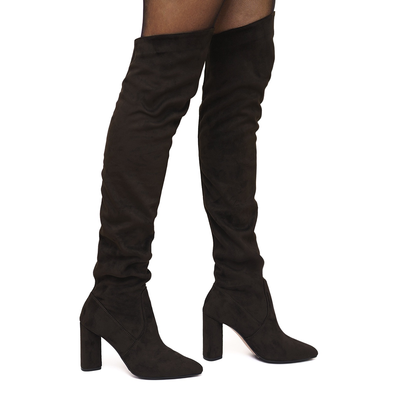 Brązowe, wysokie kozaczki na szerokim słupku o podstawie trójkąta. Kozaki wykonane są w całości z elastycznego materiału-lycry, dzięki czemu, pomimo braku zamka i długiej, sięgającej za kolano cholewki buty bardzo łatwo wchodzą na nogę. Obcas o wysokości 9 cm typu słupek sprawia, że but jest wygodny. Szerokość cholewki na górze około 34 cm, przy kostce około 24 cm, a jej wysokość mierzona od obcasa wynosi około 54 cm. Wymiary podawane na kartach produktów to wymiary orientacyjne i odnoszą się do rozmiaru 37.