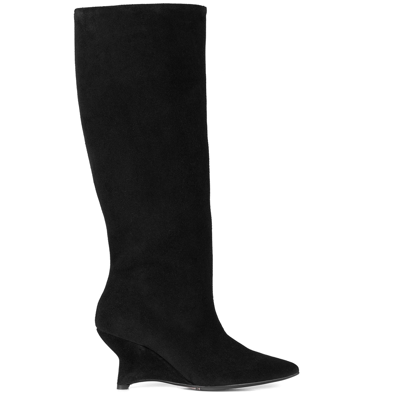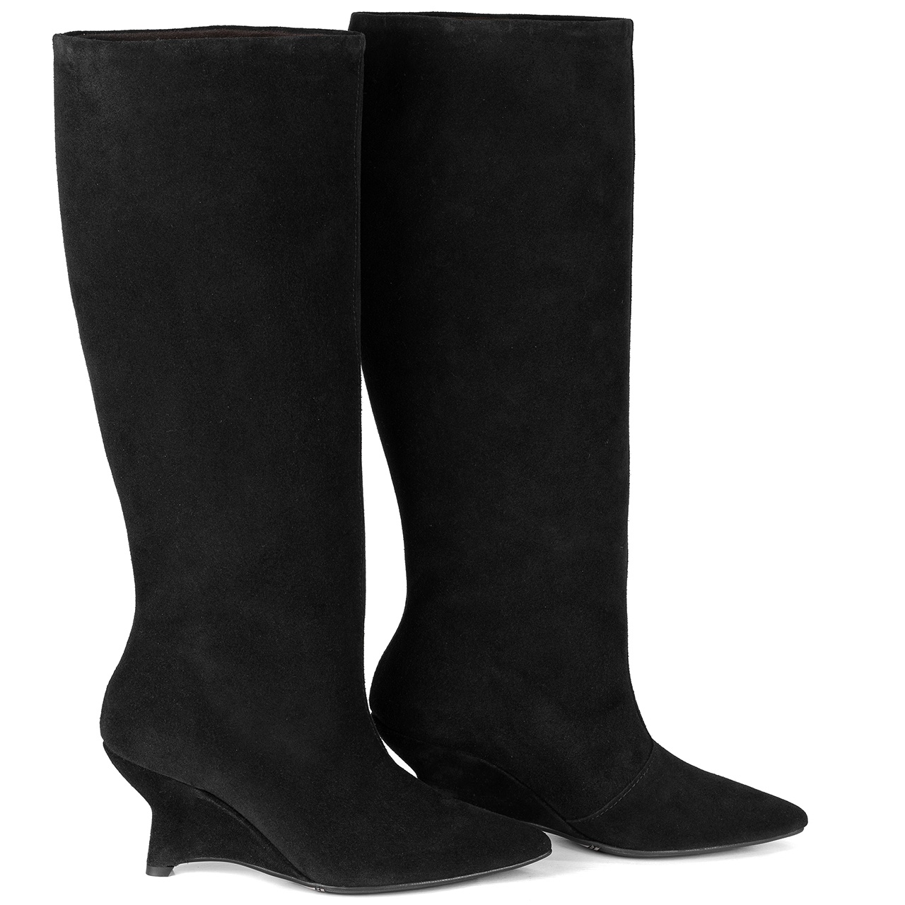 Czarne welurowe długie kozaki z szeroką, usztywnioną cholewką na wysokim koturnie - obcasie. Obuwie wykonano ze skóry naturalnej welurowej. Charakterystyczny obcas dodaje elegancji. Kozaki to idealny modny wybór w każdej porze roku. Obcas w kozakach wynosi około 8 cm. Noski butów w szpic. Obwód cholewki na górze wynosi około 39 cm w kostce około 30 cm, a jej wysokość mierzona od obcasa wynosi około 39 cm. Podszewka wykonana jest z materiału tekstylnego, a wkładka z filcu. Wymiary podawane na kartach produktów to wymiary orientacyjne i odnoszą się do rozmiaru 37.