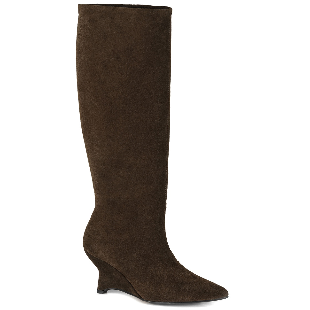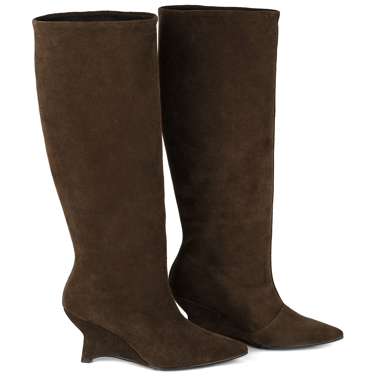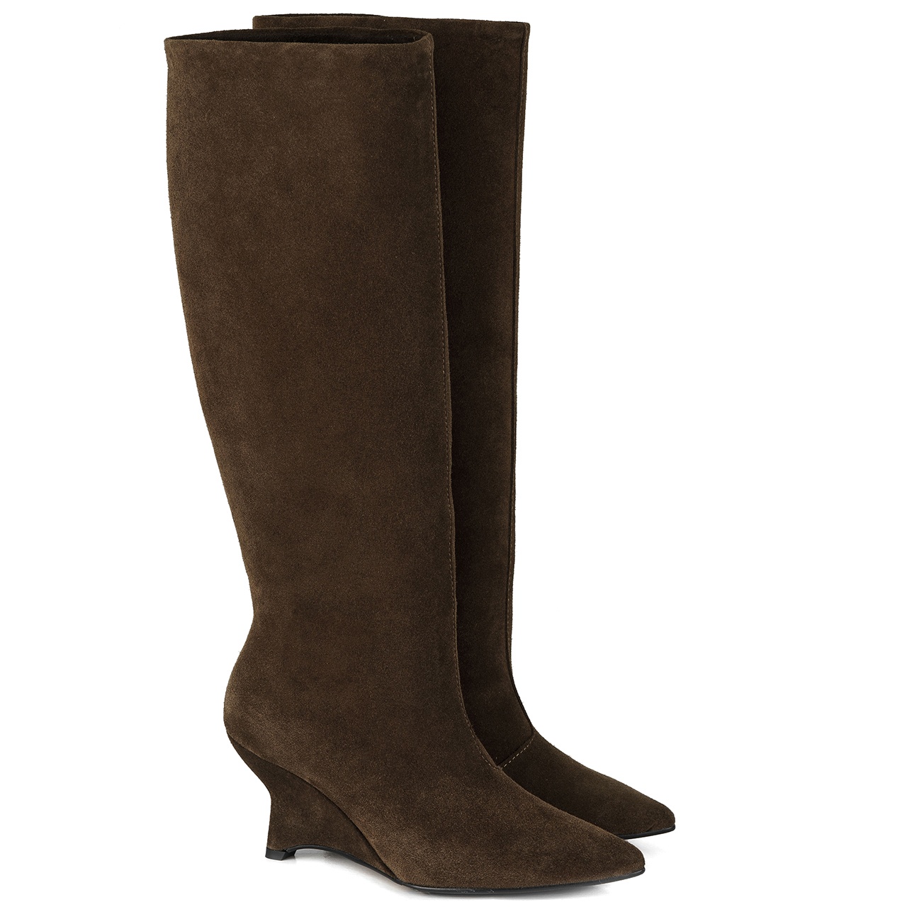 Czekoladowe welurowe długie kozaki z szeroką, usztywnioną cholewką na wysokim koturnie - obcasie. Obuwie wykonano ze skóry naturalnej welurowej. Charakterystyczny obcas dodaje elegancji. Kozaki to idealny modny wybór w każdej porze roku. Obcas w kozakach wynosi około 8 cm. Noski butów w szpic. Obwód cholewki na górze wynosi około 39 cm w kostce około 30 cm, a jej wysokość mierzona od obcasa wynosi około 39 cm. Podszewka wykonana jest z materiału tekstylnego, a wkładka z filcu. Wymiary podawane na kartach produktów to wymiary orientacyjne i odnoszą się do rozmiaru 37.