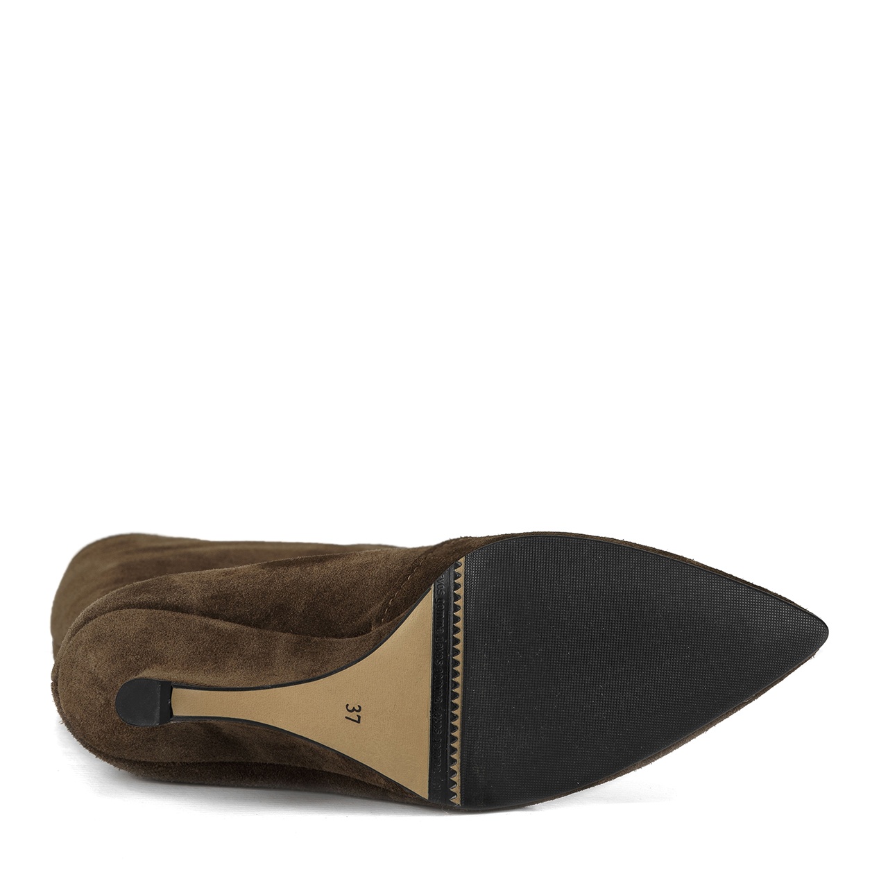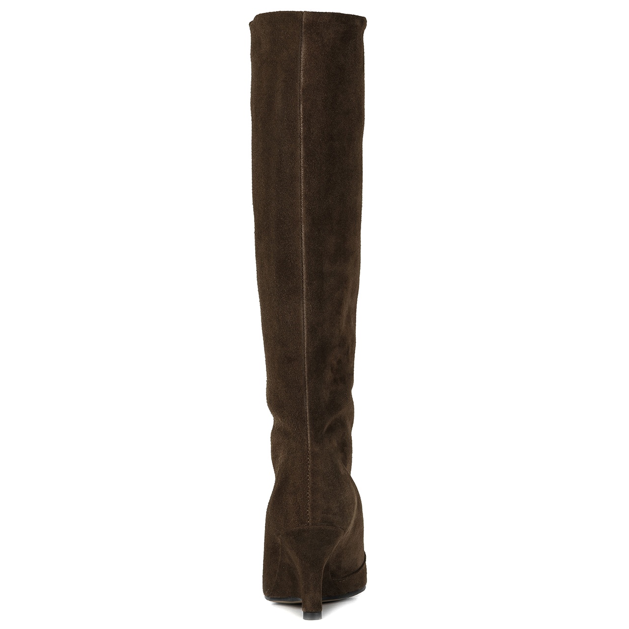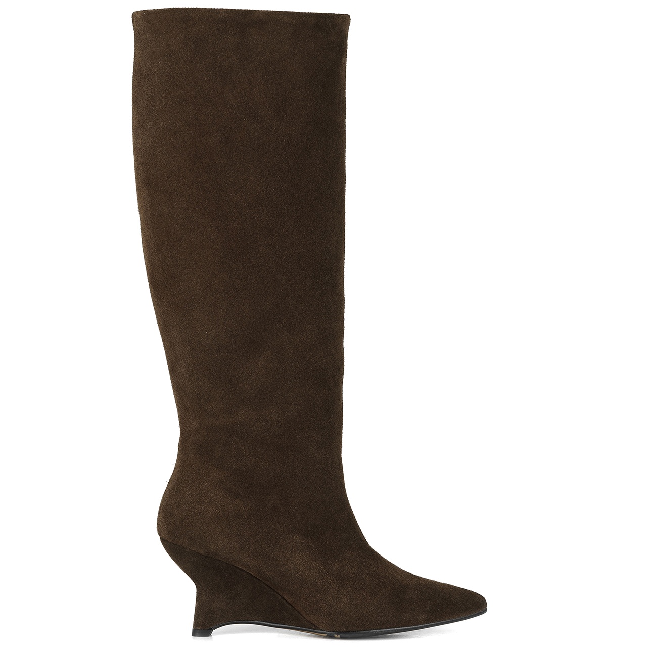 Czekoladowe welurowe długie kozaki z szeroką, usztywnioną cholewką na wysokim koturnie - obcasie. Obuwie wykonano ze skóry naturalnej welurowej. Charakterystyczny obcas dodaje elegancji. Kozaki to idealny modny wybór w każdej porze roku. Obcas w kozakach wynosi około 8 cm. Noski butów w szpic. Obwód cholewki na górze wynosi około 39 cm w kostce około 30 cm, a jej wysokość mierzona od obcasa wynosi około 39 cm. Podszewka wykonana jest z materiału tekstylnego, a wkładka z filcu. Wymiary podawane na kartach produktów to wymiary orientacyjne i odnoszą się do rozmiaru 37.