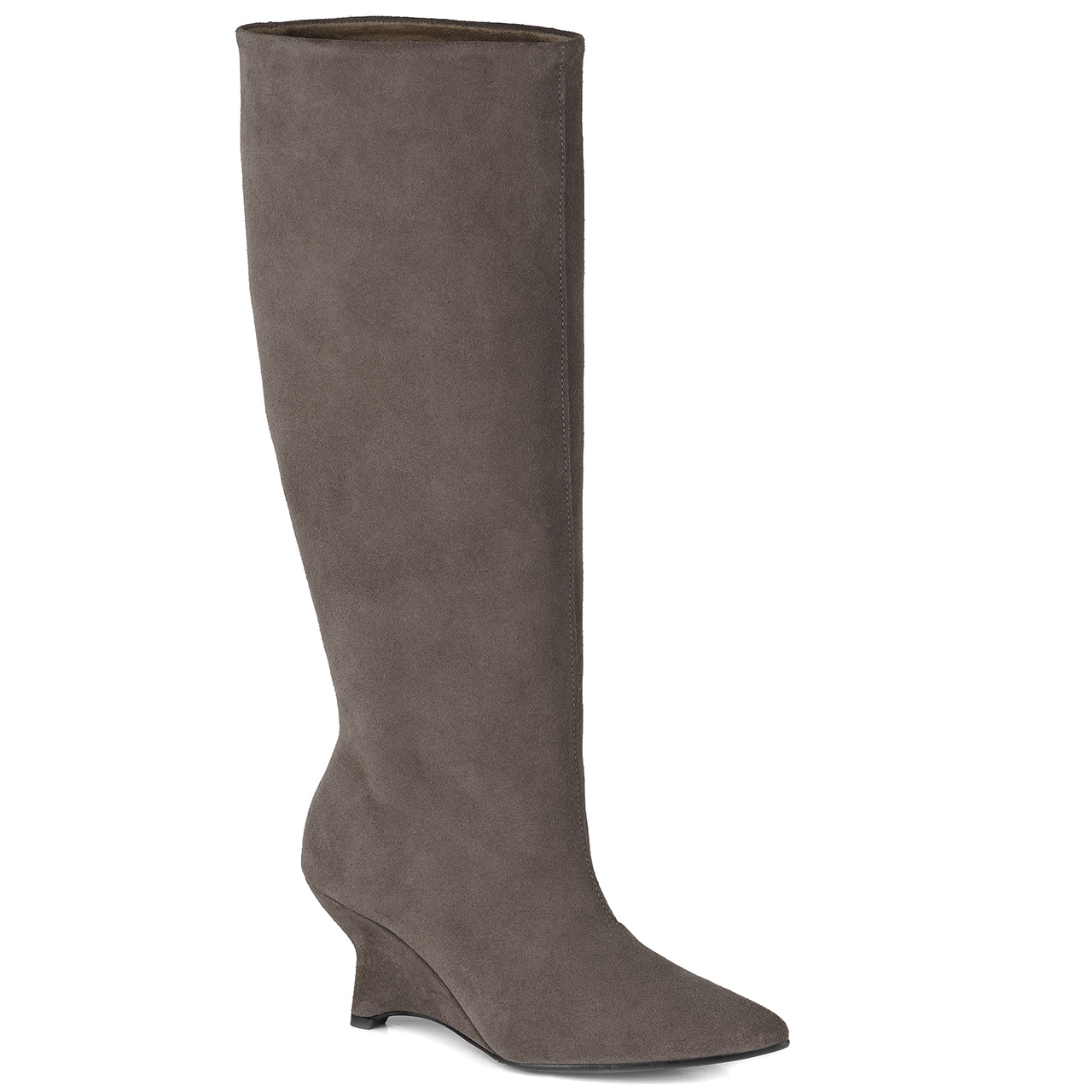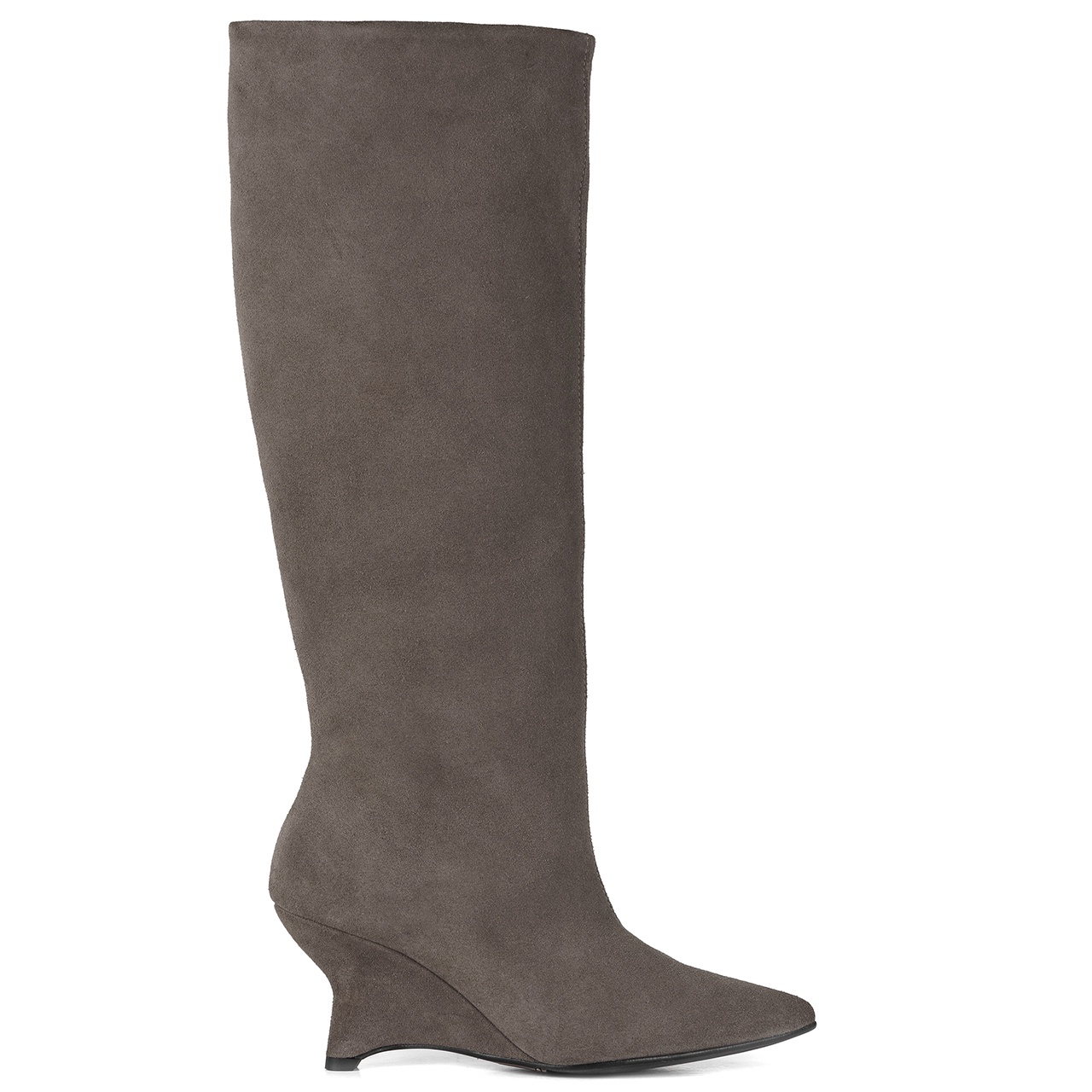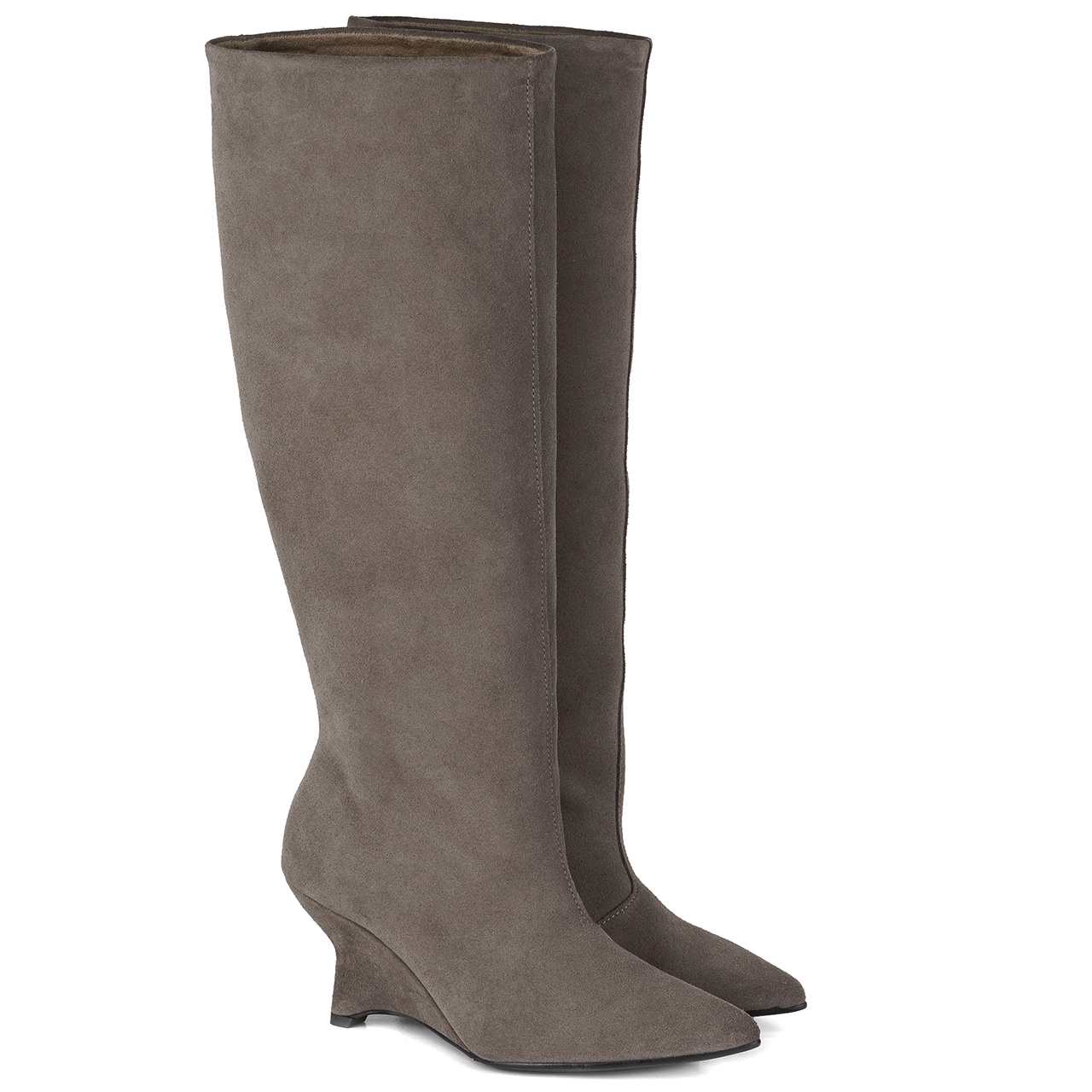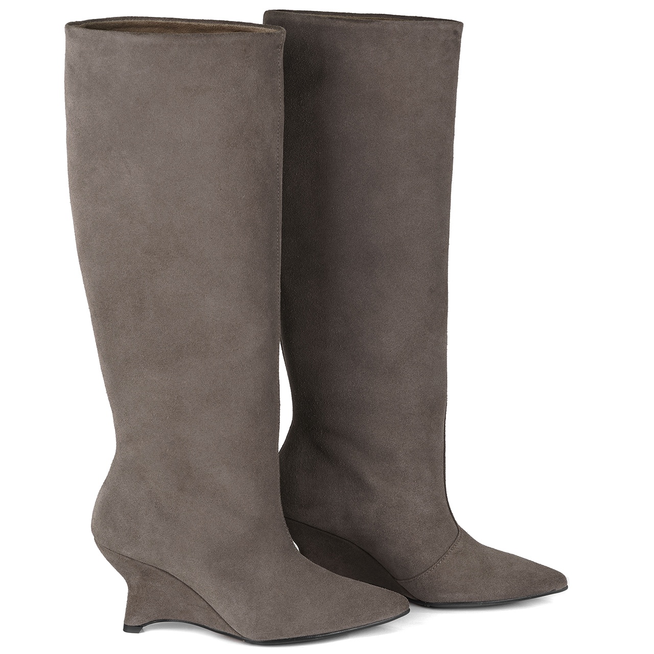 Kawowe welurowe długie kozaki z szeroką, usztywnioną cholewką na wysokim koturnie - obcasie. Obuwie wykonano ze skóry naturalnej welurowej. Charakterystyczny obcas dodaje elegancji. Kozaki to idealny modny wybór w każdej porze roku. Obcas w kozakach wynosi około 8 cm. Noski butów w szpic. Obwód cholewki na górze wynosi około 39 cm w kostce około 30 cm, a jej wysokość mierzona od obcasa wynosi około 39 cm. Podszewka wykonana jest z materiału tekstylnego, a wkładka z filcu. Wymiary podawane na kartach produktów to wymiary orientacyjne i odnoszą się do rozmiaru 37.