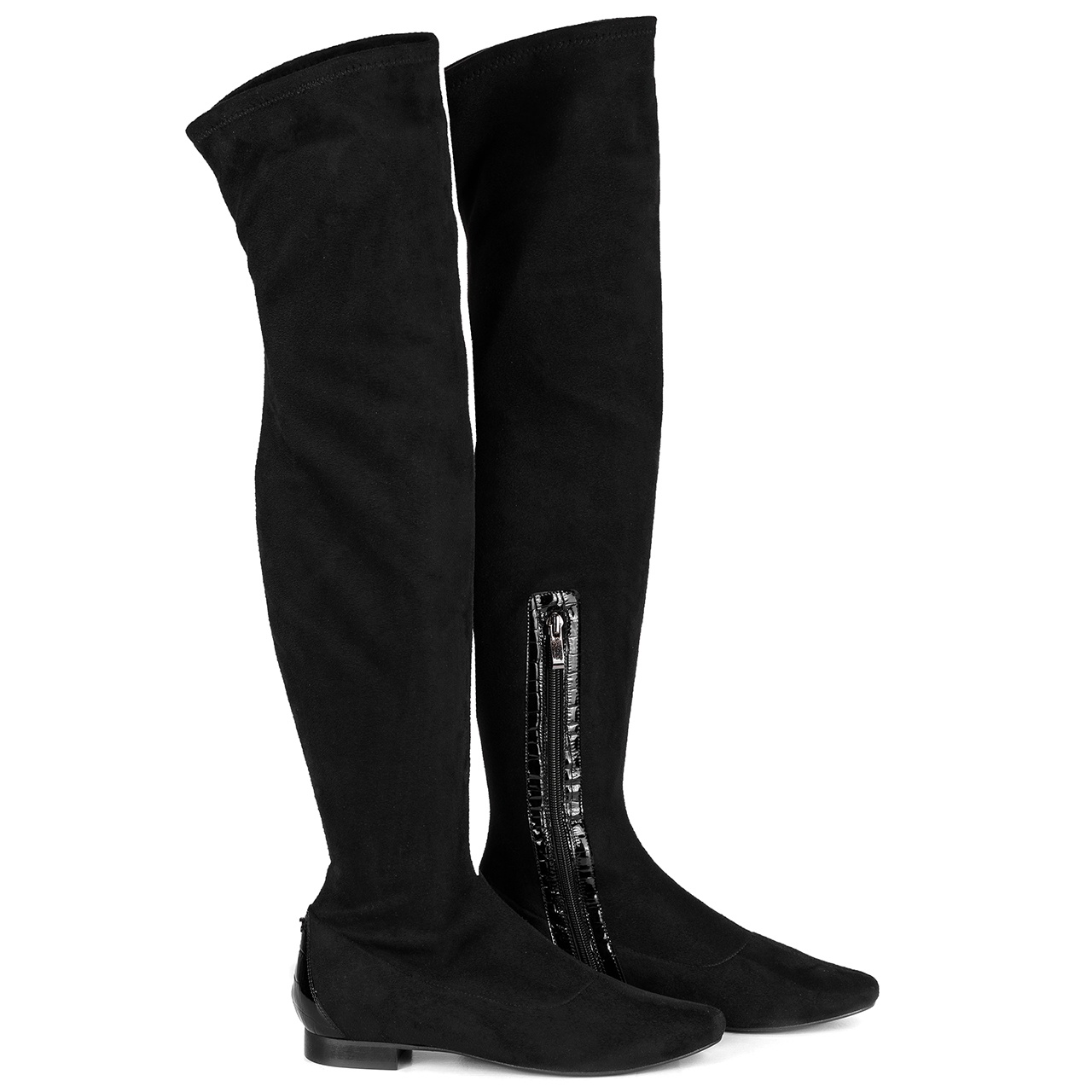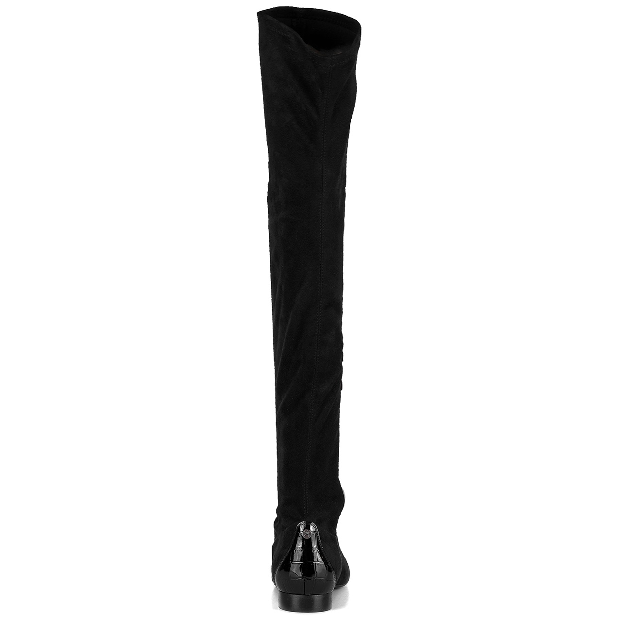 Czarne kozaki na niskim 2 cm obcasie. Kozaki wykonane są z elastycznego, zamszowego materiału-lycry. Kozaki posiadają zamek. Noski kozaków okrągłe. Z tyłu buta umieszczono skórę lakierowaną w wężowy wzór. Szerokość cholewki na górze około 38 cm, przy kostce około 21 cm, a jej wysokość mierzona od obcasa wynosi około 48 cm. Wymiary podawane na kartach produktów to wymiary orientacyjne i odnoszą się do rozmiaru 37.