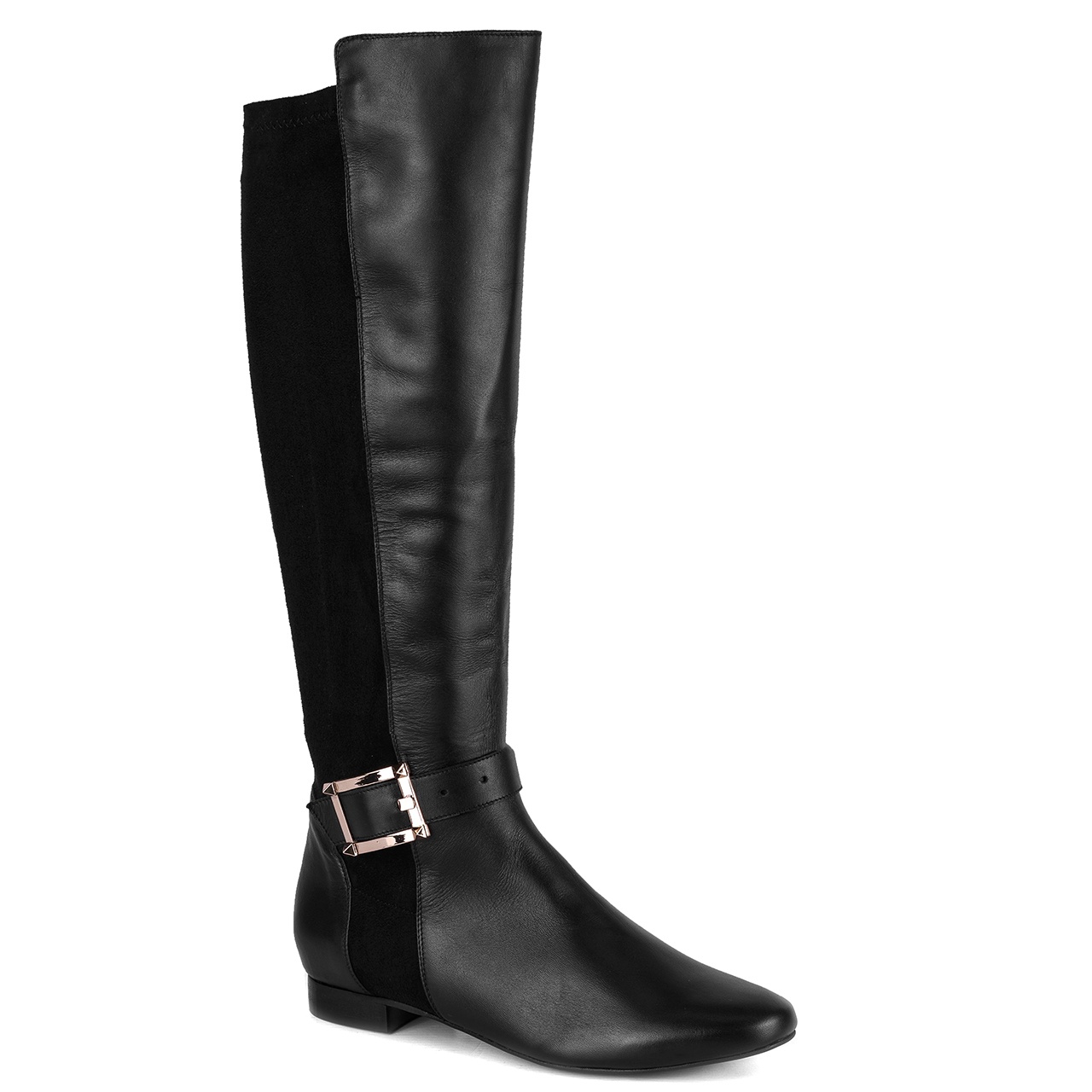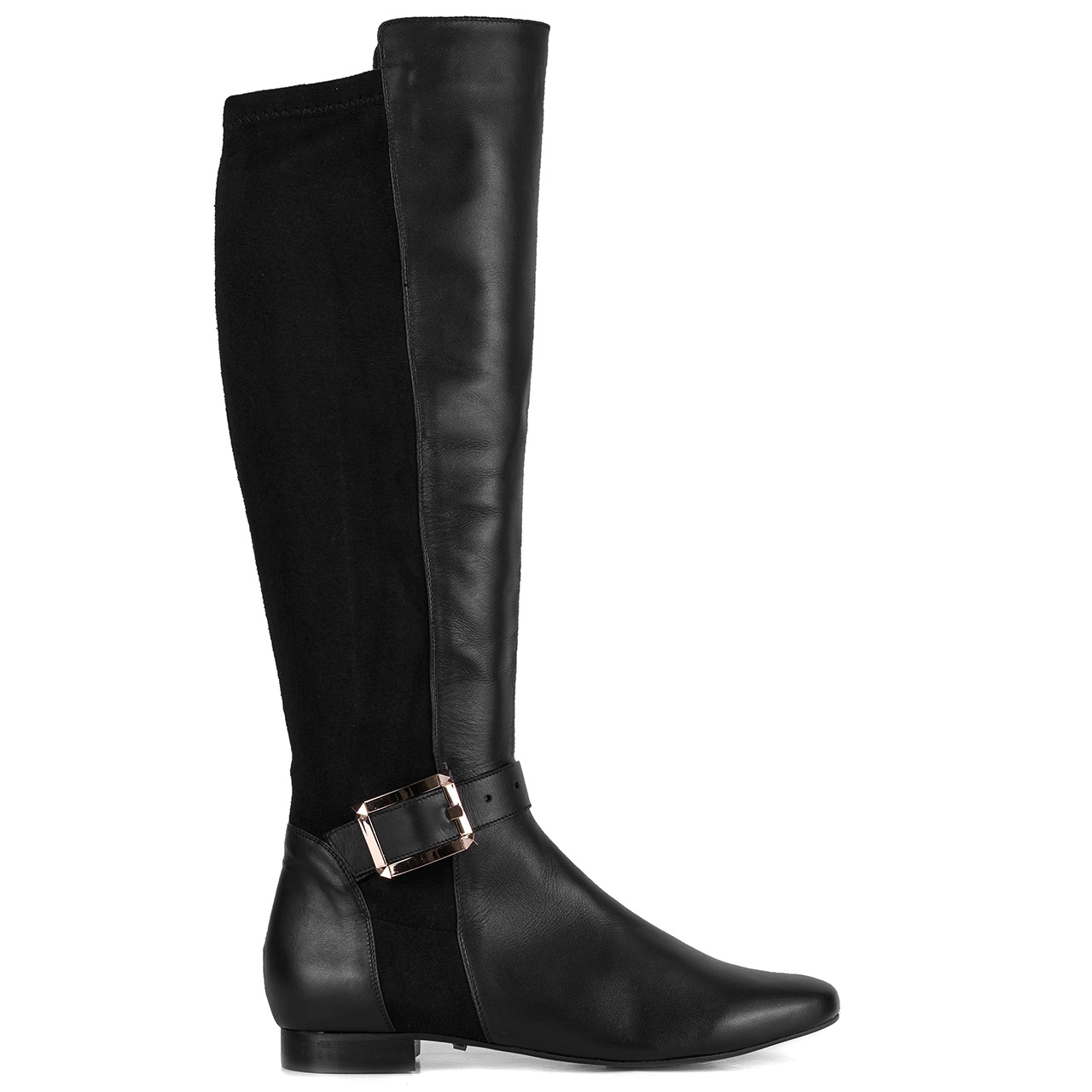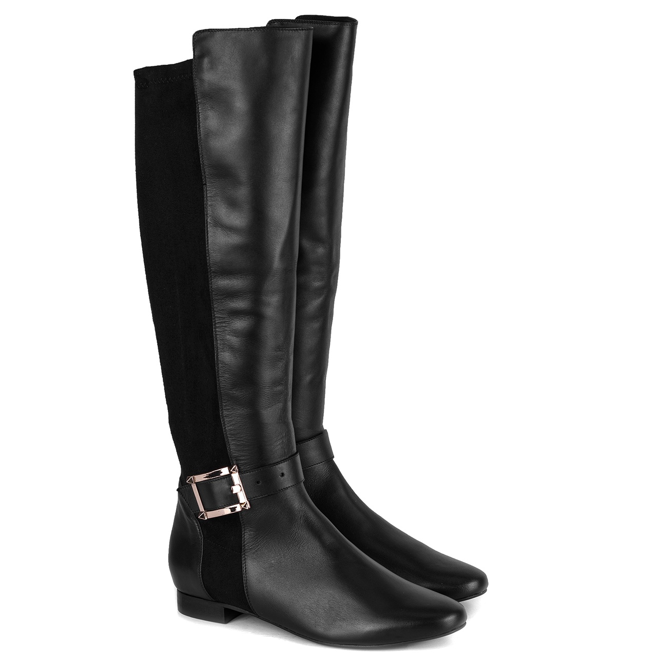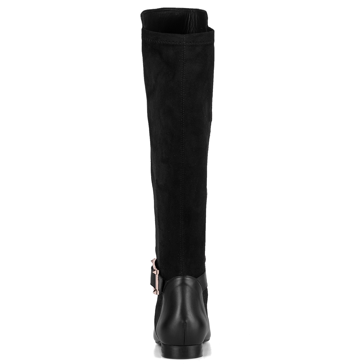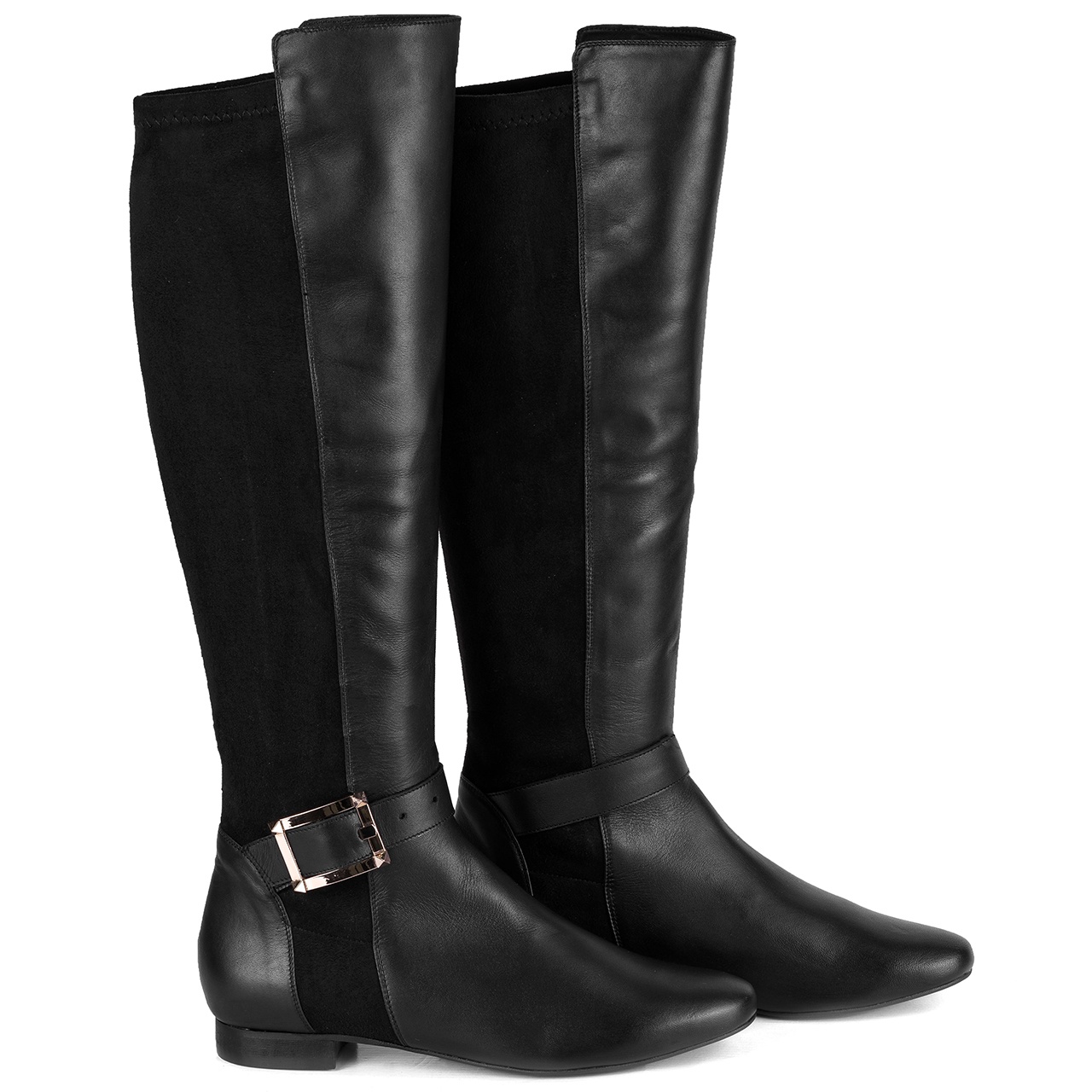 Czarne kozaki z klamrą w kolorze złotym na niskim 2 cm obcasie. Kozaki wykonane są ze skóry licowej i elastycznego, zamszowego materiału-lycry. Kozaki nie posiadają zamka. Noski kozaków okrągłe. Szerokość cholewki na górze około 35 cm, przy kostce około 22 cm, a jej wysokość mierzona od obcasa wynosi około 40 cm. Wymiary podawane na kartach produktów to wymiary orientacyjne i odnoszą się do rozmiaru 37.