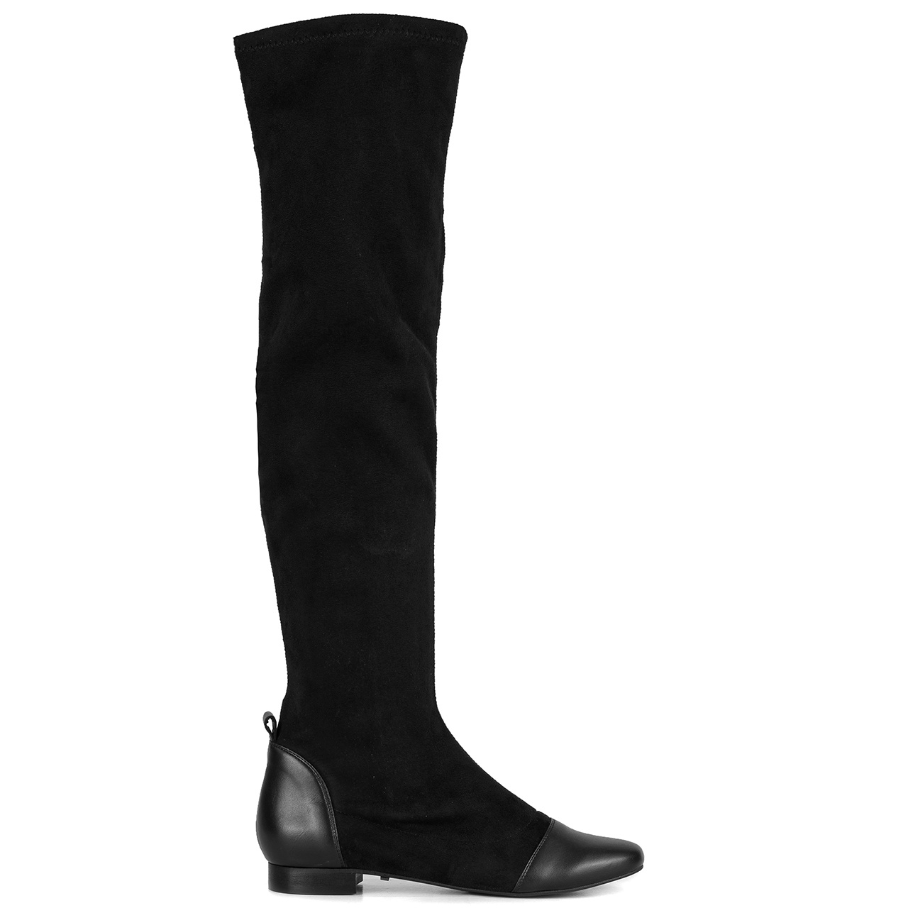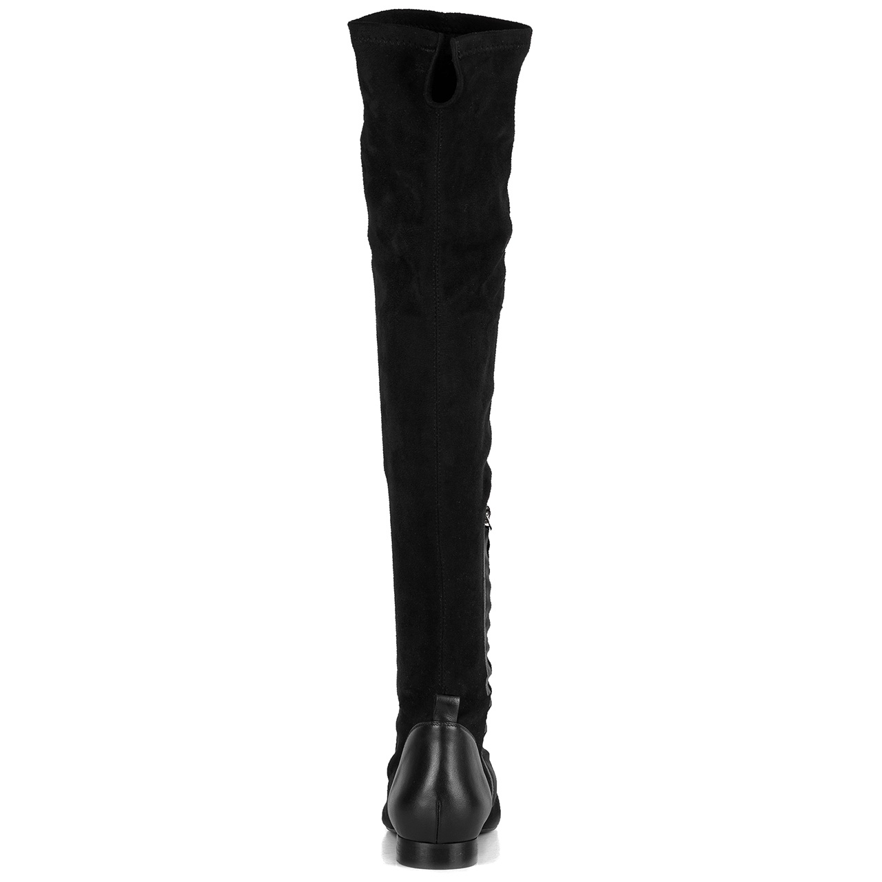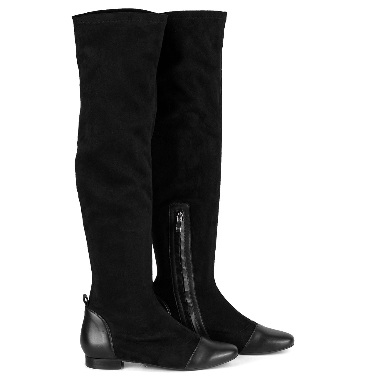 Czarne kozaki na niskim 2 cm obcasie. Kozaki wykonane są z elastycznego, zamszowego materiału-lycry. Kozaki posiadają zamek. Okrągłe noski kozaków wykonano ze skóry naturalnej. Szerokość cholewki na górze około 38 cm, przy kostce około 24 cm, a jej wysokość mierzona od obcasa wynosi około 46 cm. Wymiary podawane na kartach produktów to wymiary orientacyjne i odnoszą się do rozmiaru 37.