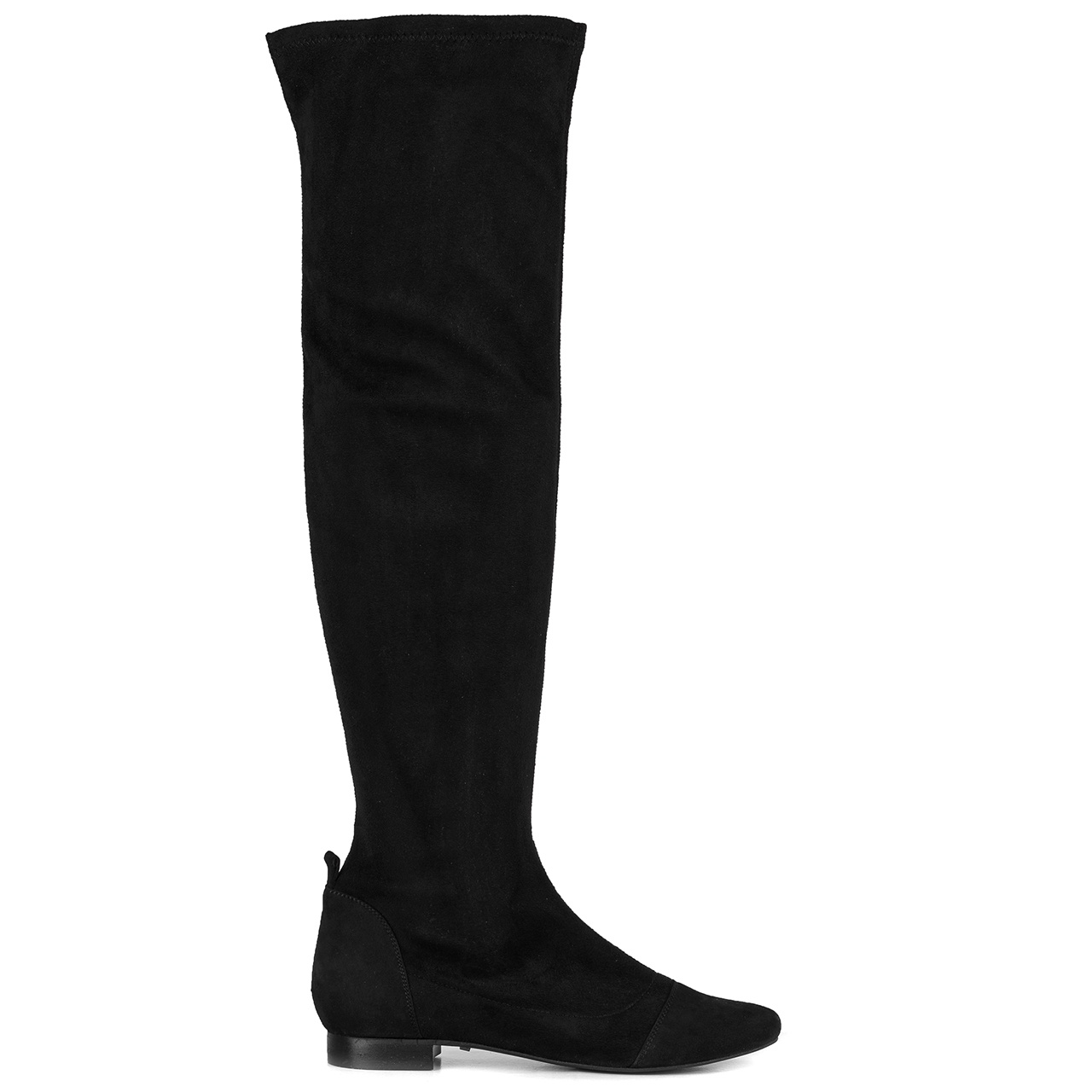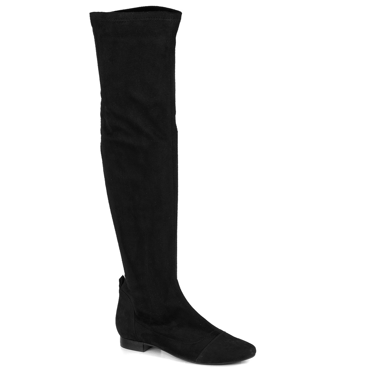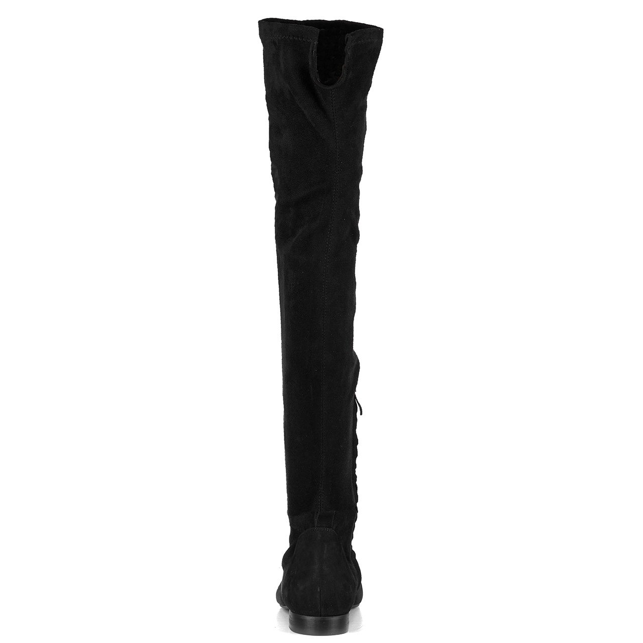 Czarne kozaki na niskim 2 cm obcasie. Kozaki wykonane są z elastycznego, zamszowego materiału-lycry. Kozaki posiadają zamek. Okrągłe noski kozaków wykonano z naturalnego zamszu. Szerokość cholewki na górze około 38 cm, przy kostce około 24 cm, a jej wysokość mierzona od obcasa wynosi około 46 cm. Wymiary podawane na kartach produktów to wymiary orientacyjne i odnoszą się do rozmiaru 37.