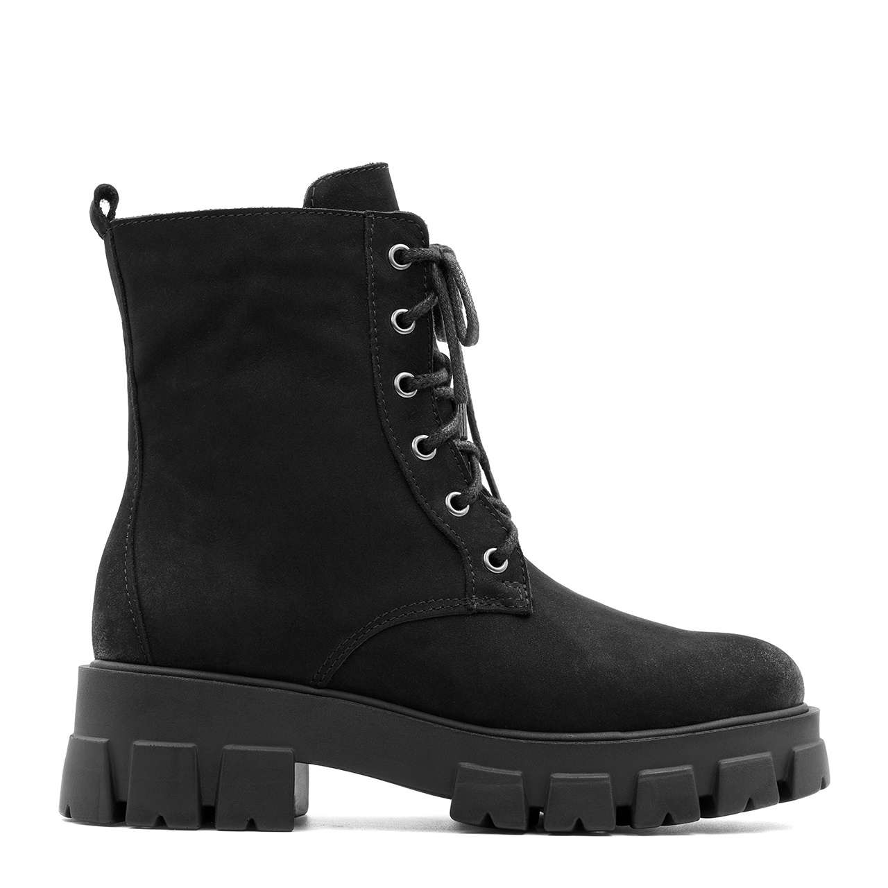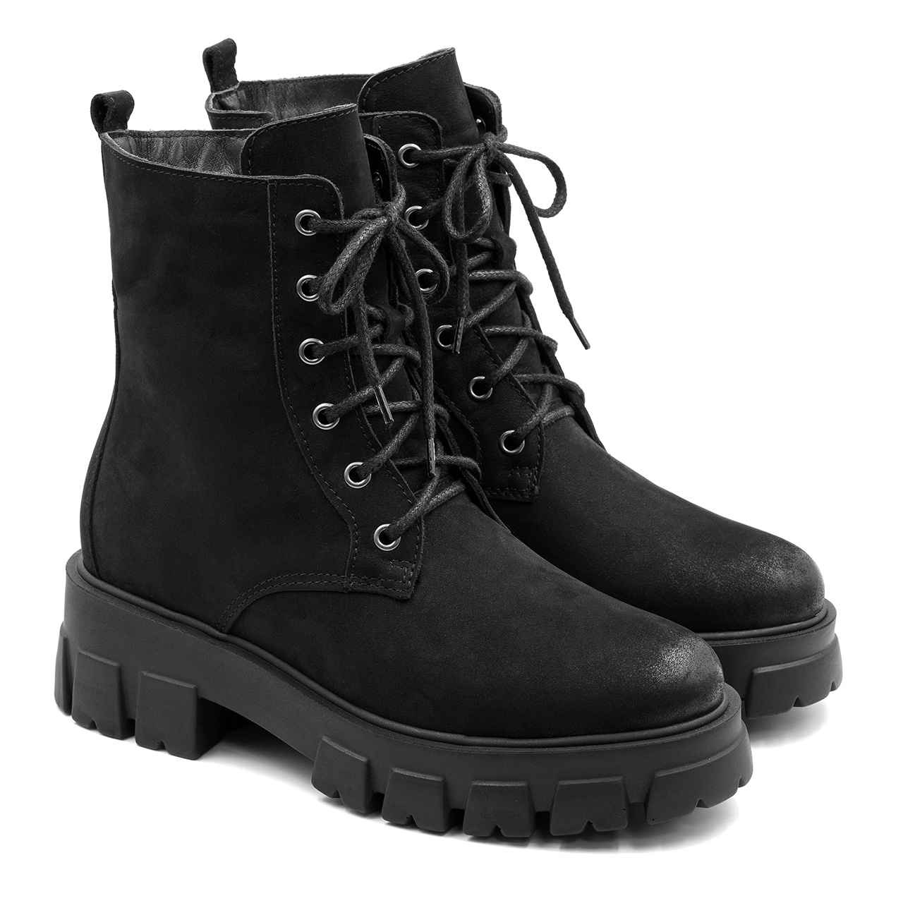 Czarne sznurowane botki z naturalnej skóry nubukowej na grubej podeszwie. Grubość podeszwy z przodu buta wynosi 3 cm, z tyłu 5 cm. Od wewnętrznej strony cholewki wszyto suwak. Przód buta zaokrąglony. Podszewka i wkładka wykonane są z filcu. Szerokość cholewki na górze około 23 cm, a jej wysokość mierzona od obcasa wynosi około 11 cm. Wymiary podawane na kartach produktów to wymiary orientacyjne i odnoszą się do rozmiaru 37.