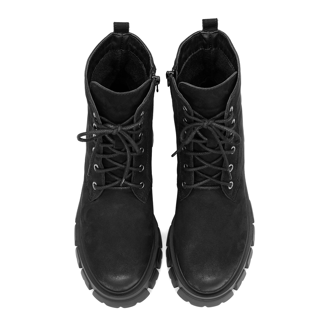 Czarne sznurowane botki, sztyblety z naturalnej skóry nubukowej na grubej podeszwie. Grubość podeszwy z przodu buta wynosi 3 cm, z tyłu 5 cm. Od wewnętrznej strony cholewki wszyto suwak. Przód buta zaokrąglony. Podszewka i wkładka wykonane są z filcu. Szerokość cholewki na górze około 23 cm, a jej wysokość mierzona od obcasa wynosi około 11 cm. Wymiary podawane na kartach produktów to wymiary orientacyjne i odnoszą się do rozmiaru 37.