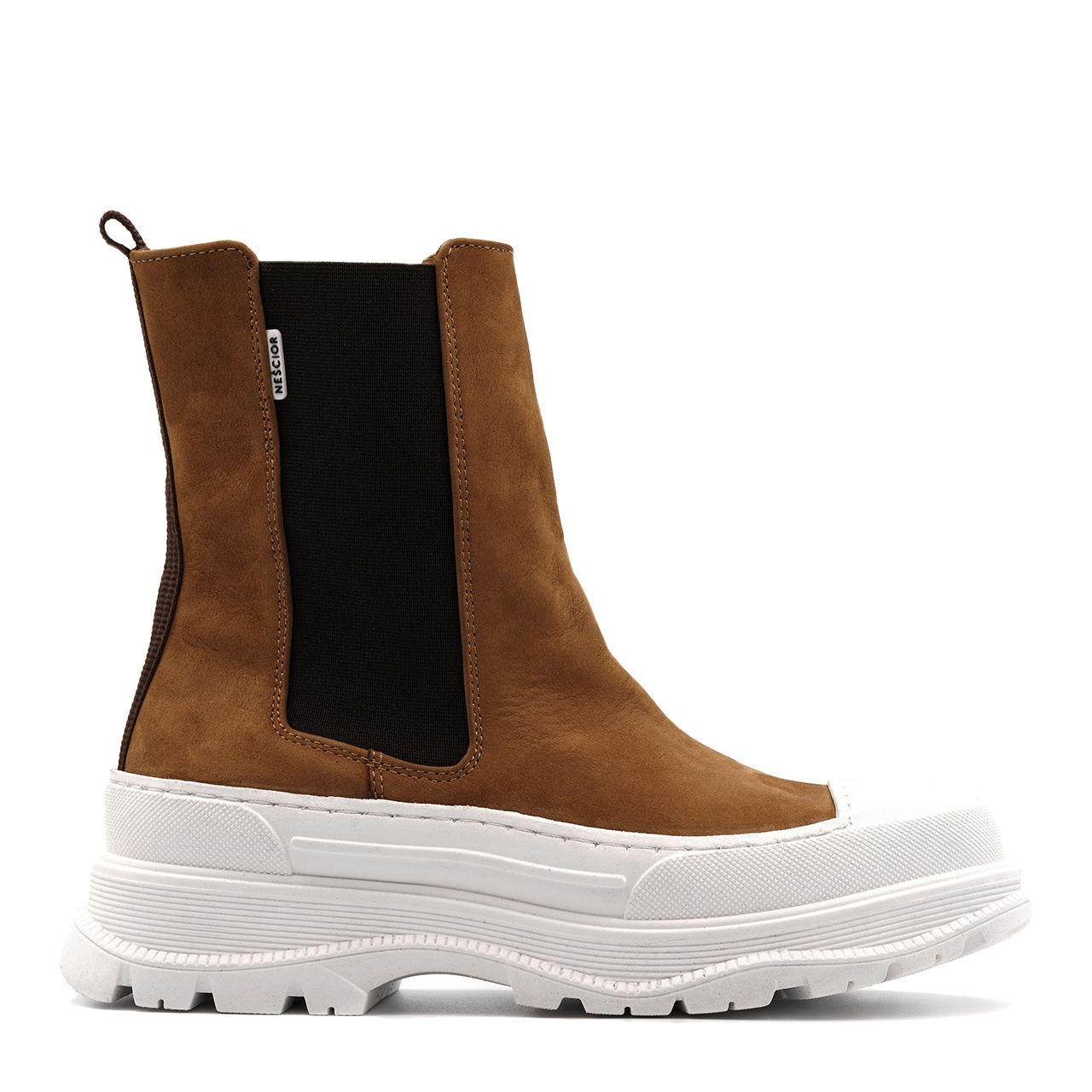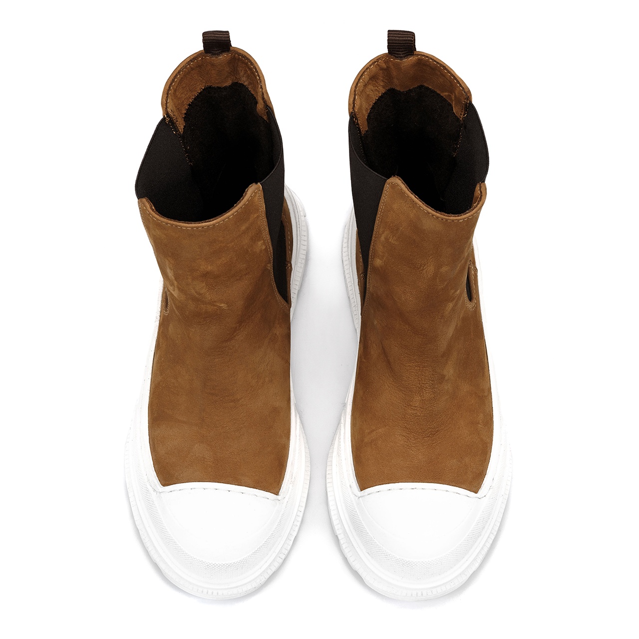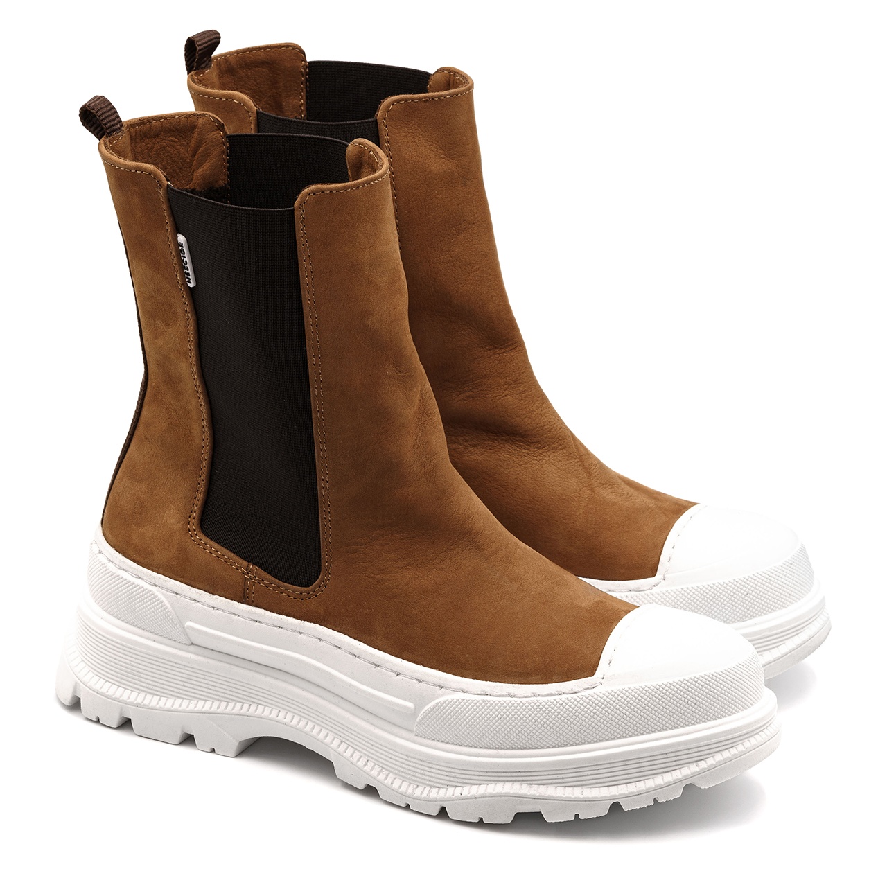 Koniakowe wsuwane botki na grubej, białej podeszwie. Obuwie wykonano z naturalnej skóry nubukowej. Cholewkę botków przyklejono i przyszyto do podeszwy, której grubość z przodu wynosi około 4,5 cm, z tyłu około 6,5 cm. Po bokach ocieplonej cholewki wszyto szeroką gumę. Nosek w przedstawionym modelu jest gumowy. Podszewkę i wkładkę w botkach wykonano z filcu. Szerokość cholewki na górze to 26 cm po rozciągnięciu około 36 cm. Wysokość mierzona od obcasa wynosi około 16 cm. Wymiary podawane na kartach produktów to wymiary orientacyjne i odnoszą się do rozmiaru 37.