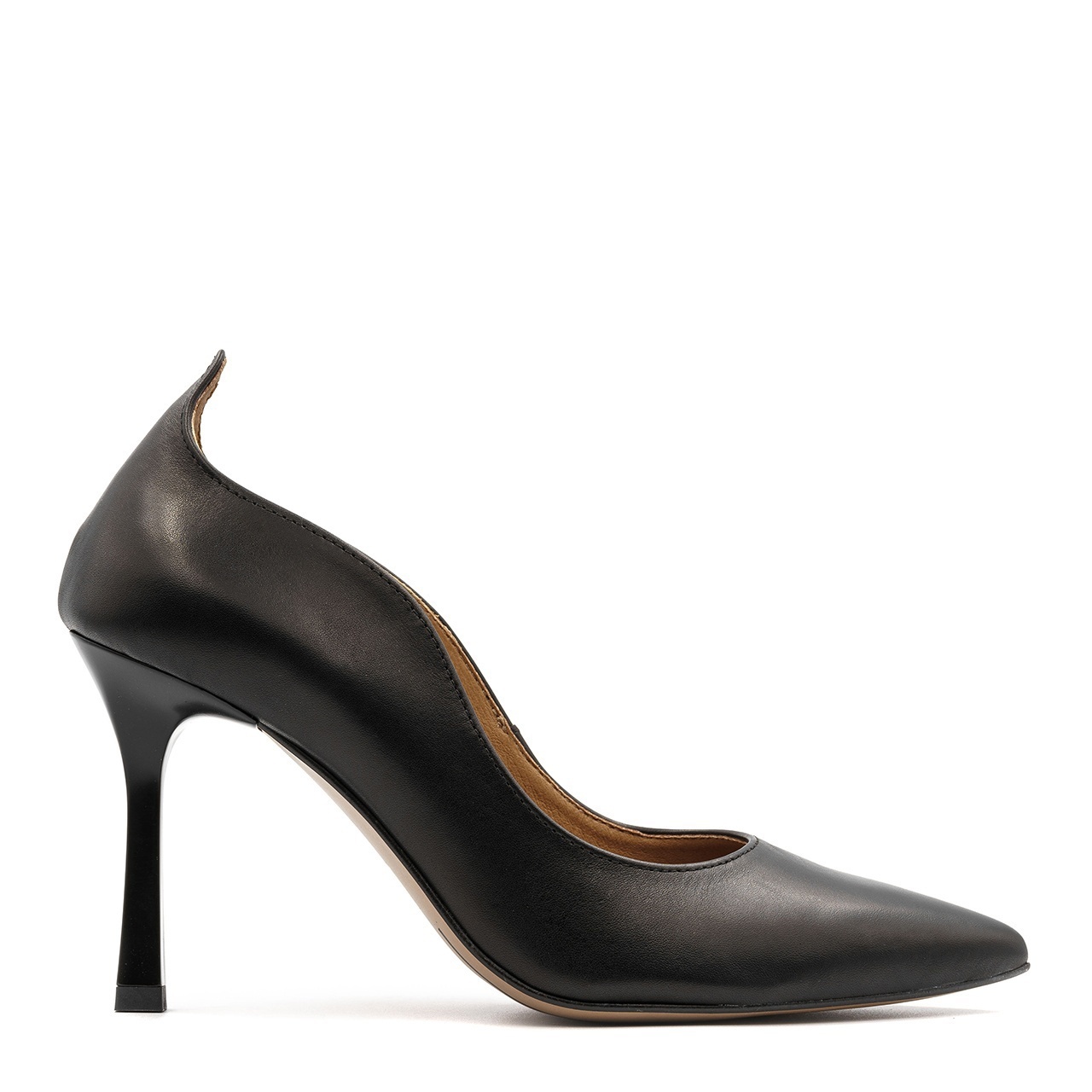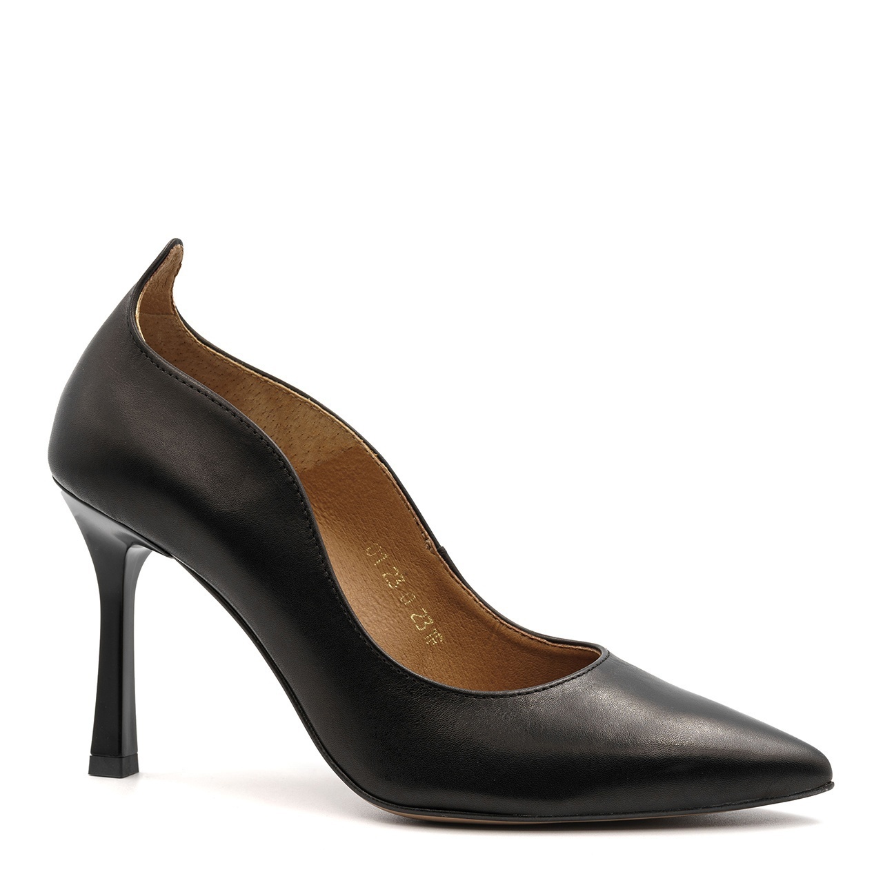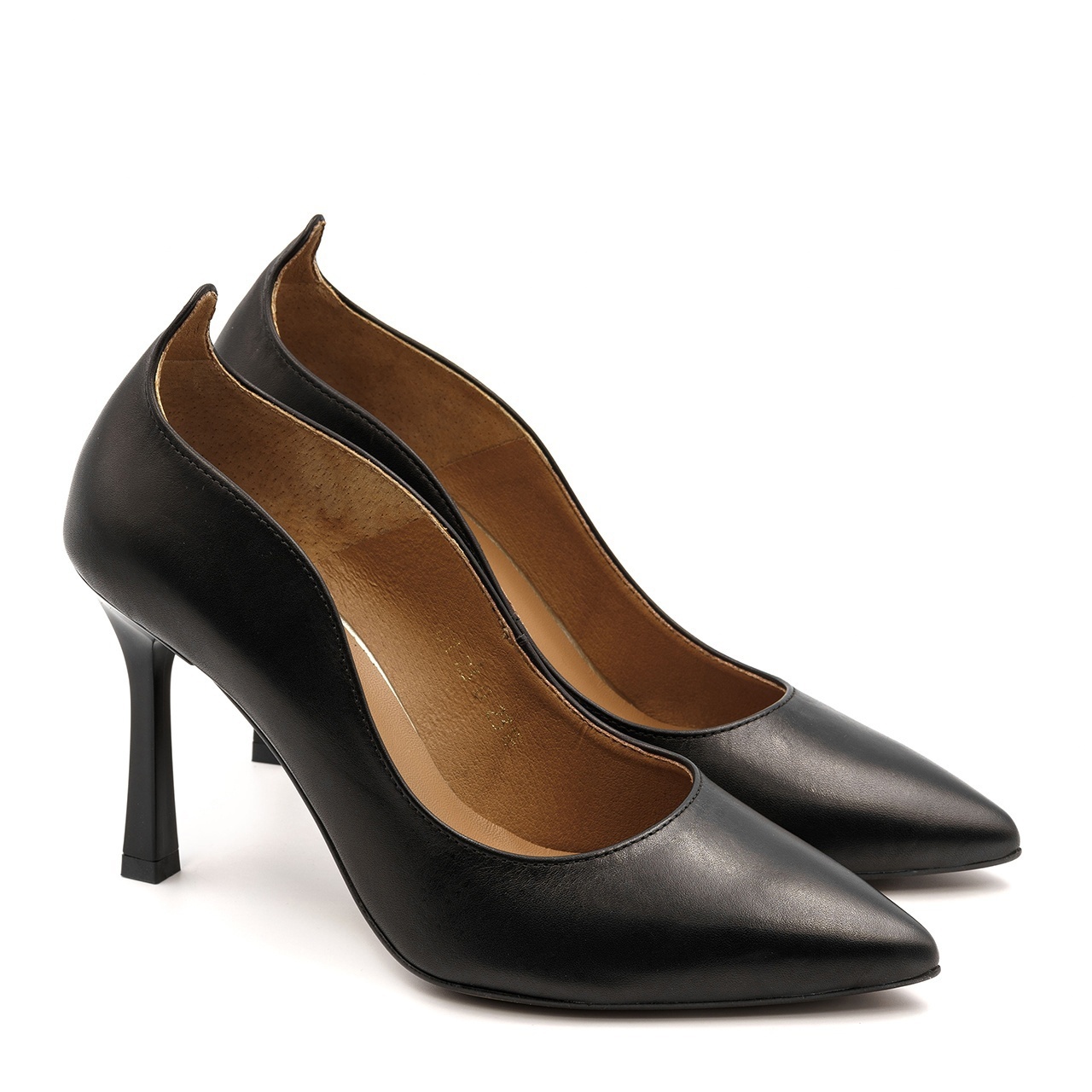 Buty powystawowe, mogą nosić ślady przymierzania. Eleganckie czarne szpilki wyprodukowano z naturalnej skóry licowej. Buty wyróżnia falowana cholewka butów, która pięknie układa się na stopie. Przód buta w delikatny szpic. Buty na 9 cm stabilnej szpilce. Wkładki w butach wykonane są ze skóry naturalnej.