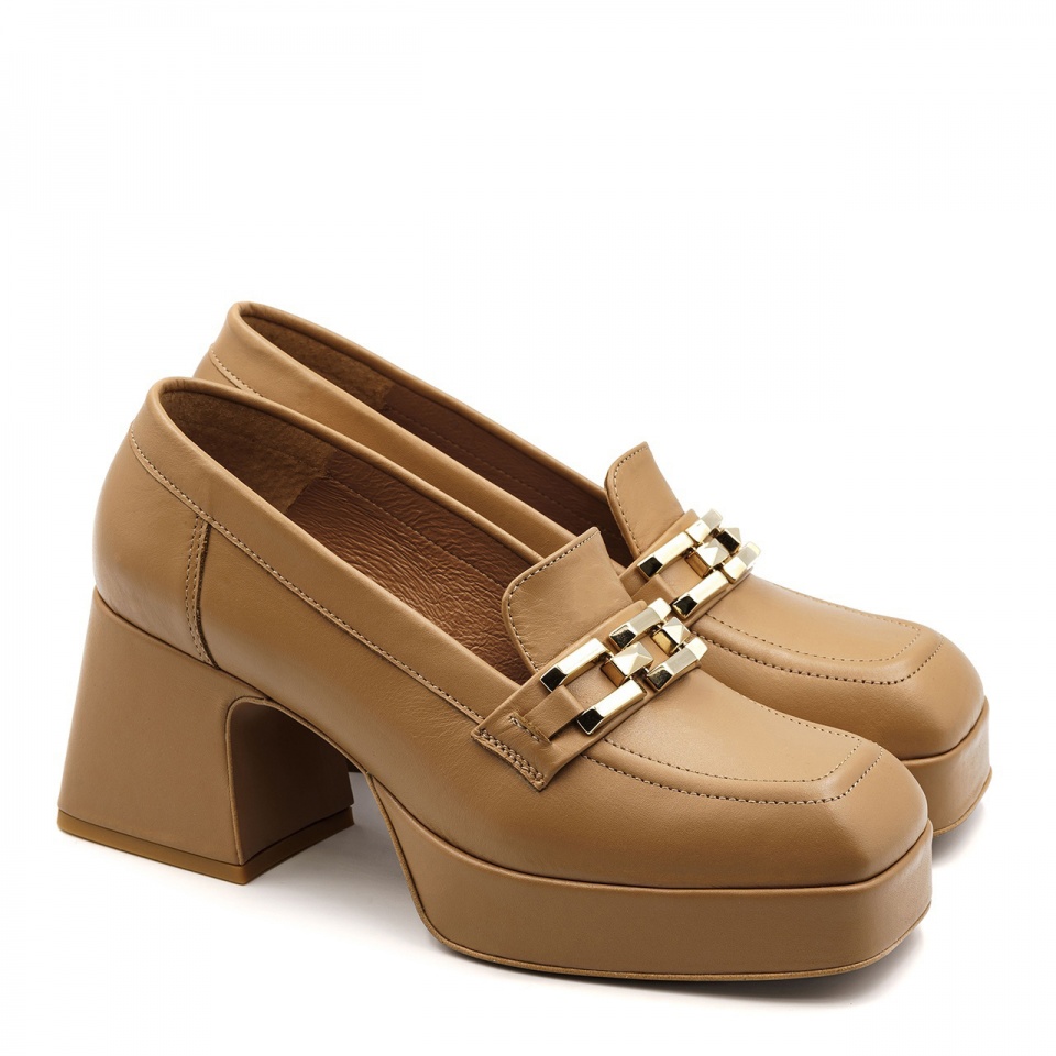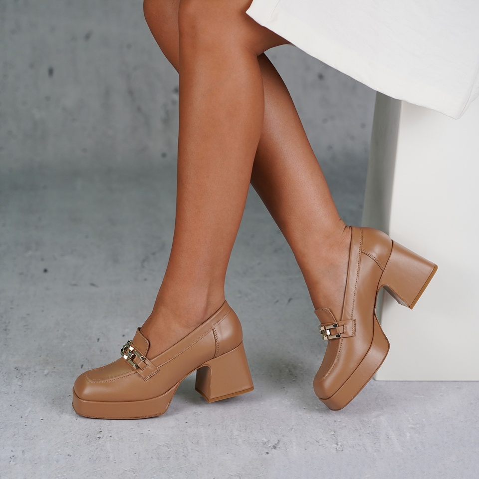 Karmelowe skórzane półbuty na 7 cm masywnym obcasie. Obuwie wyprodukowano z naturalnej skóry licowej. Kwadratowe noski butów ozdobiono łańcuchem w kolorze złotym o prostokątnych ogniwach. Wkładka w butach jest skórzana. Wymiary podawane na kartach produktów to wymiary orientacyjne i odnoszą się do rozmiaru 37.