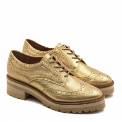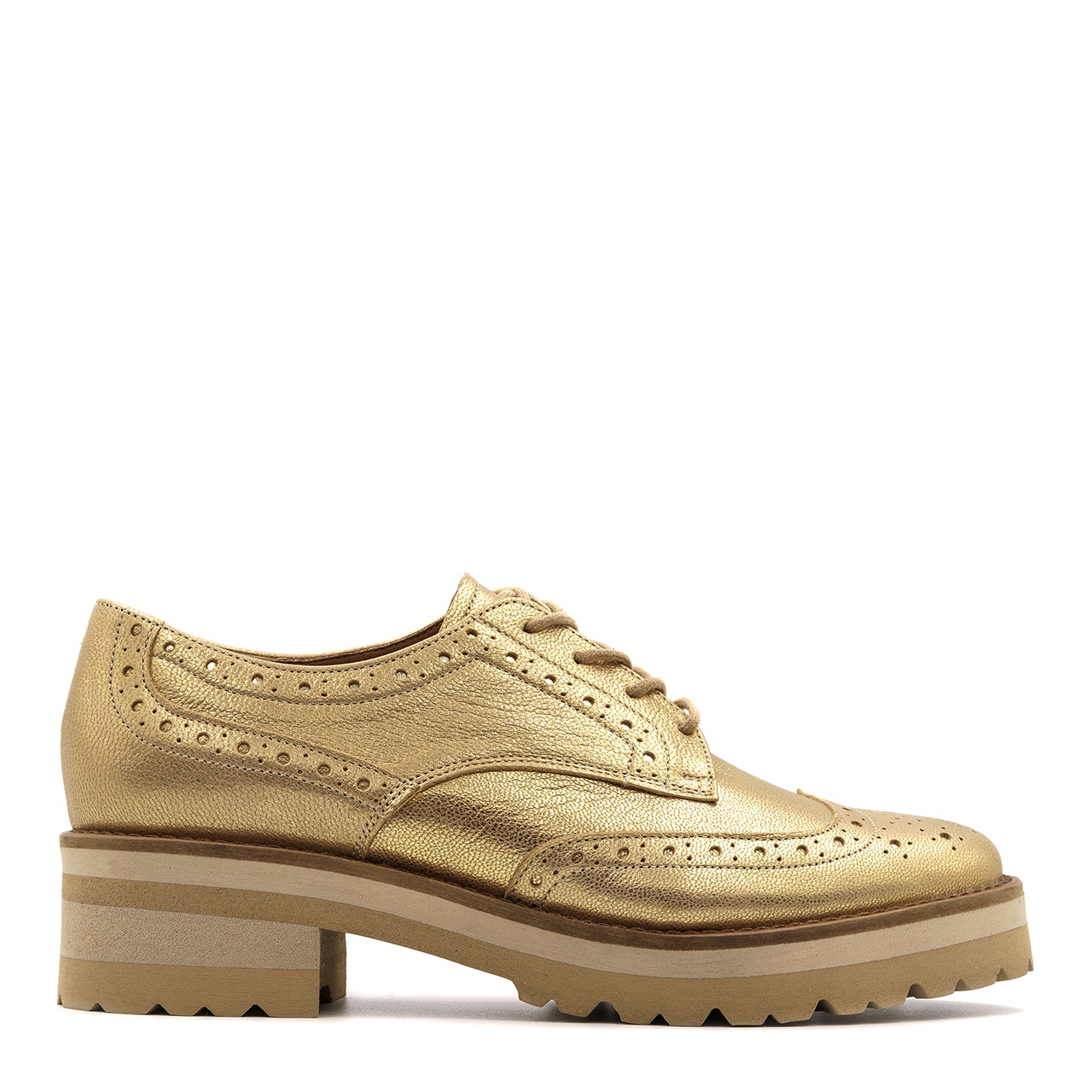 Złote, wiązane półbuty na grubej podeszwie wykonano z naturalnej skóry. Buty charakteryzują się cholewką z ozdobną perforacją. Noski półbutów w typu wingtip. Wysokość podeszwy z przodu buta wynosi około 2,5 cm, z tyłu około 4,5 cm. Na podeszwie widoczne delikatne przeszycie. Wkładki w półbutach są ze skóry naturalnej. Wymiary podawane na kartach produktów to wymiary orientacyjne i odnoszą się do rozmiaru 37.