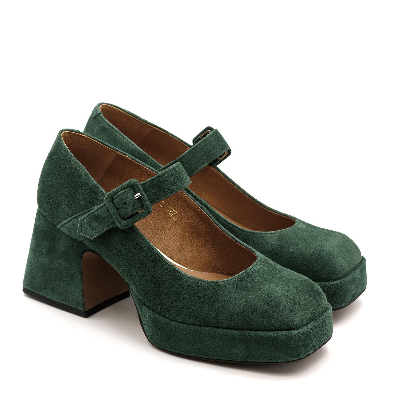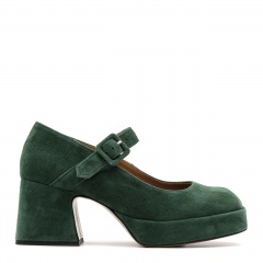 Zielone w kolorze butelkowej zieleni półbuty na 7 cm masywnym obcasie i 2,5 cm platformie. Obuwie wyprodukowano z naturalnej skóry zamszowej. Noski butów kwadratowe. Pasek zapinany na klamerkę obleczony skórą. Wkładka w butach jest skórzana. Wymiary podawane na kartach produktów to wymiary orientacyjne i odnoszą się do rozmiaru 37.
