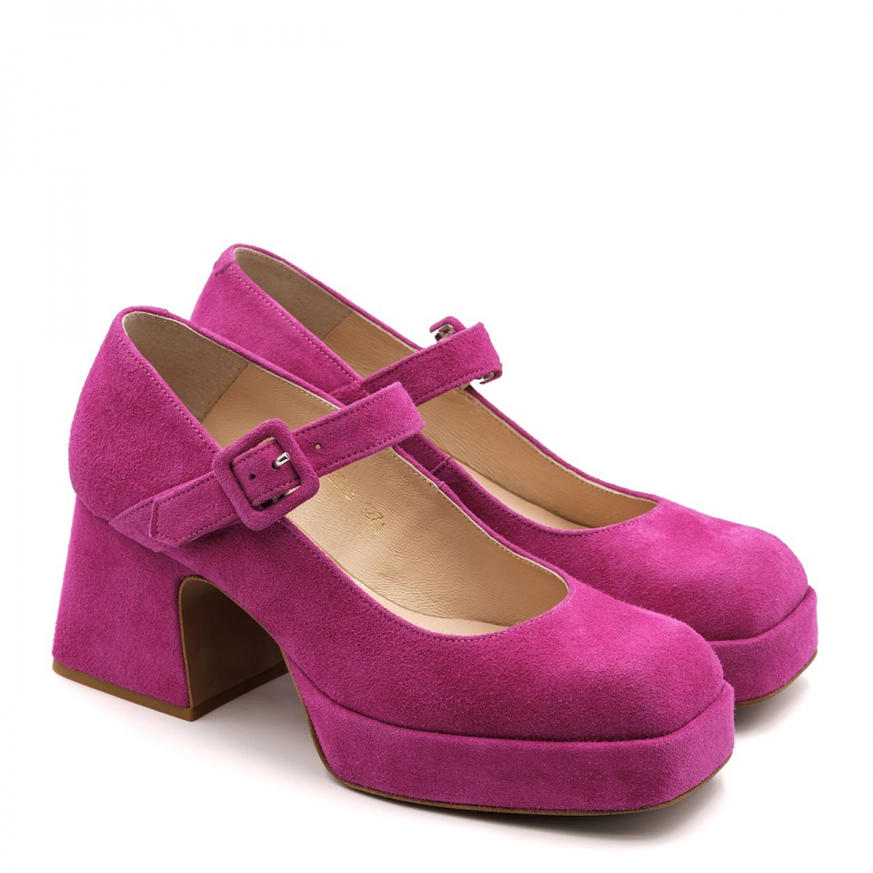 Amarantowe półbuty na 7 cm masywnym obcasie i 2,5 cm platformie. Obuwie wyprodukowano z naturalnej skóry zamszowej. Noski butów kwadratowe. Pasek zapinany na klamerkę obleczony skórą. Wkładka w butach jest skórzana. Wymiary podawane na kartach produktów to wymiary orientacyjne i odnoszą się do rozmiaru 37.