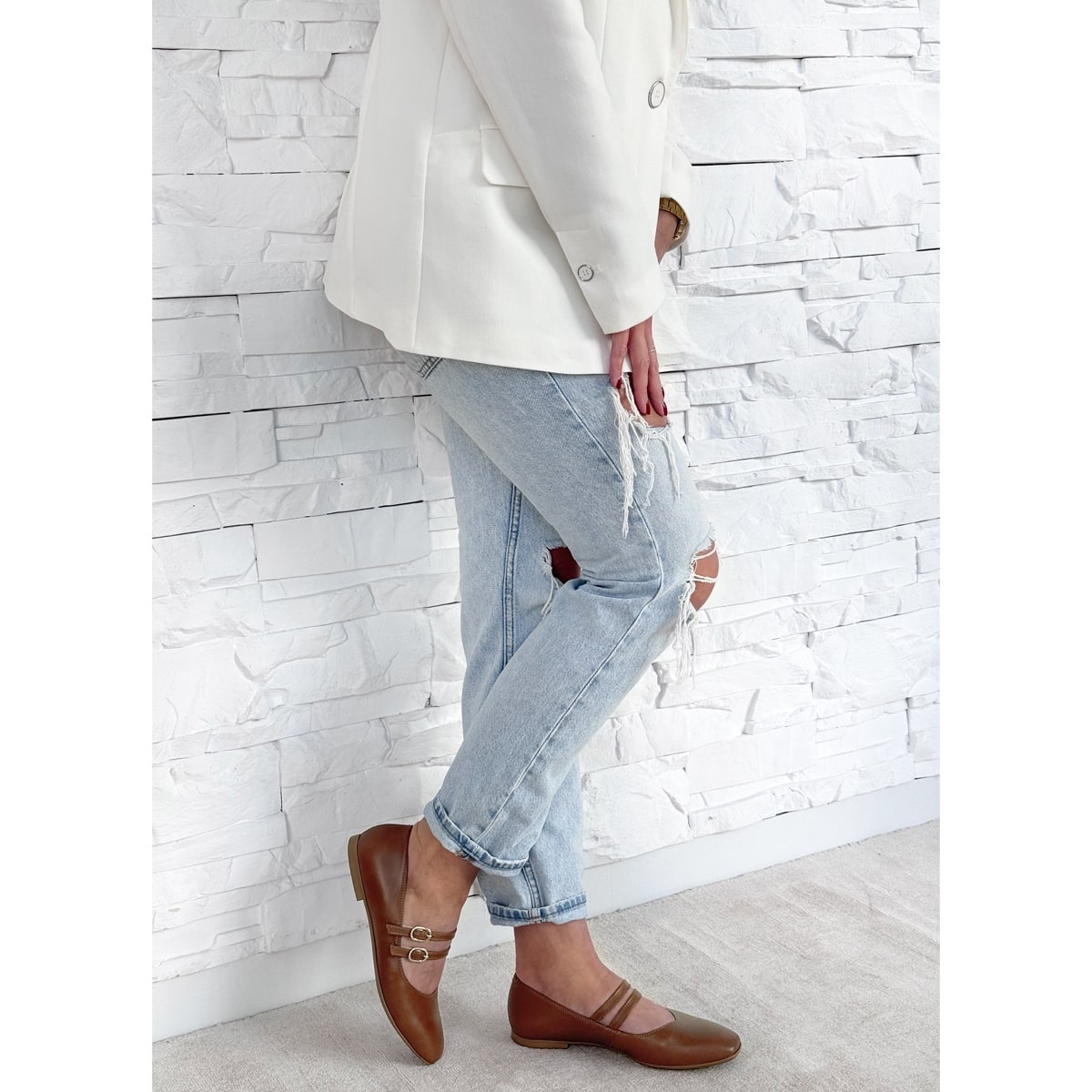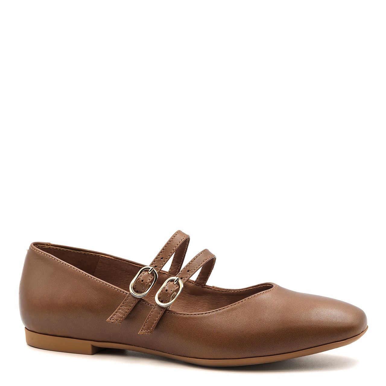 Jasnobrązowe baleriny Mary Jane to bardzo klasyczny element garderoby. Obuwie wykonano ze skóry licowej. Baleriny wyróżniają paseczki regulowane ze sprzączką w kolorze złotym. Noski w butach są lekko kwadratowe. Wkładka wykonana jest ze skóry naturalnej. Obcas wynosi około 1 cm. Wymiary podawane na kartach produktów to wymiary orientacyjne i odnoszą się do rozmiaru 37.