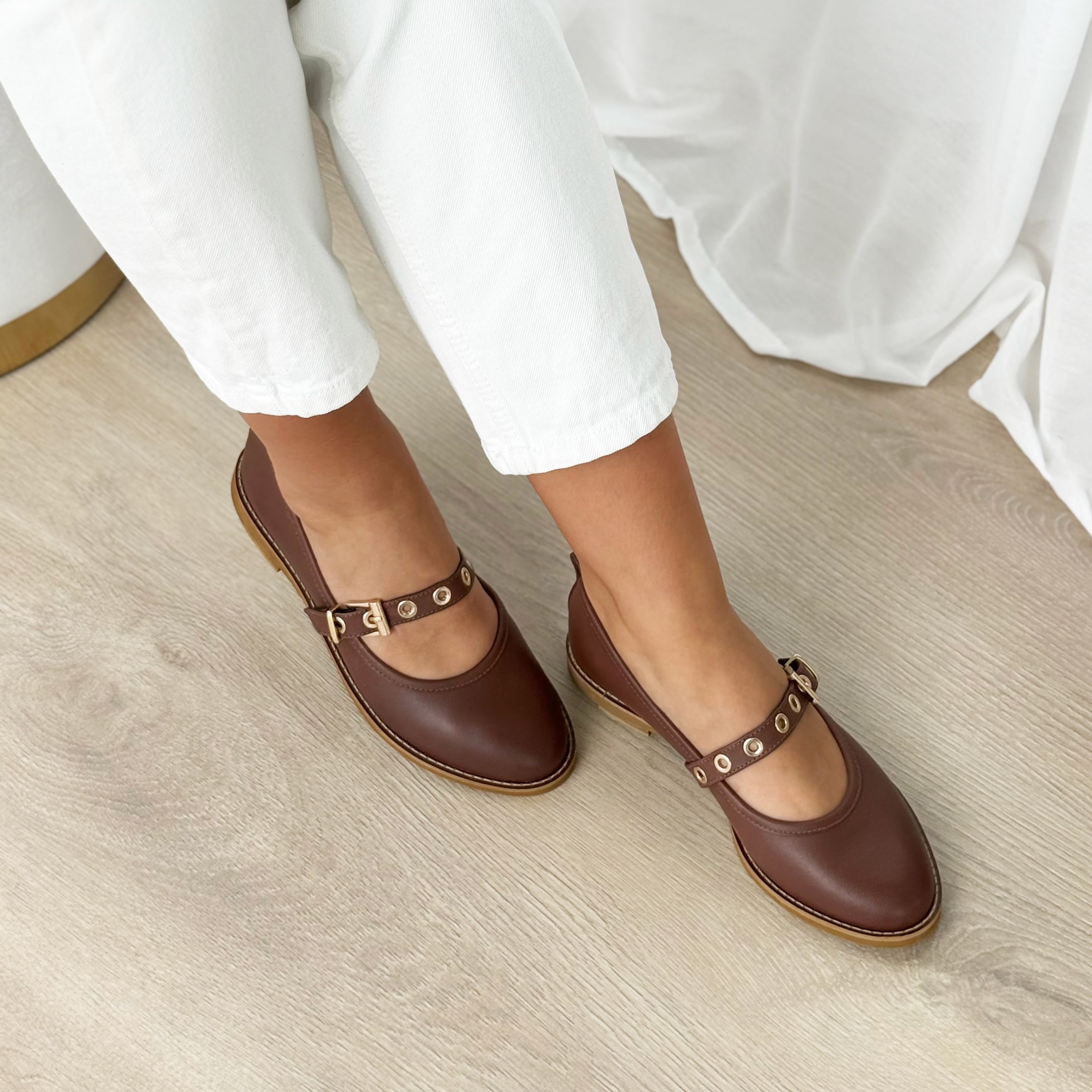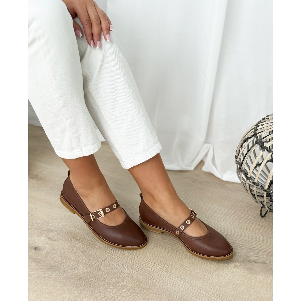 Brązowe skórzane półbuty, baleriny na niskim obcasie, który wynosi około 1,5 cm. Obuwie wykonane jest ze skóry naturalnej z lekko przyciemnionymi noskami i piętą. Wysokość podeszwy z przodu buta wynosi około 0,5 cm. Na otoku podeszwy widoczny delikatny wzór przeszycia. Baleriny wyróżnia pasek z nitami w kolorze złotym. Wkładka w butach jest wykonana ze skóry naturalnej. Wymiary podawane na kartach produktów to wymiary orientacyjne i odnoszą się do rozmiaru 37.