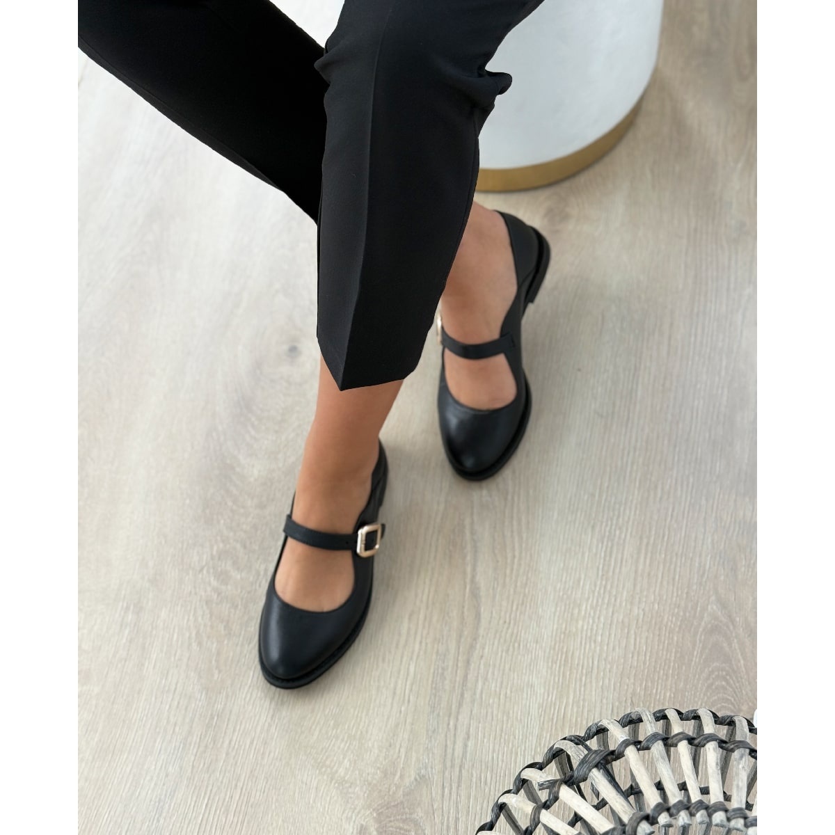 Czarne półbuty z zapięciem i ozdobną falowaną cholewką. Obuwie wykonano ze skóry naturalnej licowej. Wysokość podeszwy z przodu buta wynosi około 0,5 cm, a obcas około 1,5 cm. Na otoku podeszwy widoczny delikatny wzór przeszycia. Baleriny wyróżnia pasek zapinany na kwadratową sprzączkę w kolorze złotym. Nosek butów okrągły. Wkładka w butach jest wykonana ze skóry naturalnej. Wymiary podawane na kartach produktów to wymiary orientacyjne i odnoszą się do rozmiaru 37.