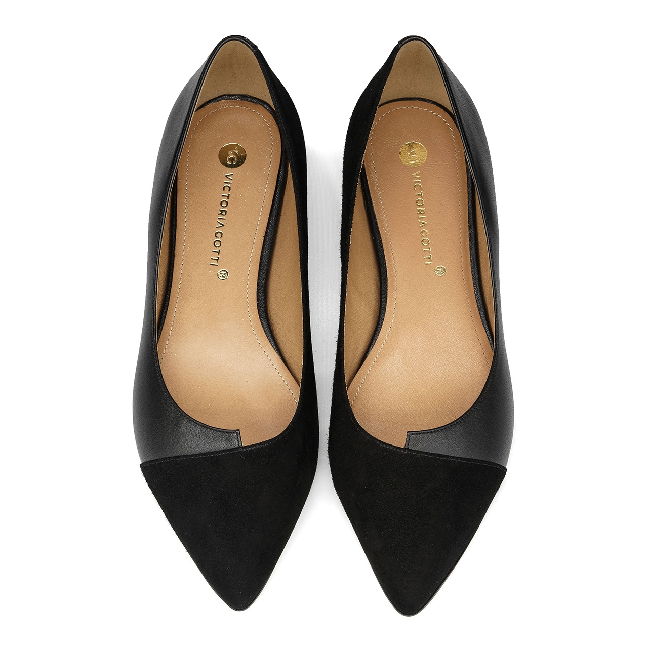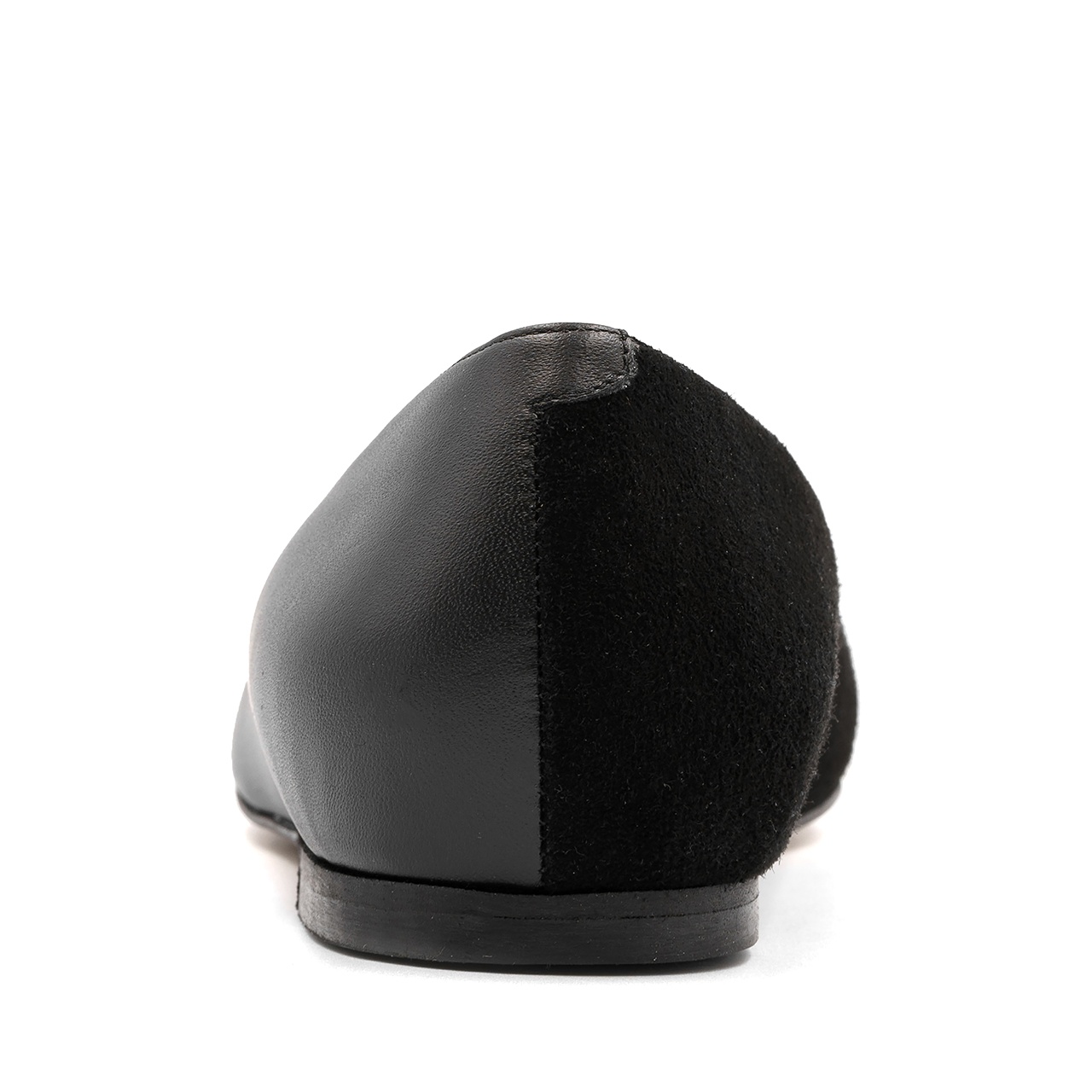 Czarne baleriny z noskiem w szpic. Obuwie wykonano z naturalnej skóry licowej z połączeniem skóry zamszowej na nosku. Wkładka w balerinach jest wykonana ze skóry naturalnej. Wysokość obcasa wynosi 1 cm. Wymiary podawane na kartach produktów to wymiary orientacyjne i odnoszą się do rozmiaru 37.