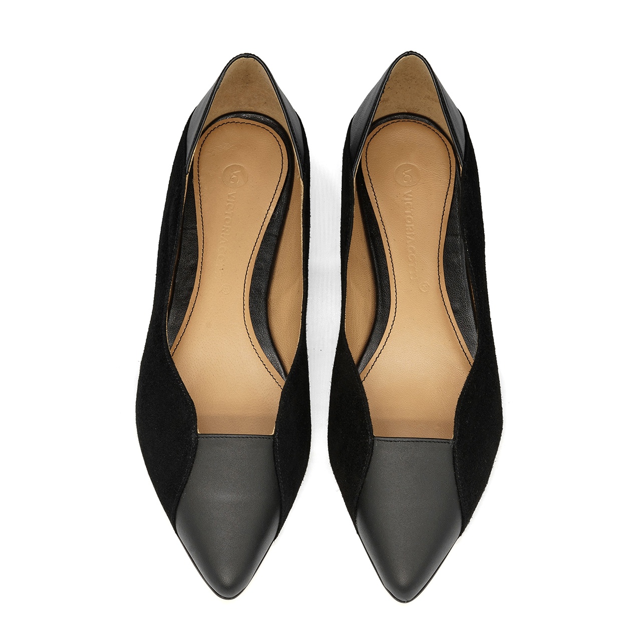 Czarne baleriny z noskiem w szpic. Obuwie wykonano z naturalnej skóry licowej z połączeniem skóry zamszowej. Wkładka w balerinach jest wykonana ze skóry naturalnej. Wysokość obcasa wynosi 1 cm. Wymiary podawane na kartach produktów to wymiary orientacyjne i odnoszą się do rozmiaru 37.