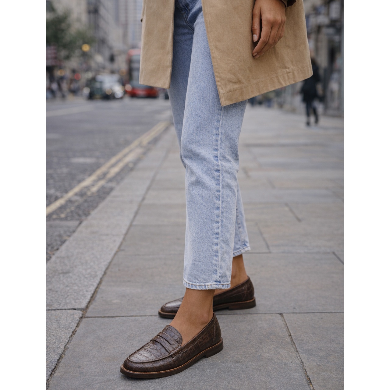 Brązowe klasyczne półbuty wykonano ze skóry naturalnej imitującej skórę krokodyla. Noski butów okrągłe. Wysokość podeszwy z przodu buta wynosi około 1 cm, z tyłu około 2,5 cm. Wkładkę wykonano ze skóry naturalnej. Na otoku podeszwy widoczny delikatny wzór przeszycia. Tęgość butów standardowa. Wymiary podawane na kartach produktów to wymiary orientacyjne i odnoszą się do rozmiaru 37.