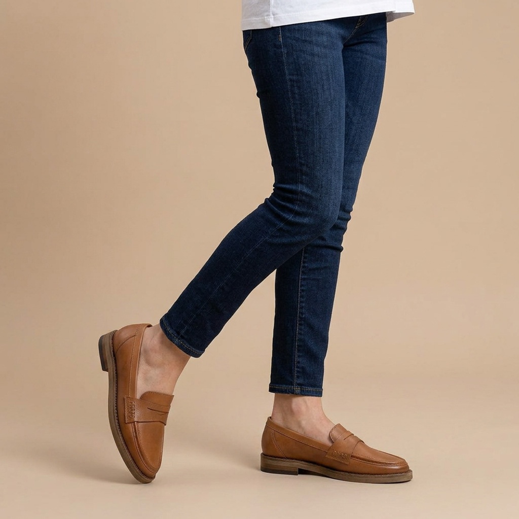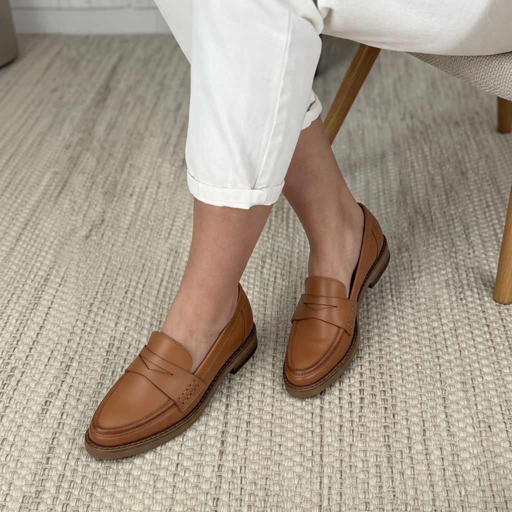 Koniakowe klasyczne półbuty wykonano ze skóry naturalnej licowej z lekkimi przyciemnionymi noskami i piętą. Noski butów okrągłe. Wysokość podeszwy z przodu buta wynosi około 1 cm, z tyłu około 2,5 cm. Wkładkę wykonano ze skóry naturalnej. Na otoku podeszwy widoczny delikatny wzór przeszycia. Tęgość butów standardowa. Wymiary podawane na kartach produktów to wymiary orientacyjne i odnoszą się do rozmiaru 37.