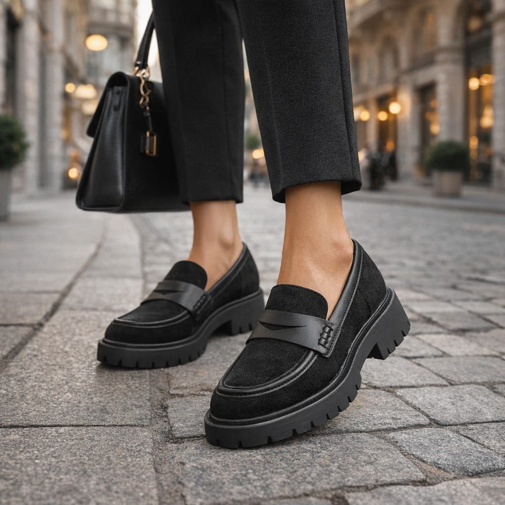 Czarne, wsuwane półbuty wykonano z naturalnej skóry welurowej z połączeniem skóry licowej. Nosek butów okrągły. Z przodu buta dodano pasek ze skóry licowej. Wysokość podeszwy z przodu buta wynosi około 2,5 cm z tyłu około 4 cm. Wkładkę wykonano ze skóry naturalnej. Tęgość butów standardowa. Wymiary podawane na kartach produktów to wymiary orientacyjne i odnoszą się do rozmiaru 37.