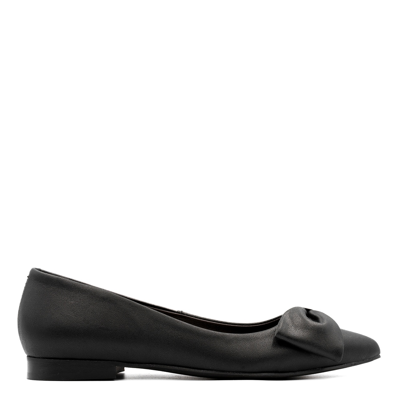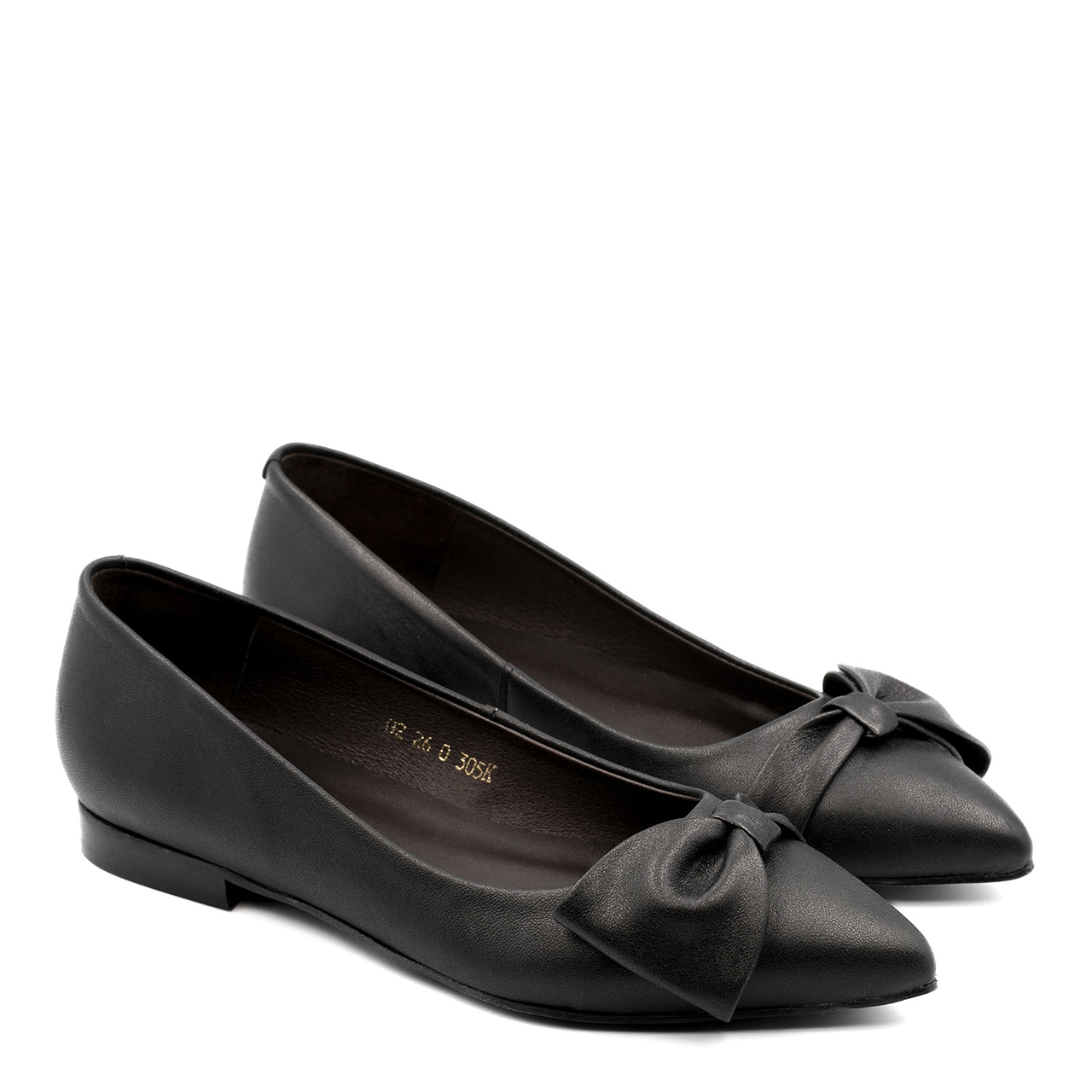 Czarne skórzane baleriny na niskim, 1,5-centymetrowym obcasie to elegancka i ponadczasowa propozycja do codziennych stylizacji. Obuwie wykonano ze skóry licowej. Smukłe noski w szpic nadają butom lekkości i szyku, a jednocześnie optycznie wysmuklają stopę. Cholewkę zdobi subtelna kokarda, która wprowadza kobiecy akcent. Wkładka w butach jest skórzana. Wymiary podawane na kartach produktów mają charakter orientacyjny i odnoszą się do rozmiaru 37.