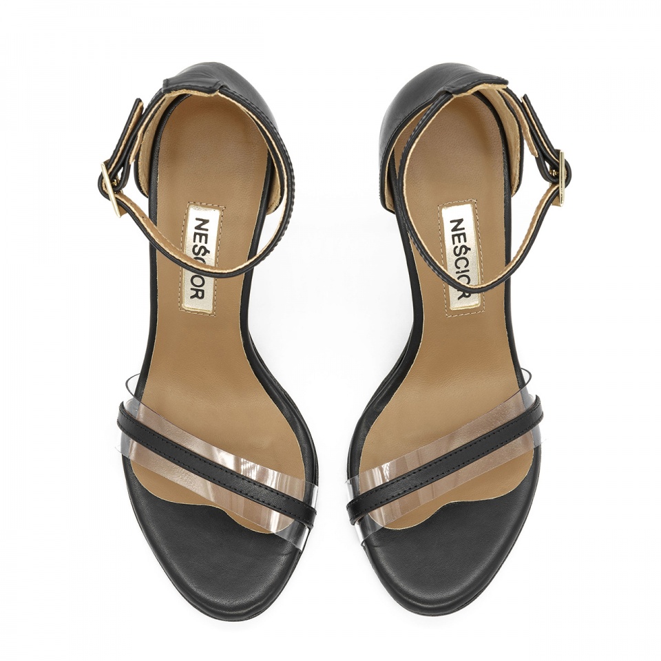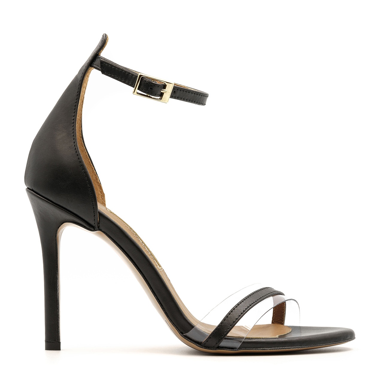 Czarne skórzane zapinane wokół kostki sandały na wysokiej 10 centymetrowej szpilce. Obuwie wykonano ze skóry licowej z połączeniem miękkiego silikonu z tworzywa. Z przodu buta wszyto pasek silikonowy połączony z paskiem skórzanym i wynosi około 2,5 cm cały pasek. Nosek sandałów w migdał. Wkładka w butach jest ze skóry naturalnej. Wymiary podawane na kartach produktów to wymiary orientacyjne i odnoszą się do rozmiaru 37.