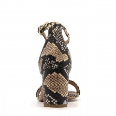 Wężowe sandały z zapięciem na kostce wykonane są z naturalnej skóry imitującej skórę węża. Z uwagi na fakturę skóry sprzedawany produkt może różnić się w nieznacznym stopniu od modelu przedstawionego na zdjęciach. Obcas w sandałach wynosi 7,5 cm. Nosek butów w migdał. Wkładki w butach są skórzane. Wymiary podawane na kartach produktów to wymiary orientacyjne i odnoszą się do rozmiaru 37.