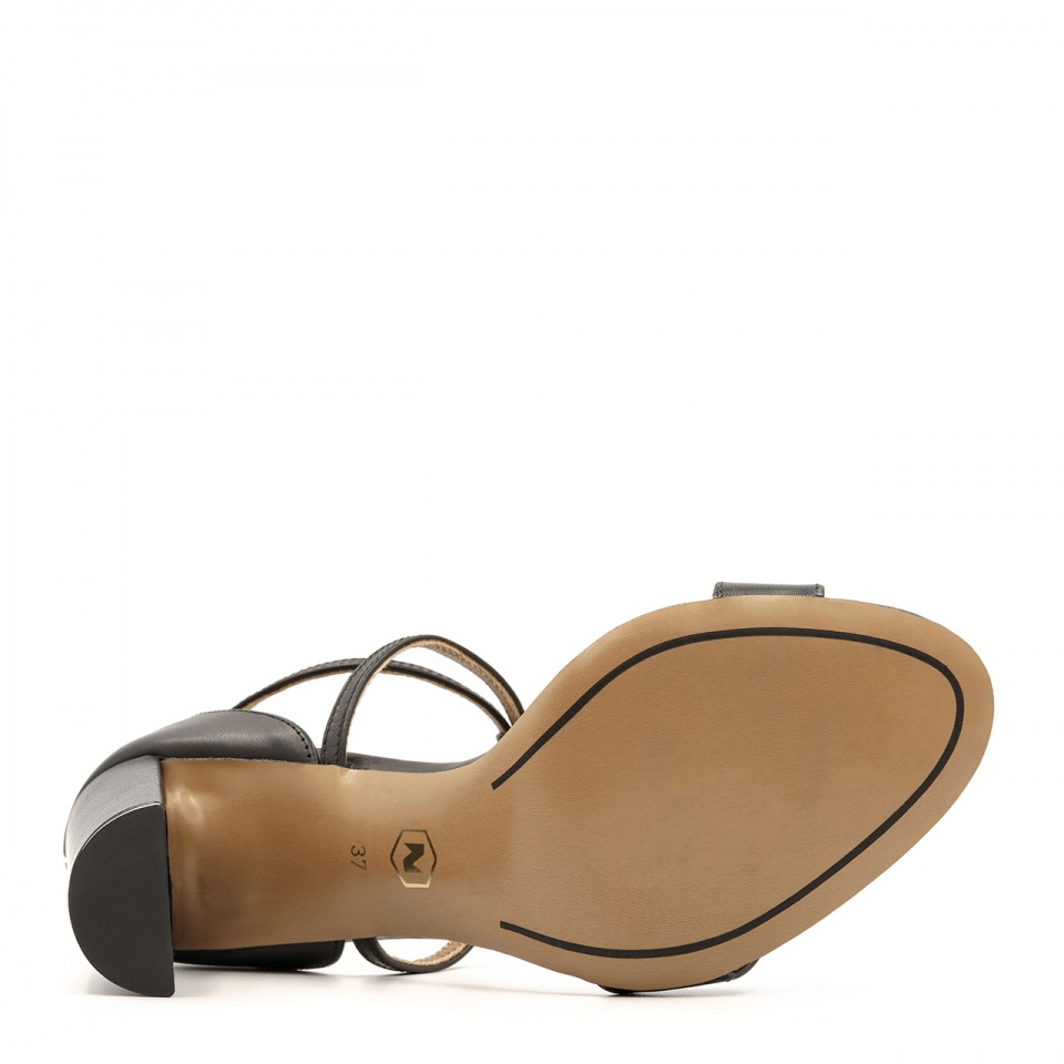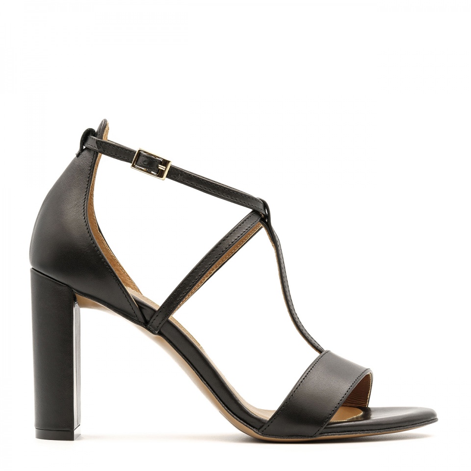 Czarne skórzane sandały na 9 centymetrowym słupku z otwartymi palcami i zakrytą piętą. Buty wykonano ze skóry naturalnej licowej. Złota klamerka łączy dwa cieniutkie, skrzyżowane paseczki, które stabilnie trzymają stopę w butach. Nosek sandałków w migdał. Wkładki w butach są skórzane. Wymiary podawane na kartach produktów to wymiary orientacyjne i odnoszą się do rozmiaru 37.