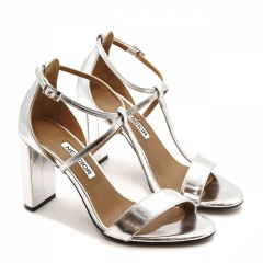 Srebrne skórzane sandały na 9 centymetrowym słupku z otwartymi palcami i zakrytą piętą. Buty wykonano ze skóry naturalnej. Srebrna klamerka łączy dwa cieniutkie, skrzyżowane paseczki, które stabilnie trzymają stopę w butach. Nosek sandałków w migdał. Wkładki w butach są skórzane. Wymiary podawane na kartach produktów to wymiary orientacyjne i odnoszą się do rozmiaru 37.